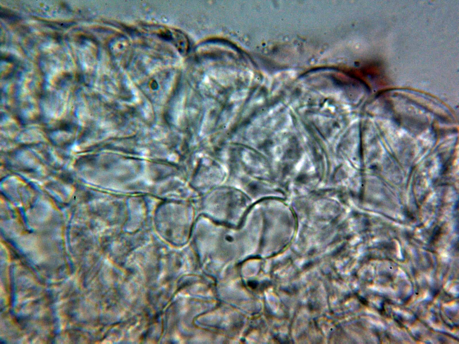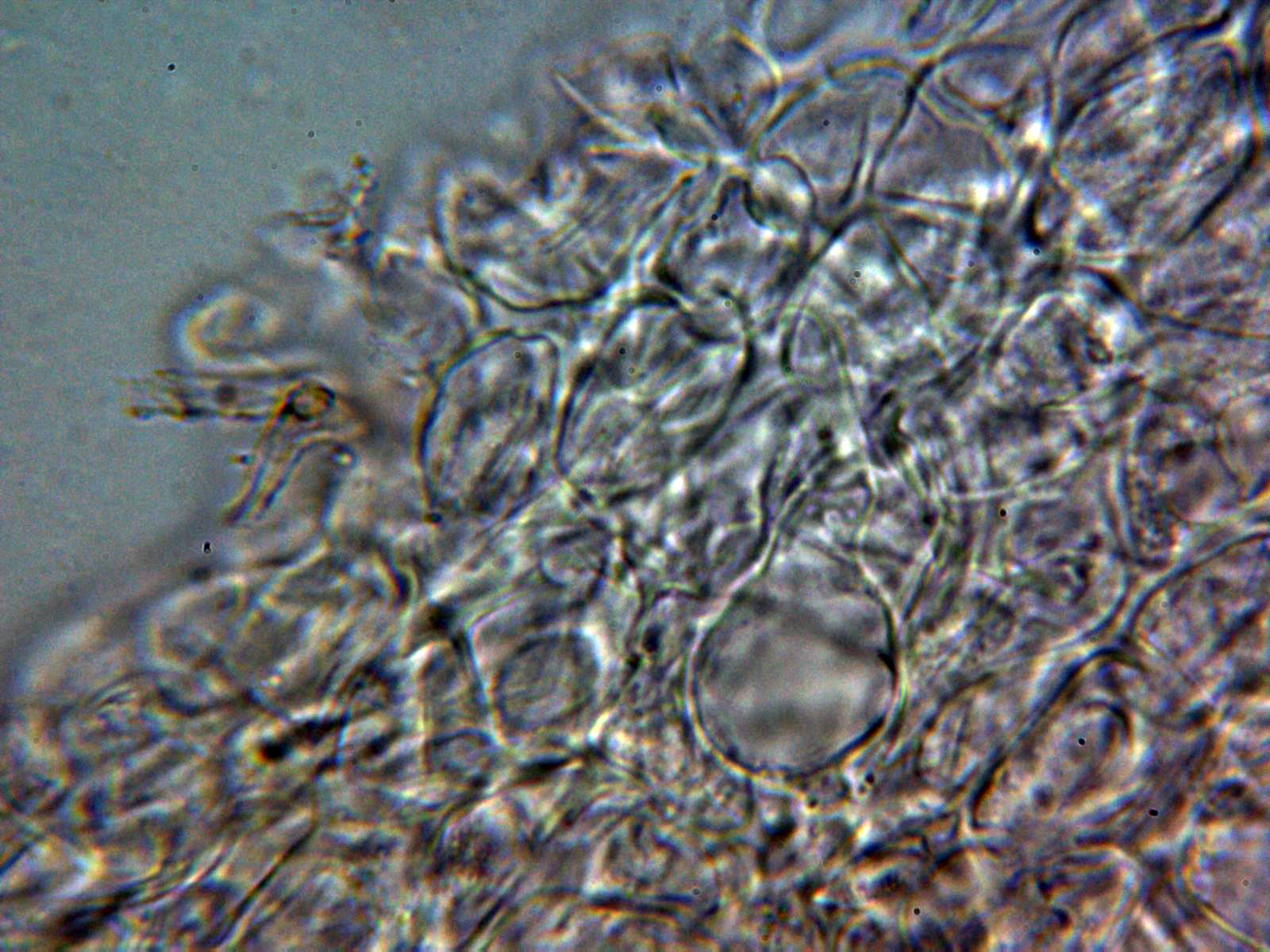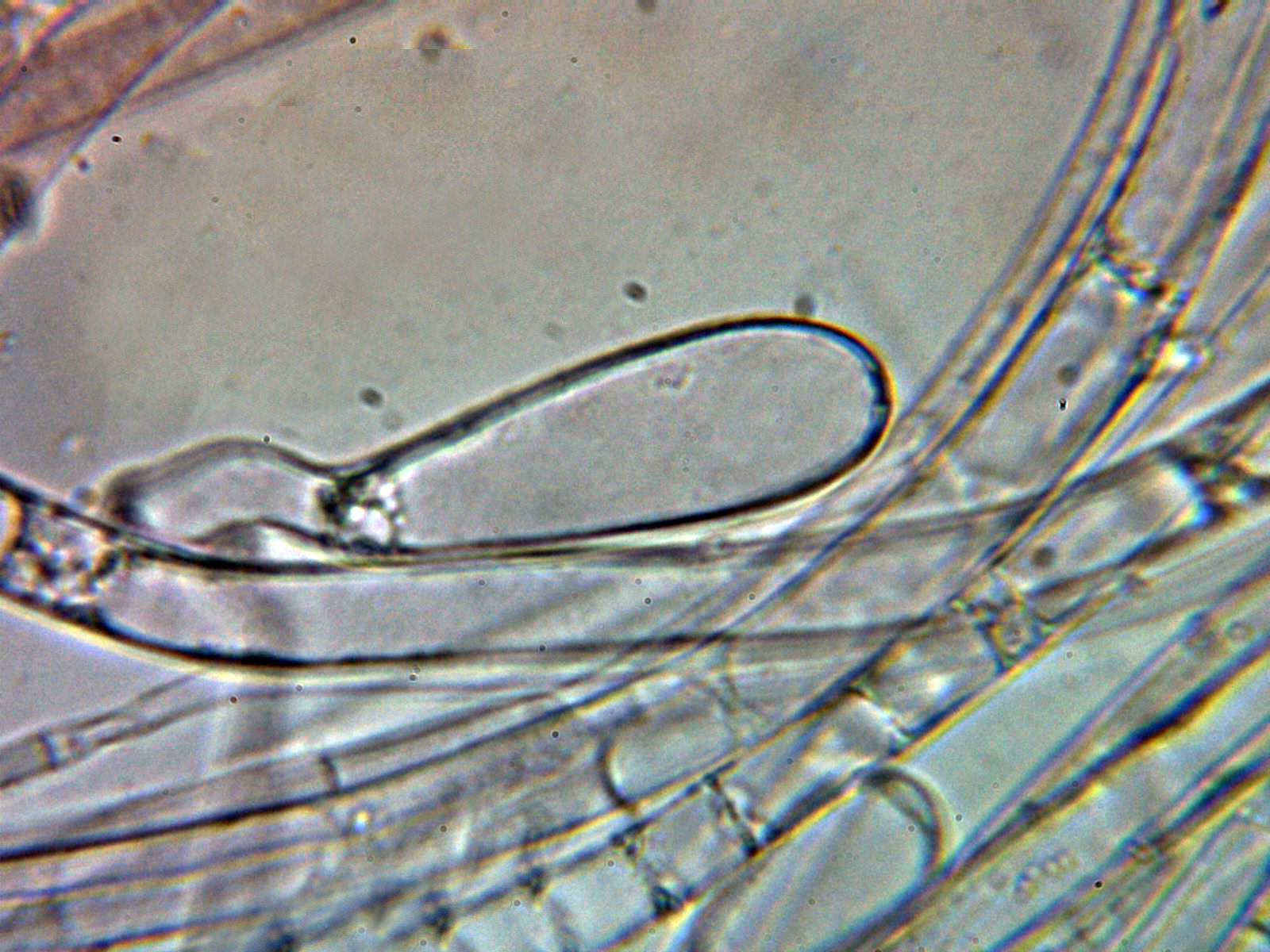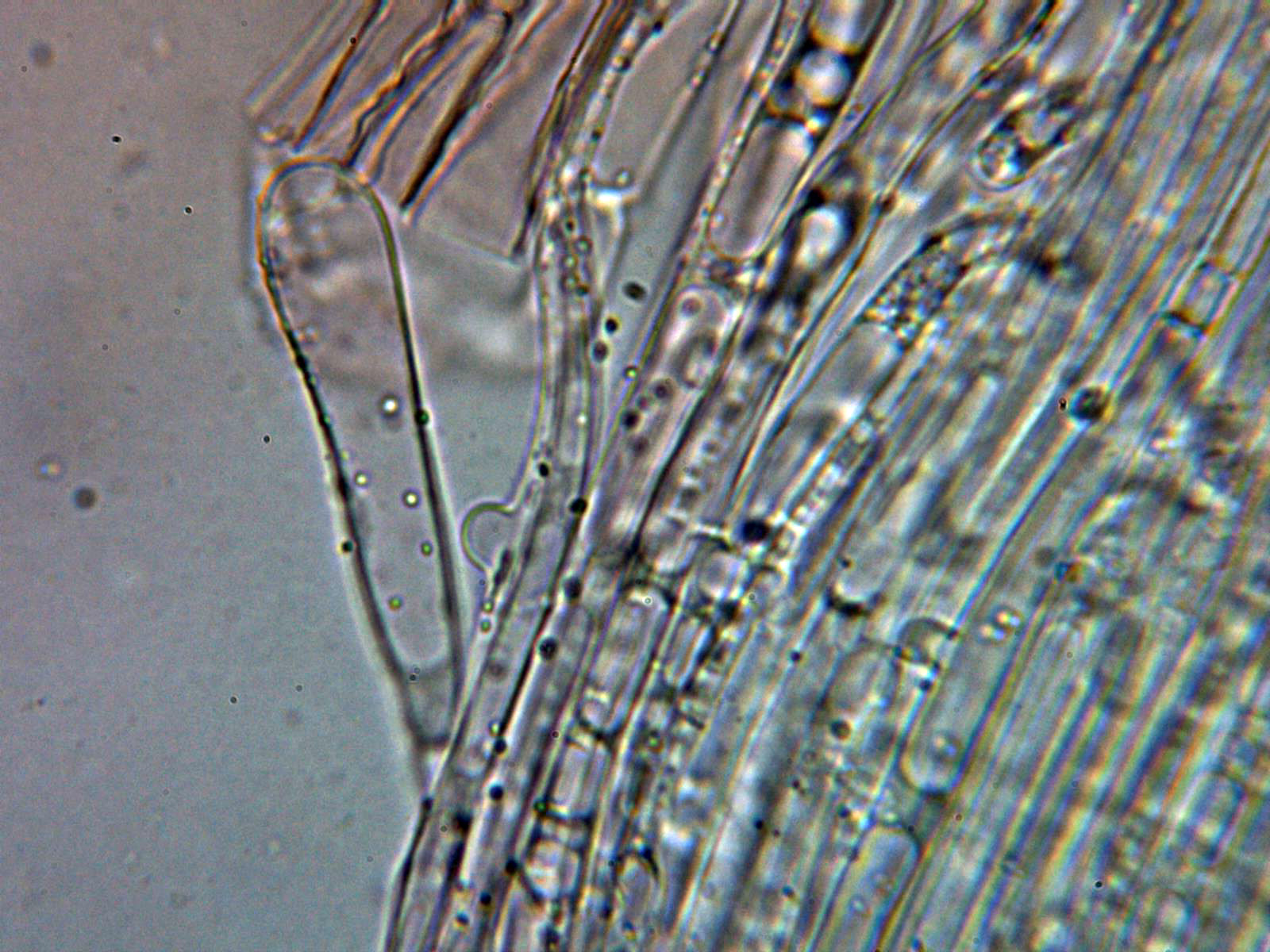 Queilocistidios muy abundantes, entre piriformes y cilíndricos con tenue pigmento en su interior y unas medidas de 29.1 - 45.2 × 11.8 - 18 µm.