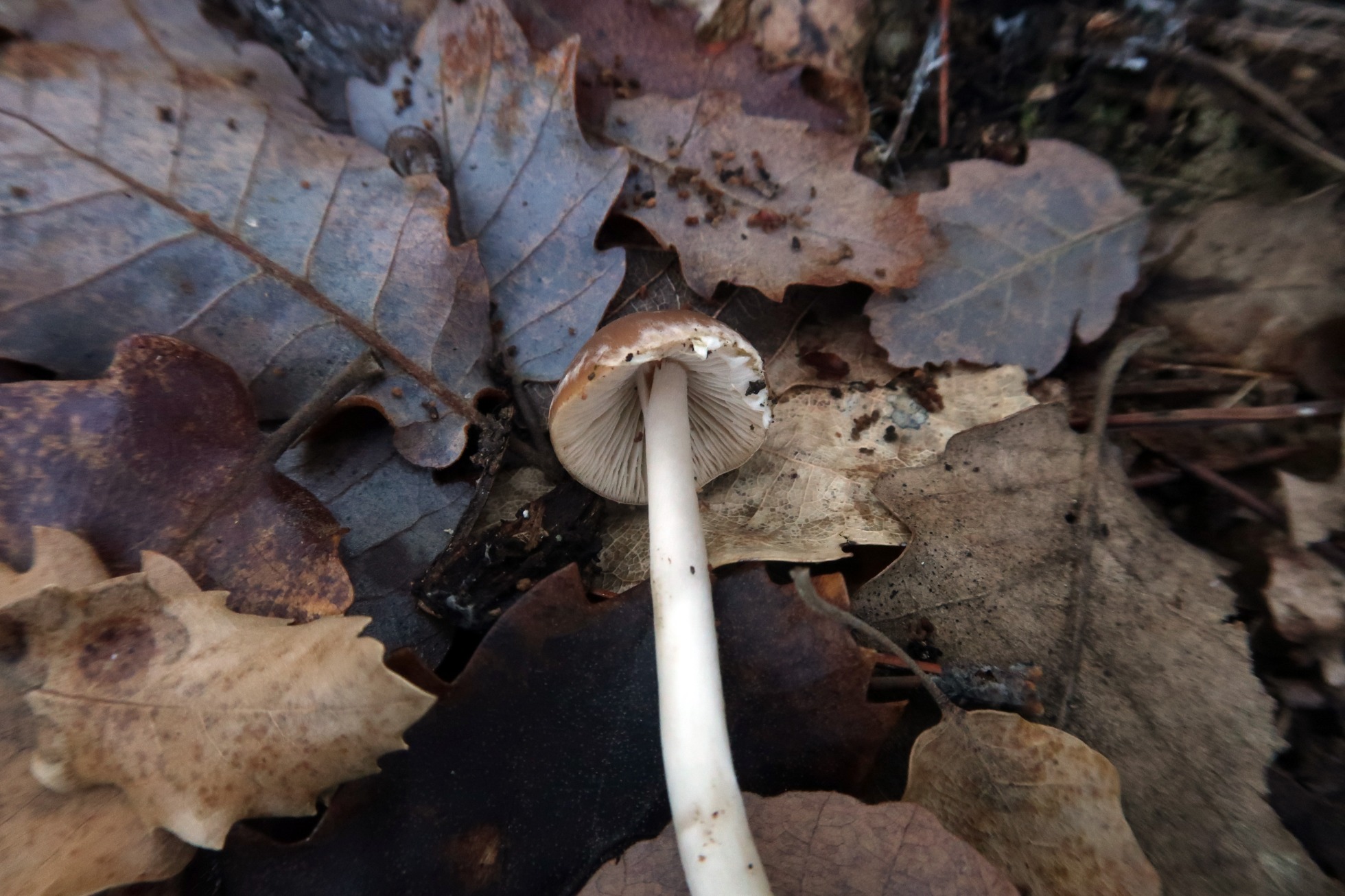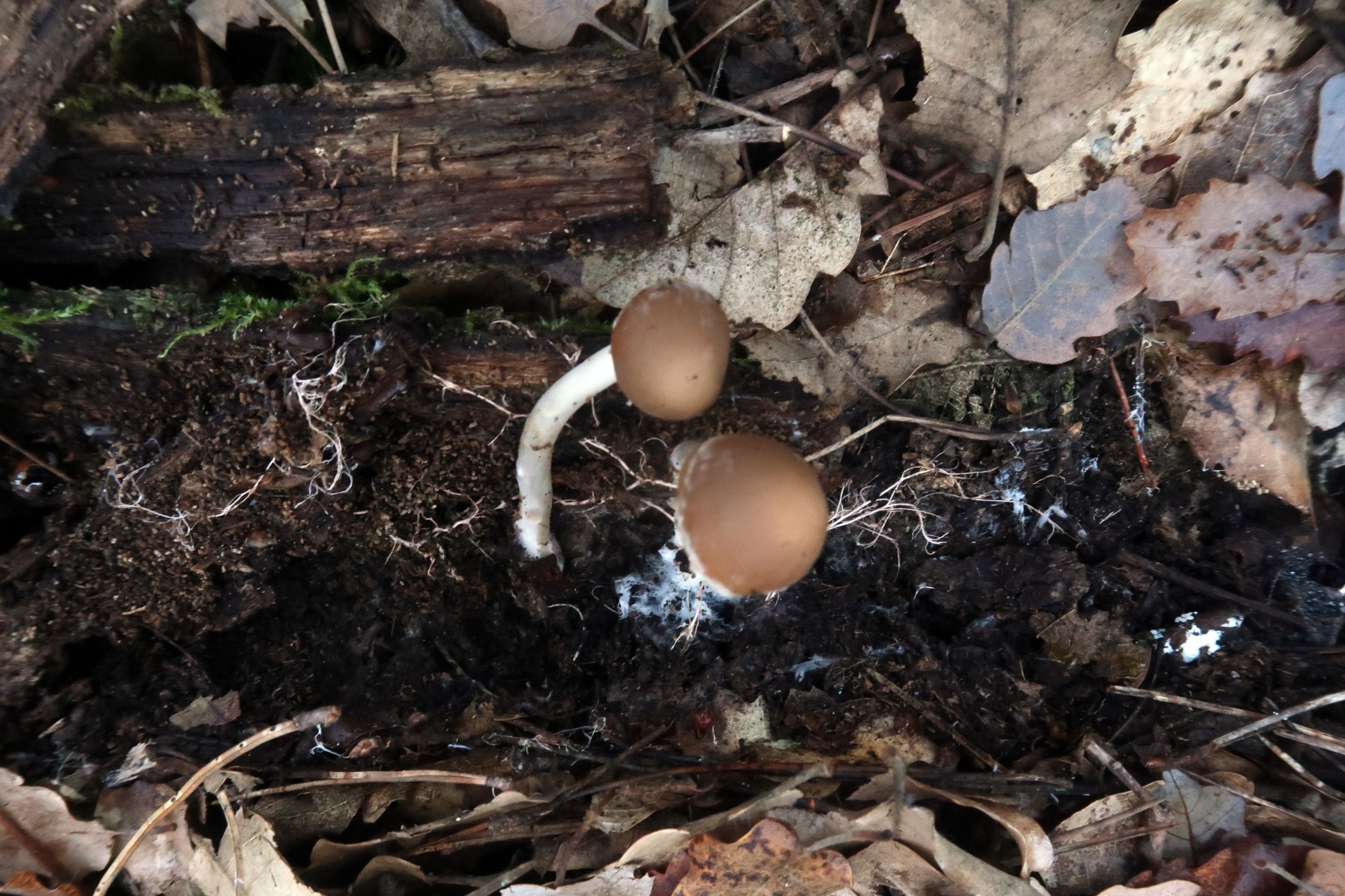 Un par de pequeñas Psathyrellas en estado primordial fotografiadas el 7 de Noviembre pasado brotando bajo robles y sobre restos leñosos del suelo: