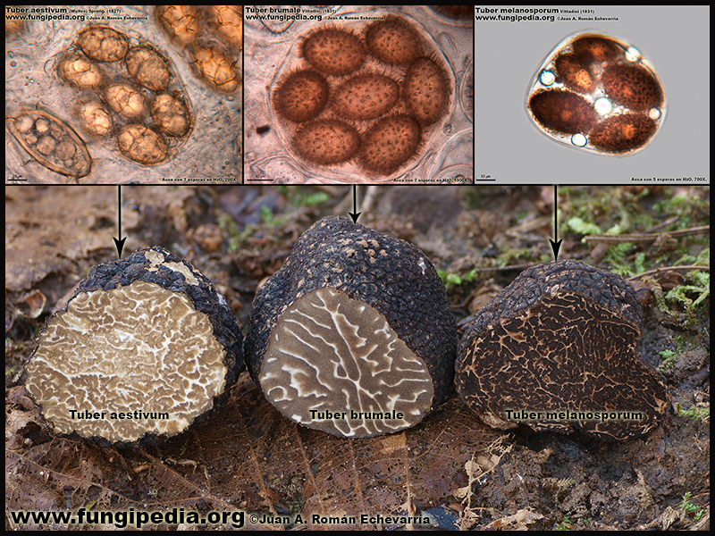 Comparativa de Tuber aestivum, Tuber brumale, Tuber melanosporum. Microscopy.