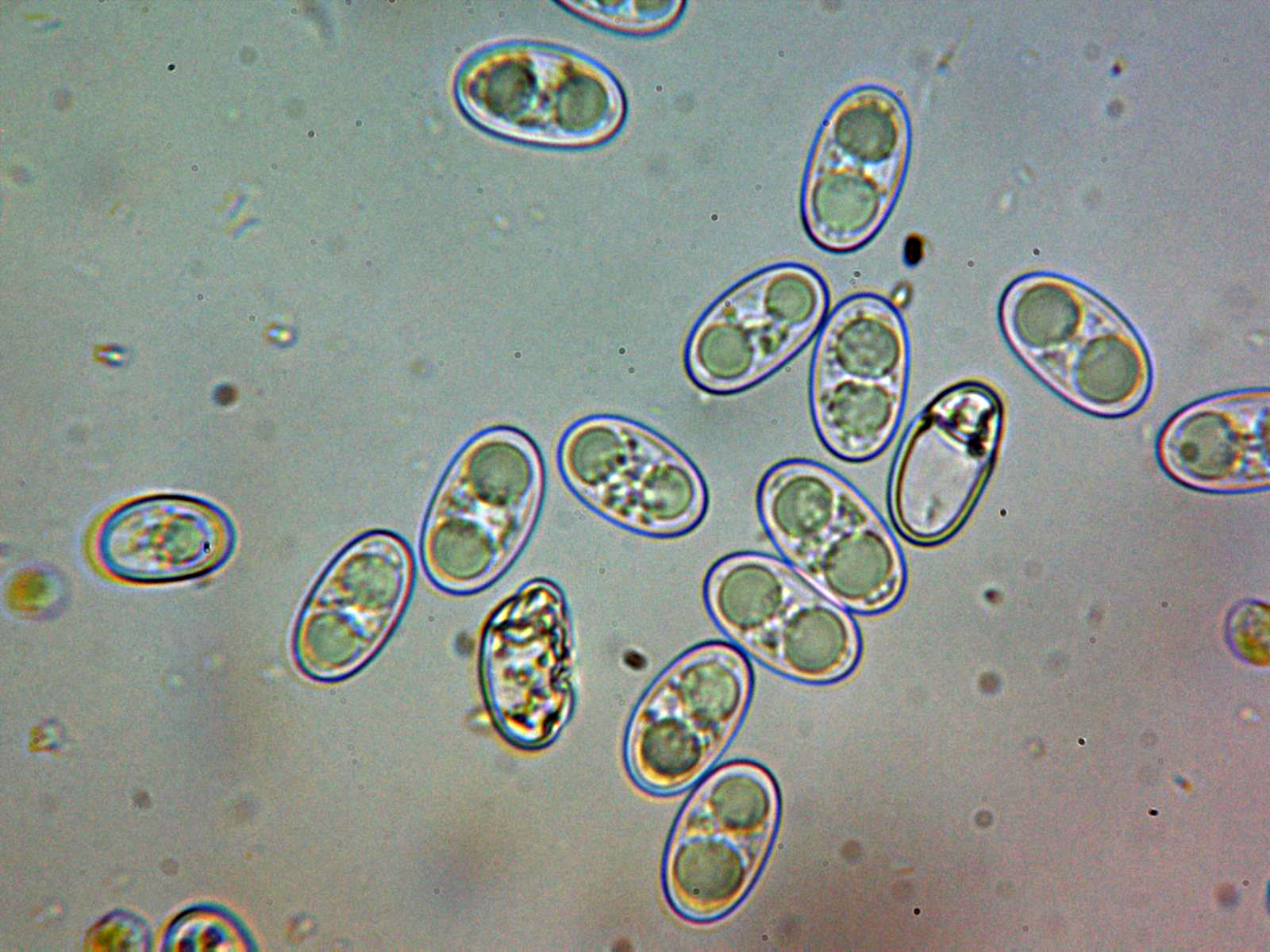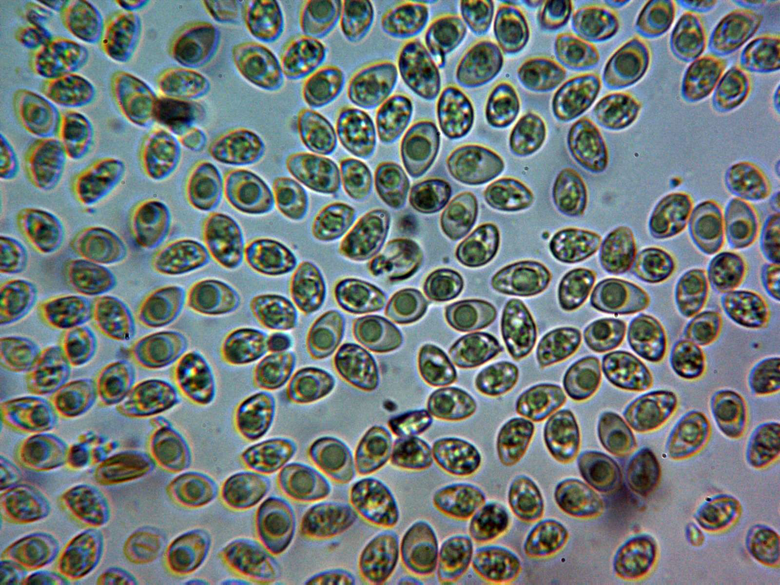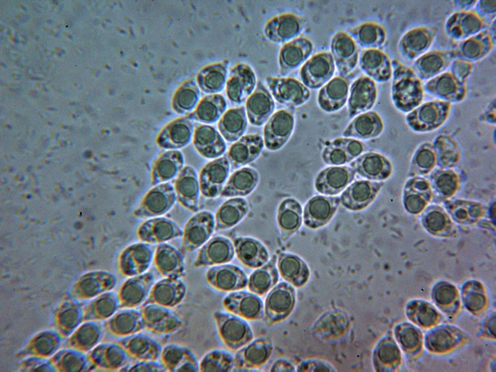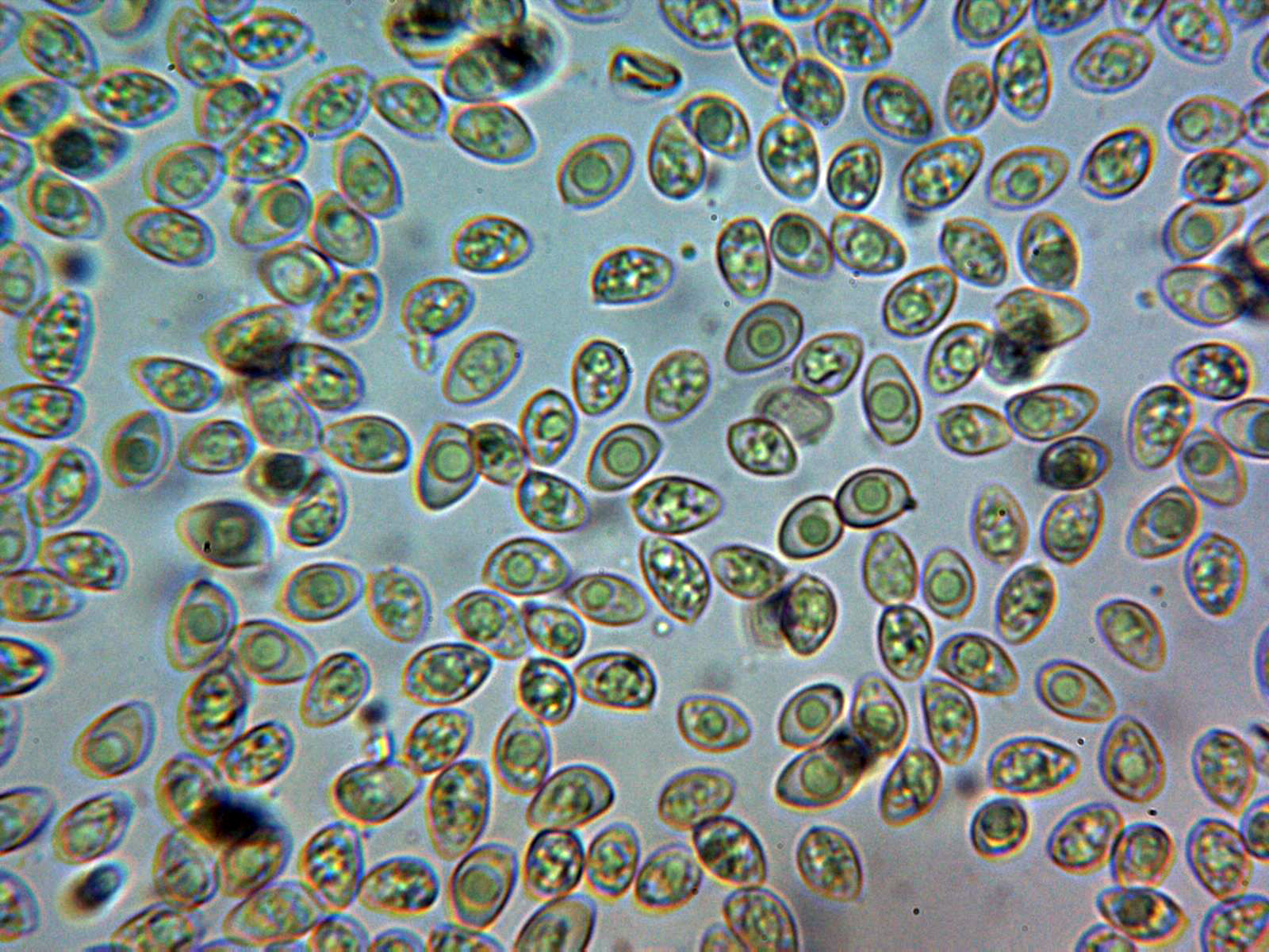 Las esporas amigdaliodes, con una marcada apícula y una gran gota lípida en su interior: