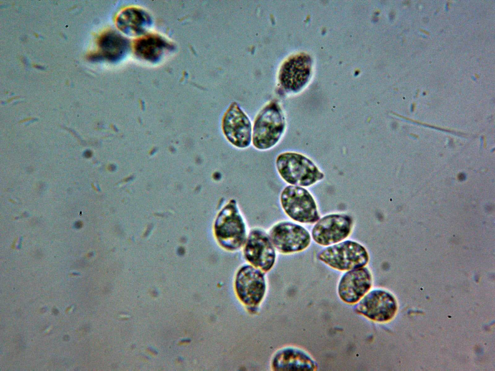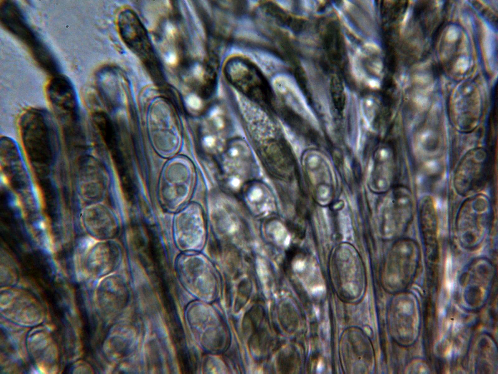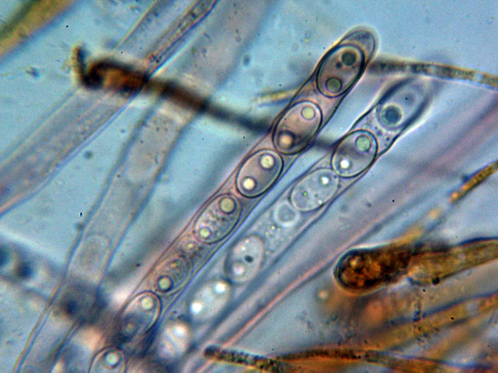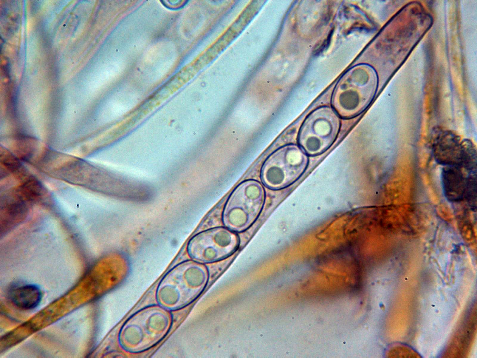 Las esporas amigdaliodes, con una marcada apícula y una gran gota lípida en su interior: