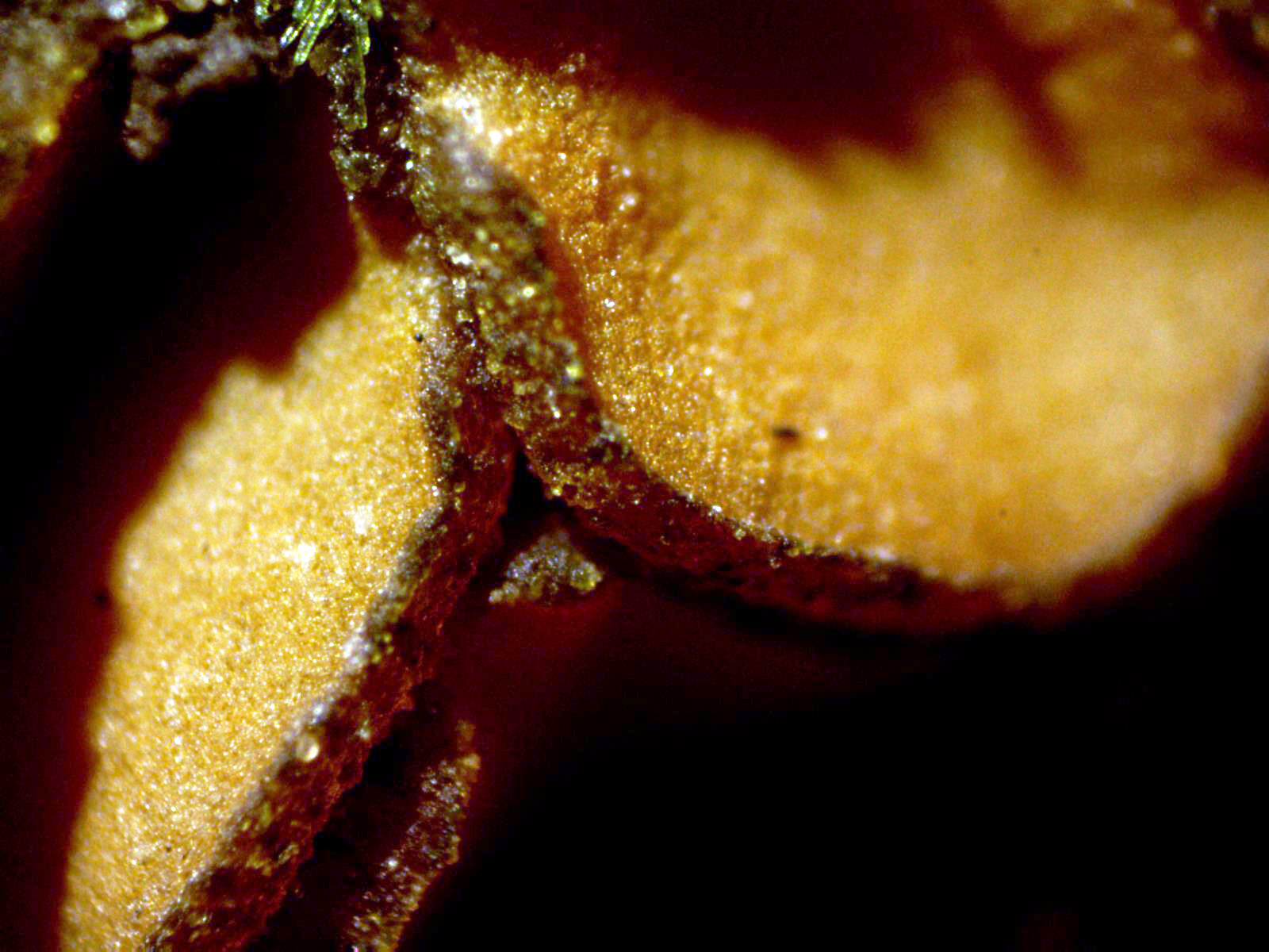 Paráfisis fuertemente pigmentadas que le confieren su color característico: