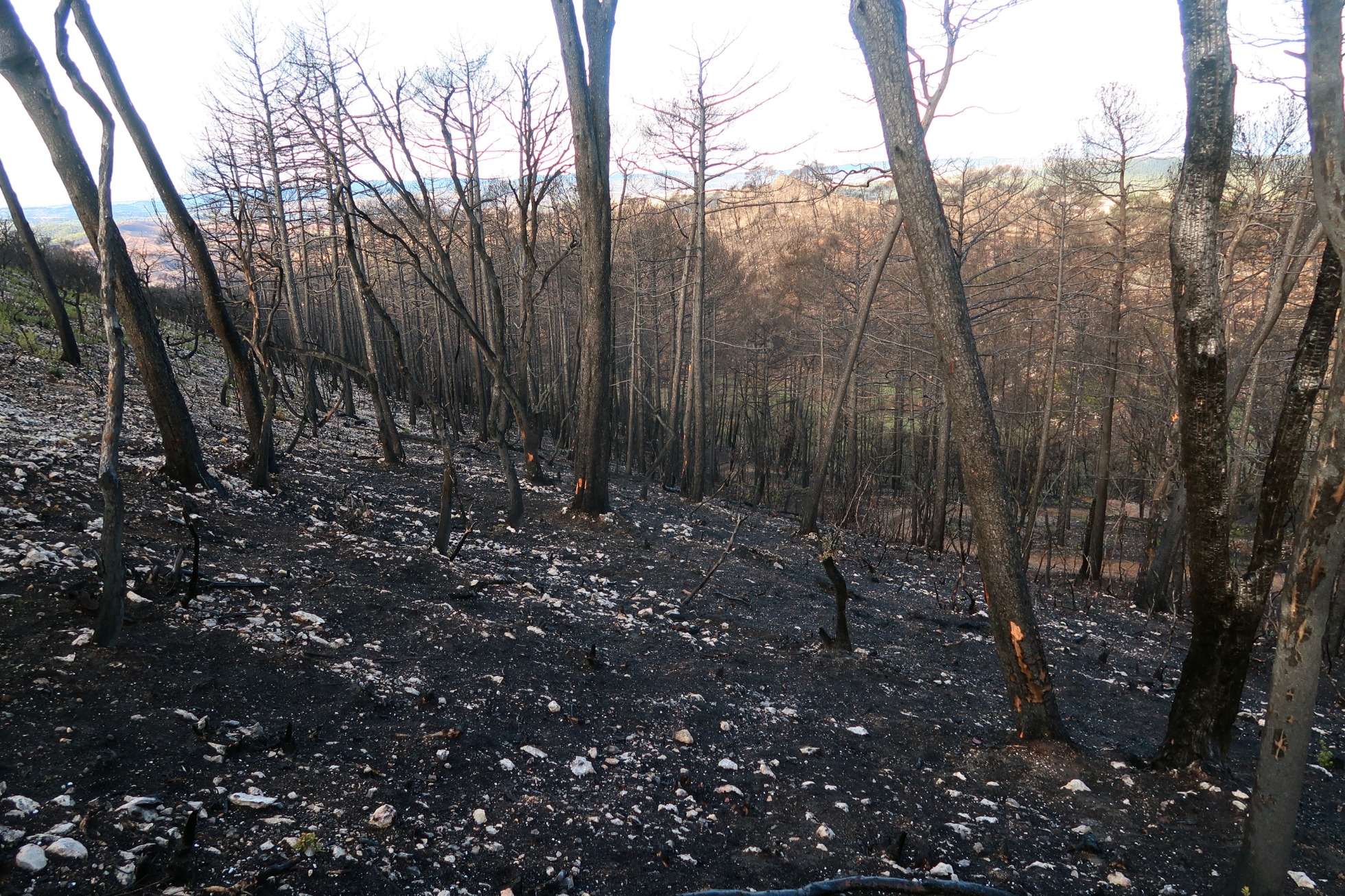 El pasado sábado (día de Navidad) decidí visitar de nuevo un bosque quemado, este bosque víctima del devastador incendio del verano pasado, esta vez lo hice unos cuantos quilómetros mas allá de mi primera visita veinte días antes, al llegar al lugar escogido me encontré con esto, un paisaje verdaderamente desolador: