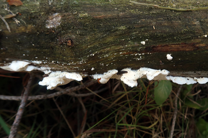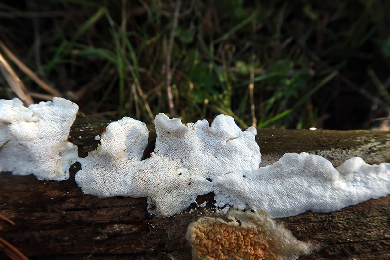 Un Polyporal poroide blanco sobre la superficie de un tronco de Pinus del suelo y brotando por encima de unos ejemplares de Leucogyrophana mollusca.