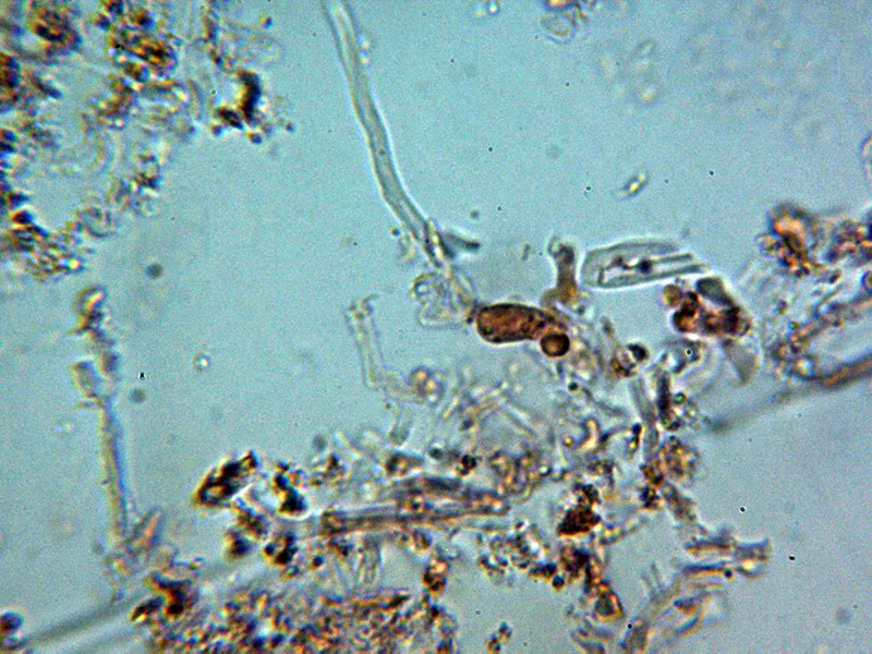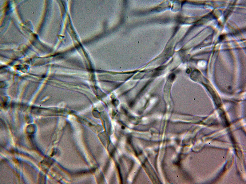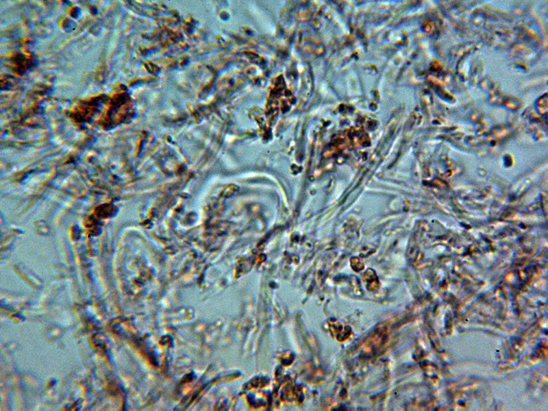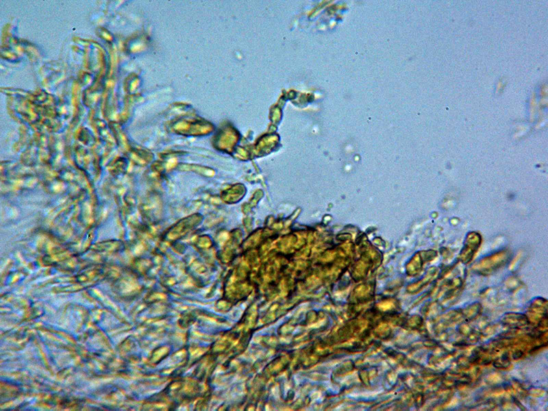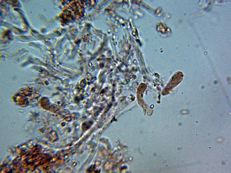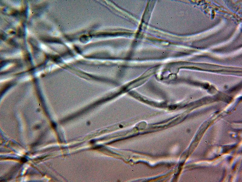 Sistema hifal aparentemente monomítico, con hifas generativas provistas de fíbulas gruesas, con una anchura de entre 2,4 y 4,3 micras, con material incrustante que se colorea con Rojo Congo y se disuelve en KOH, las hifas en KOH hialinas.