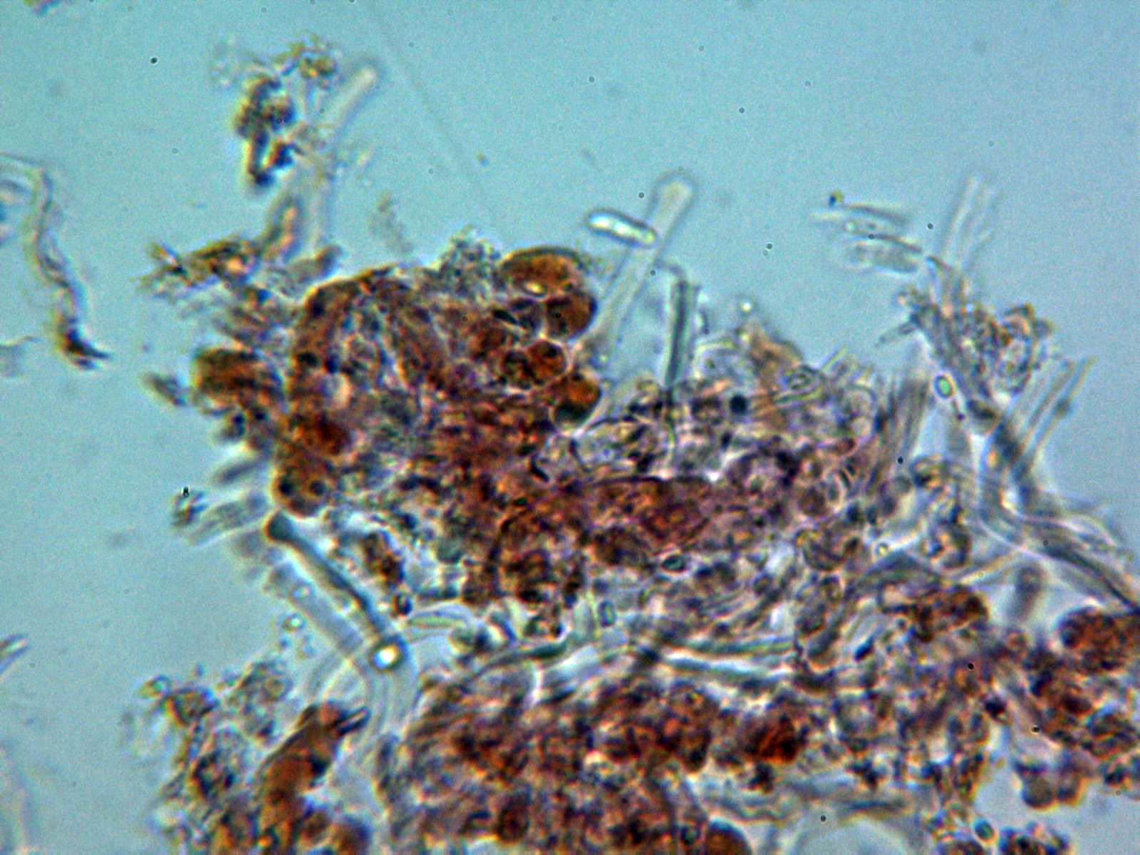 Basidios escasos en las muestras y de difícil observación, clavados, ensanchados en el ápice y con unas medidas de 12,5 - 16,5 × 3,9 - 5,7 µm.