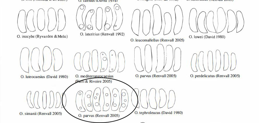 Nota: Determinación hecha siguiendo las Claves del Monográfico de Ryvarden, según el mismo documento el autor cita para el Oligoporus parvus unos cistidios de pequeño tamaño no observados en las muestras, aunque el mismo Ryvarden admite que son raros y pueden no estar presentes, en el mismo documento se cita para el Oligoporus parvus una anchura de las hifas de 2.5-4 μm. unas medidas para los basidios de 13-21 x 4-6 μm., y unas medidas esporales de 5.3-7 (-8) x 1.5-2 μm., todas estas medidas acordes con las del presente estudio, añado una imágen del documento de Ryvarden con la morfología esporal: