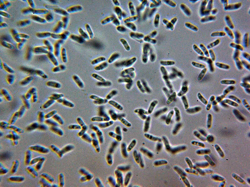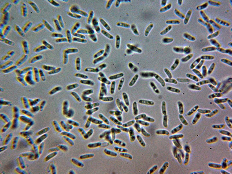 Basidiosporas cilíndricas, de paredes delgadas, algunas algo alantoides, con discreta apícula lateral, con contenido de 2 o más gotitas lipídicas oscuras en su interior y unas medidas en agua de:
