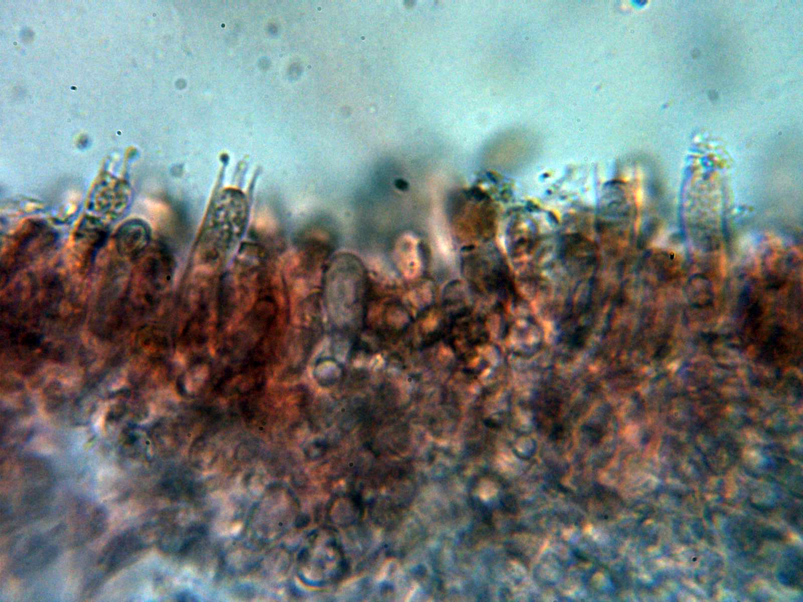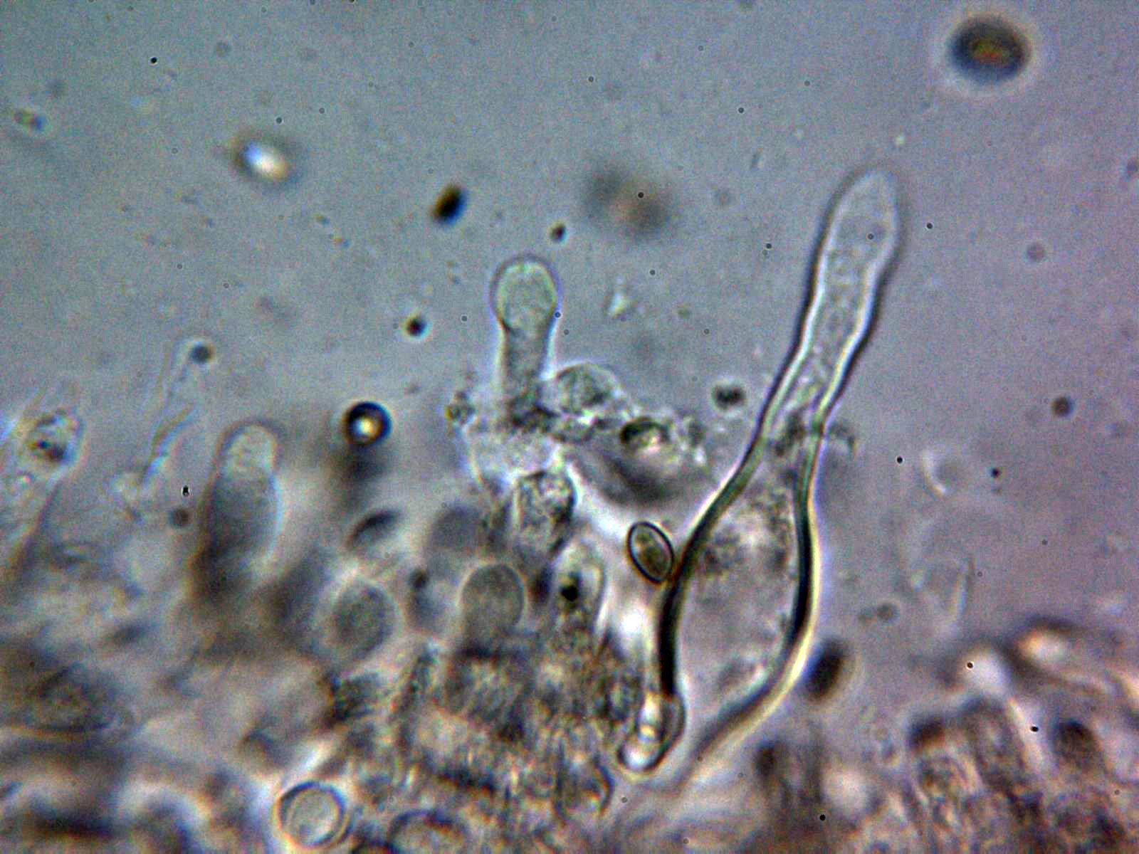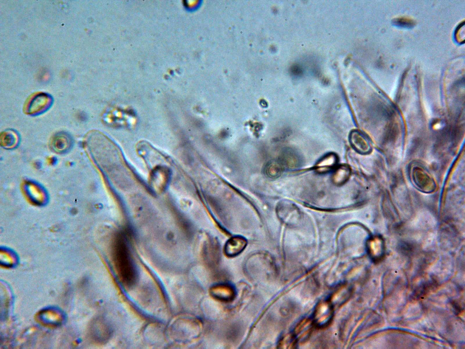 Queilocistidios abundantes en la arista laminar con una morfología muy parecida a los pleurocistidios pero de una longitud algo inferior, estos queilocistidios con unas medidas de (36.8) 38.9 - 47 (59.5) × (10.4) 10.6 - 11.7 (13.3) µm.