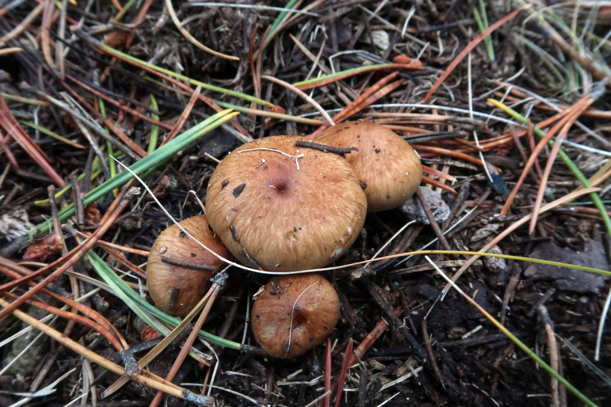 Un grupito de 4 ejemplares con un sombrero de color marrón pardo claro con el centro más oscuro y algo rojizo, sin tonos amarillentos, con disposición de fibrillas radiales y un discreto pero apuntado mamelón en su centro.