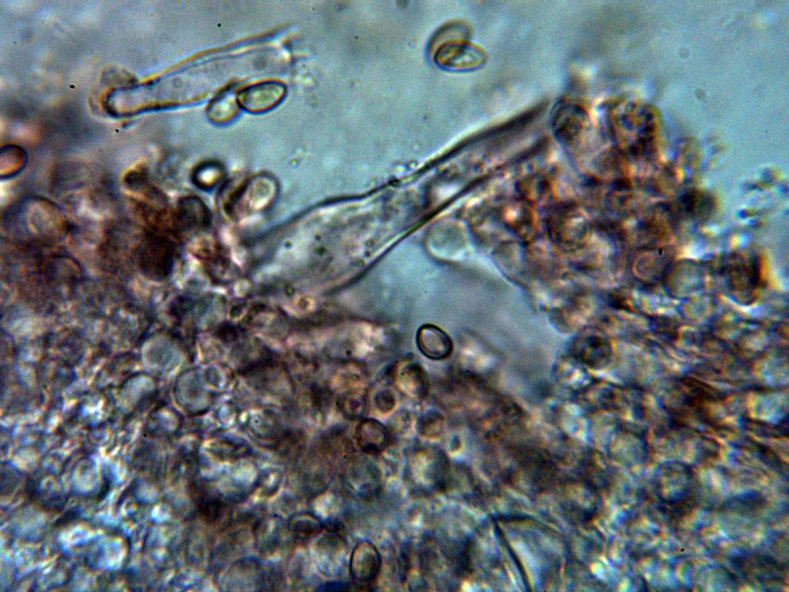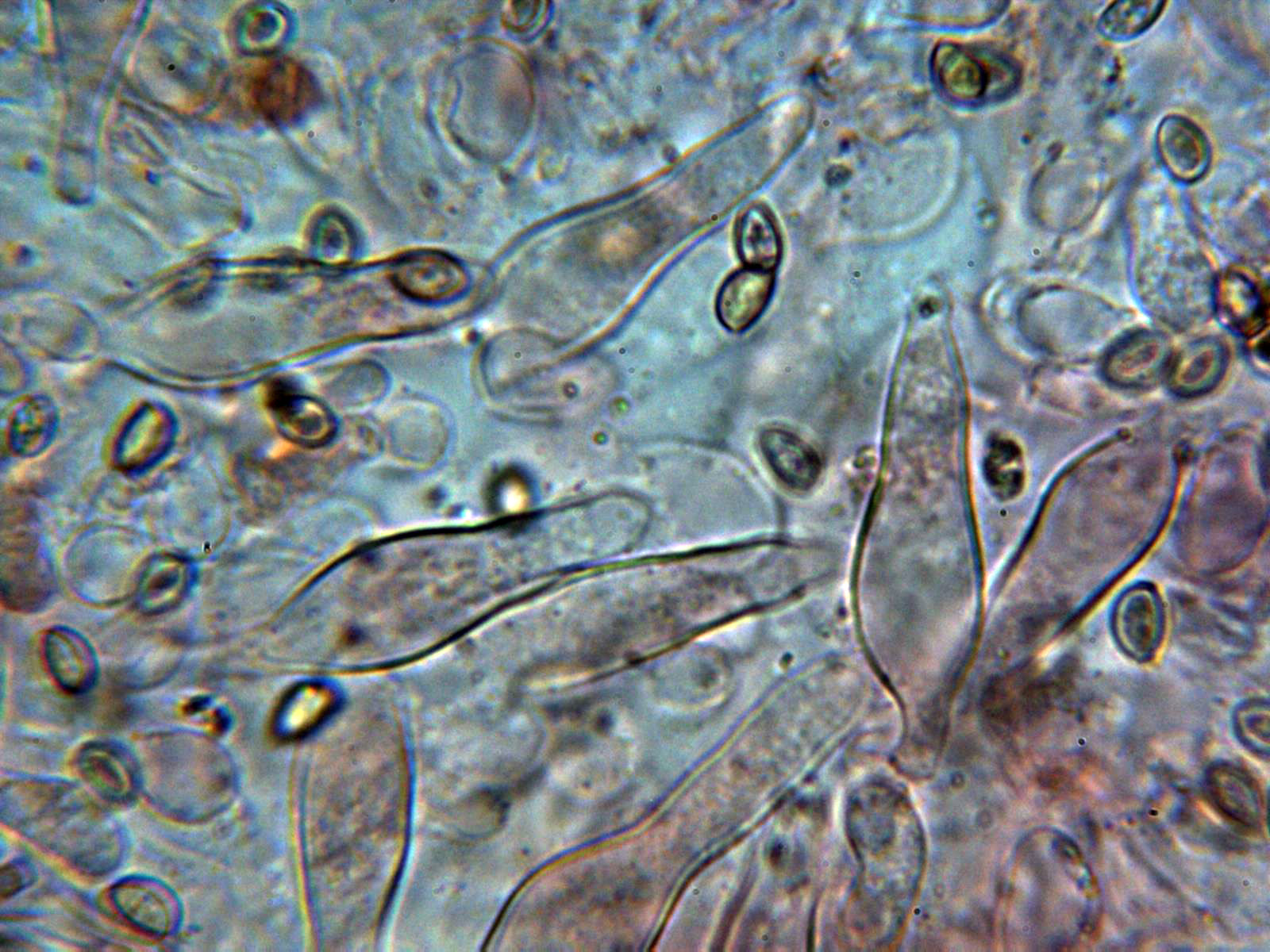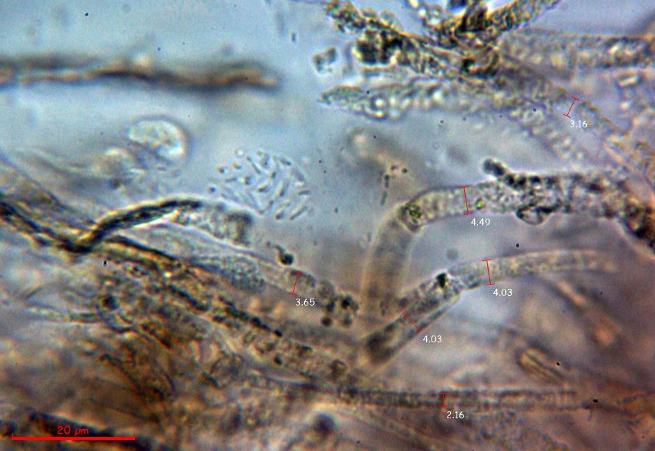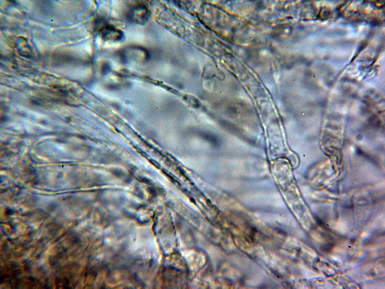Aunque la superficie del sombrero parecía seca, en la microscopía se pueden observar sus hifas separadas por gelificación, con incrustaciones y pigmento amarillento: