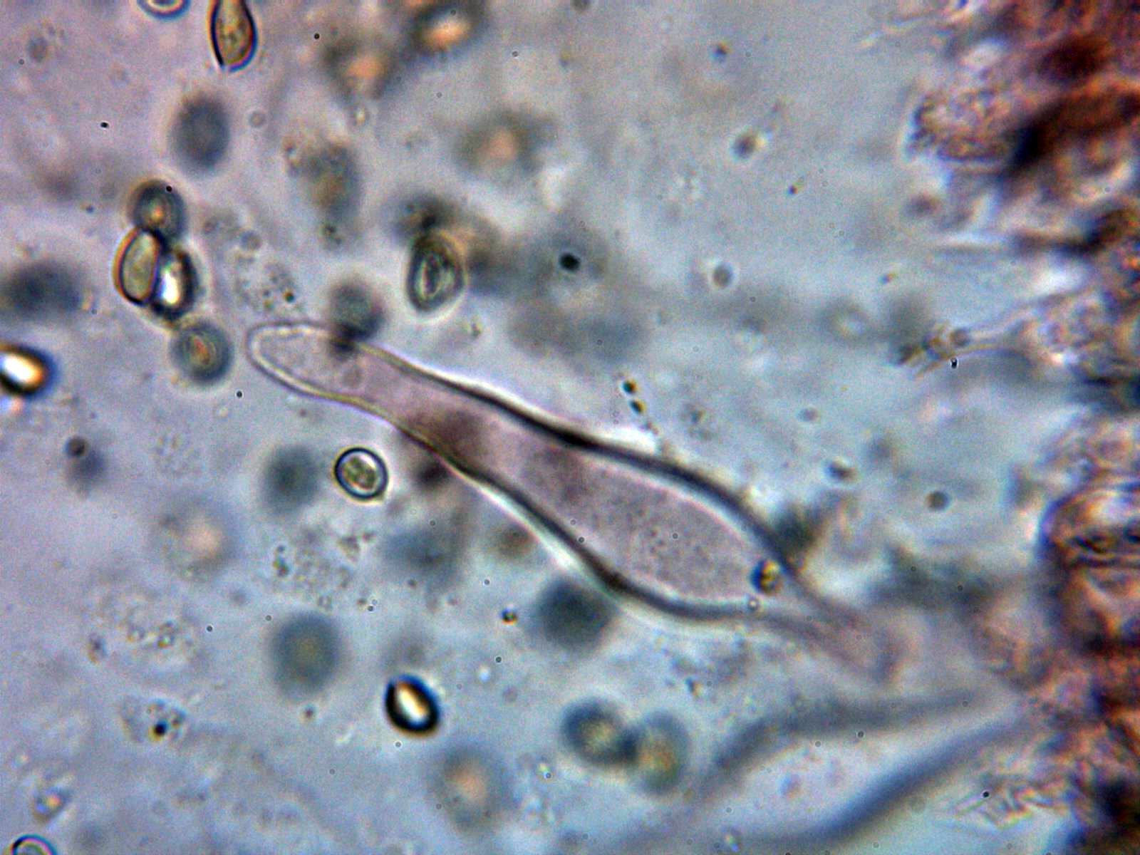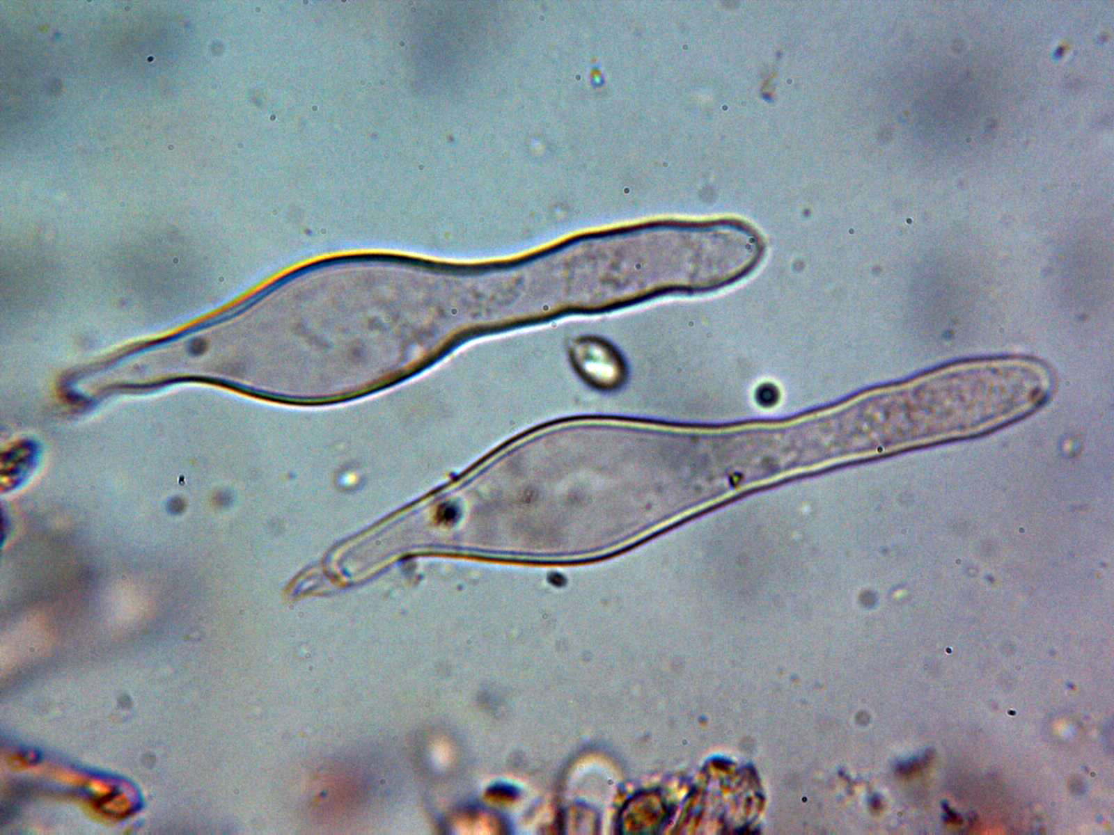 Abundantes pleurocistidios lageniformes con unas medidas de 59.2 - 71 × 11.9 - 13.4 µm.