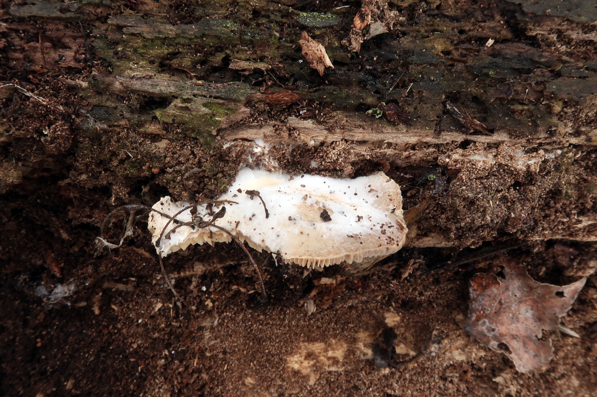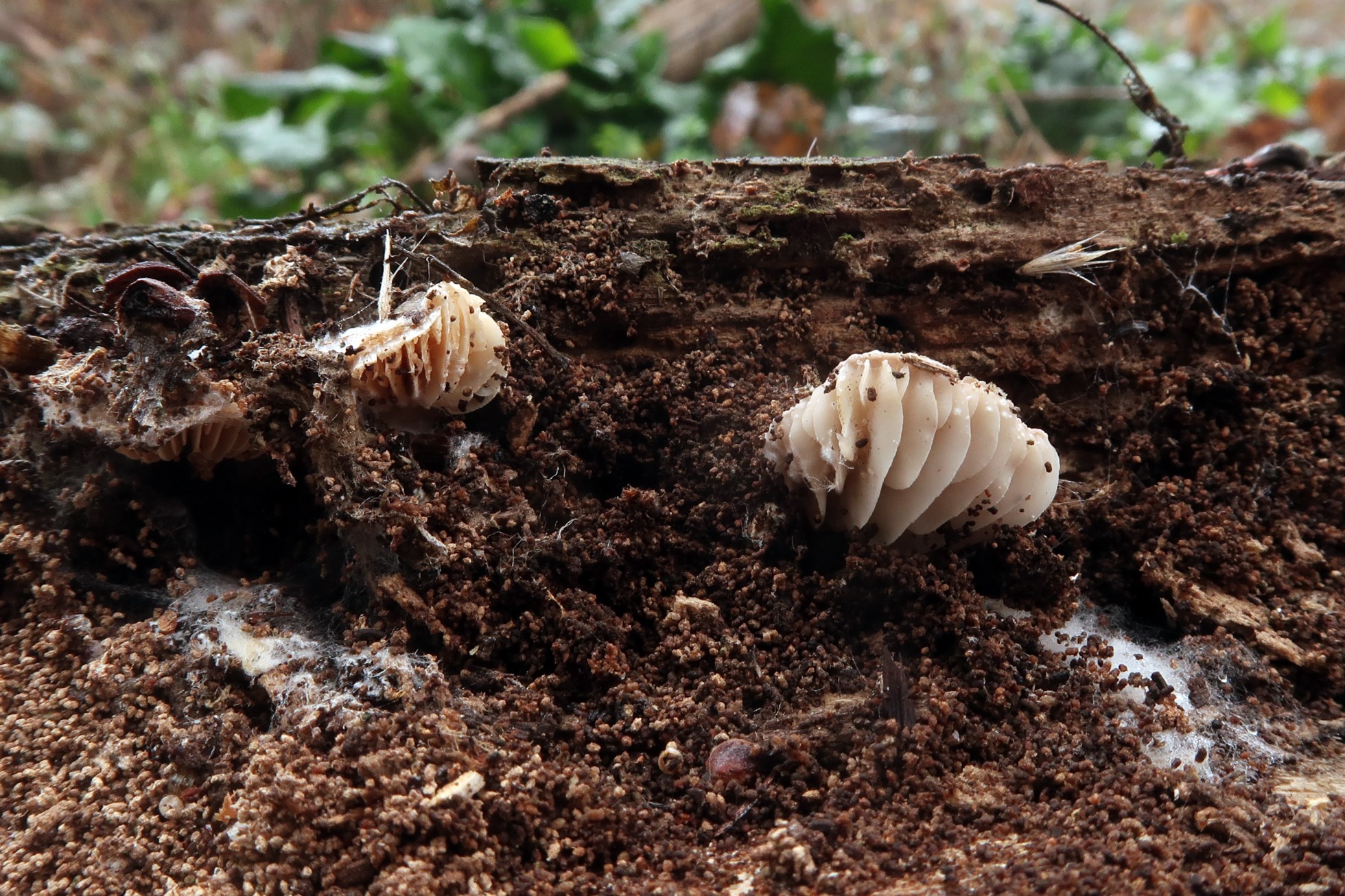 Muy cerca del anterior y en el interior de un tronco muy degradado, al desmenuzarlo me encuentro con una Hohenbuehelia de aspecto Cyphelloide, la: