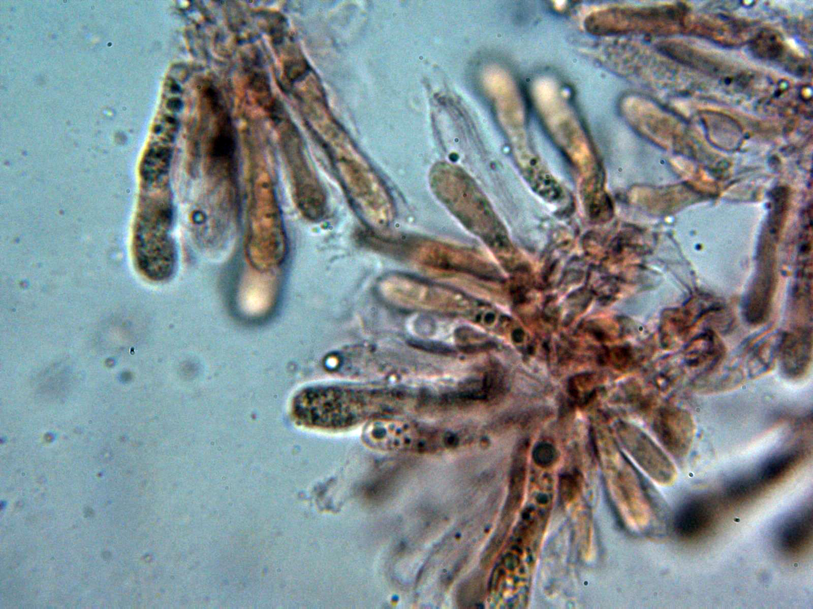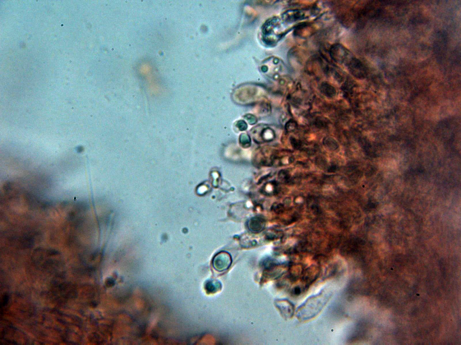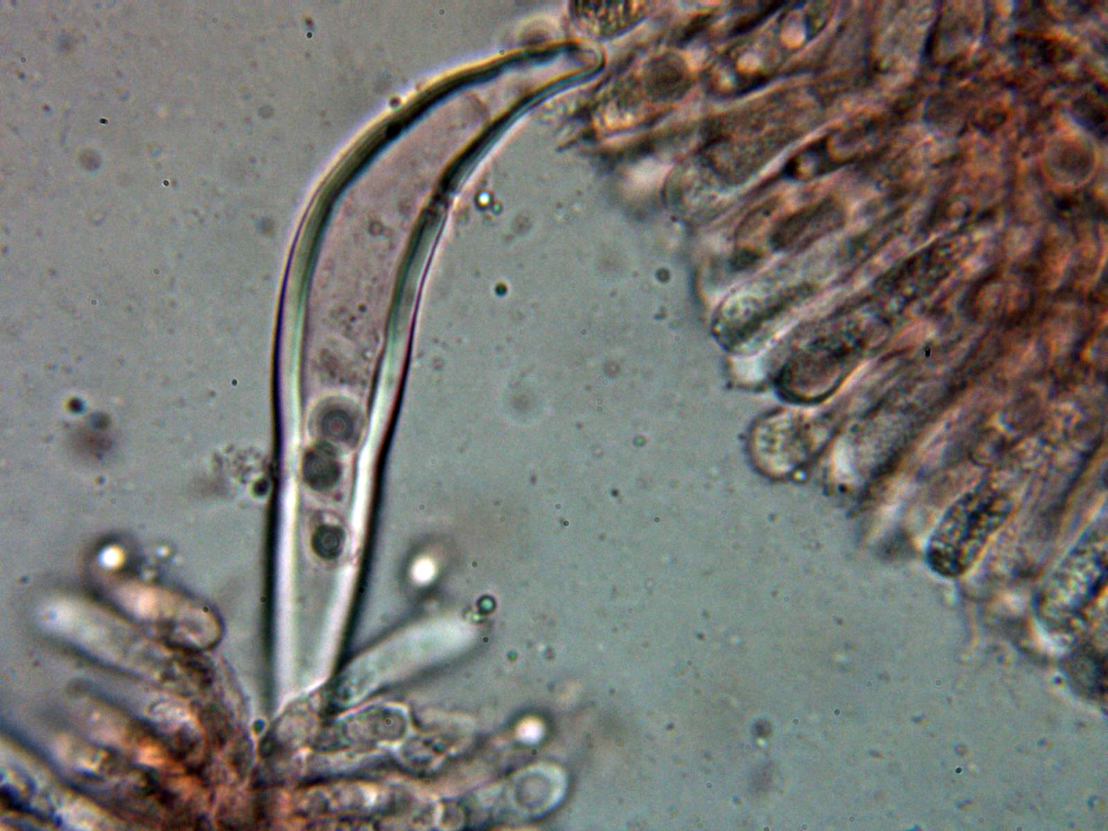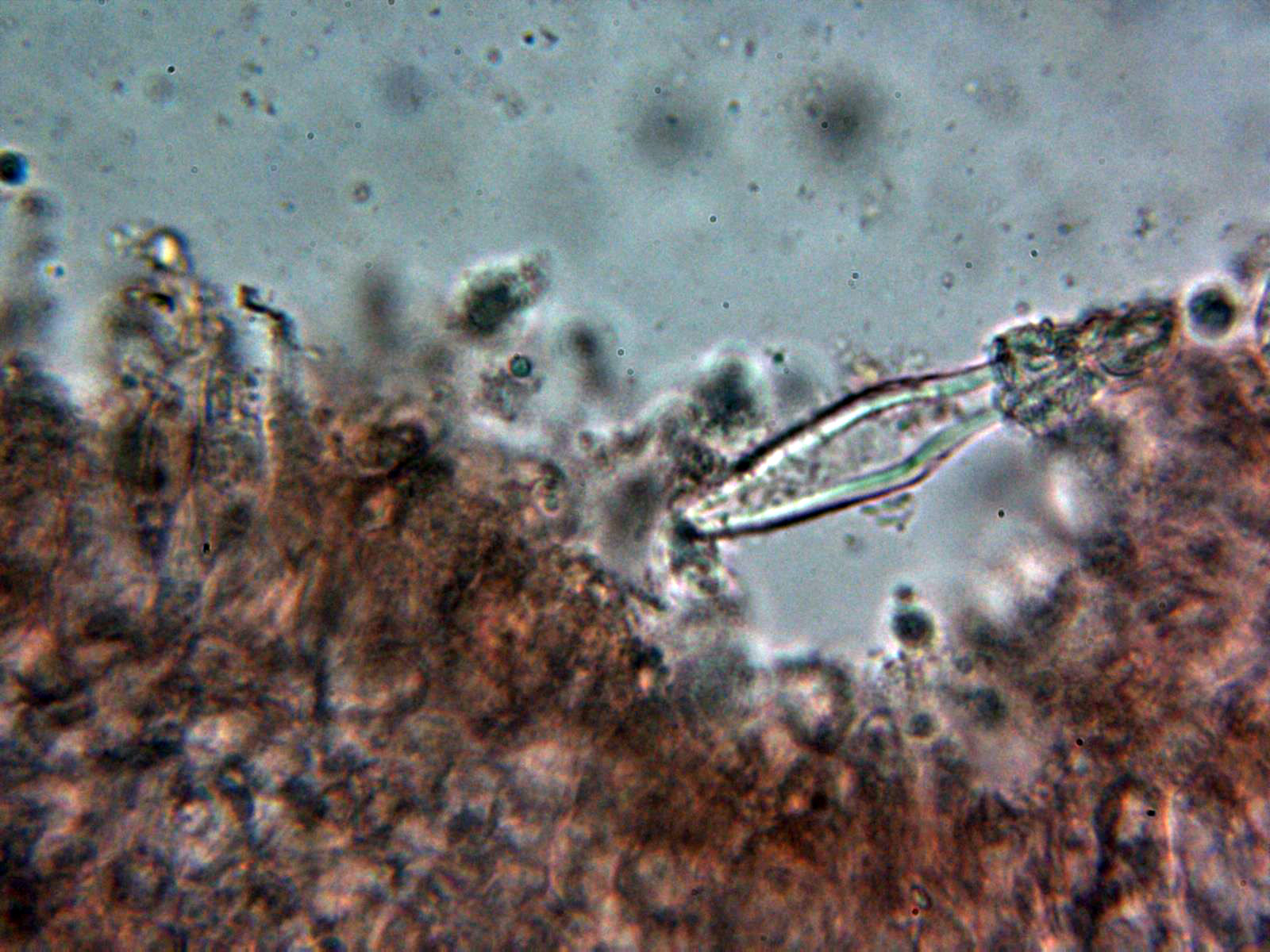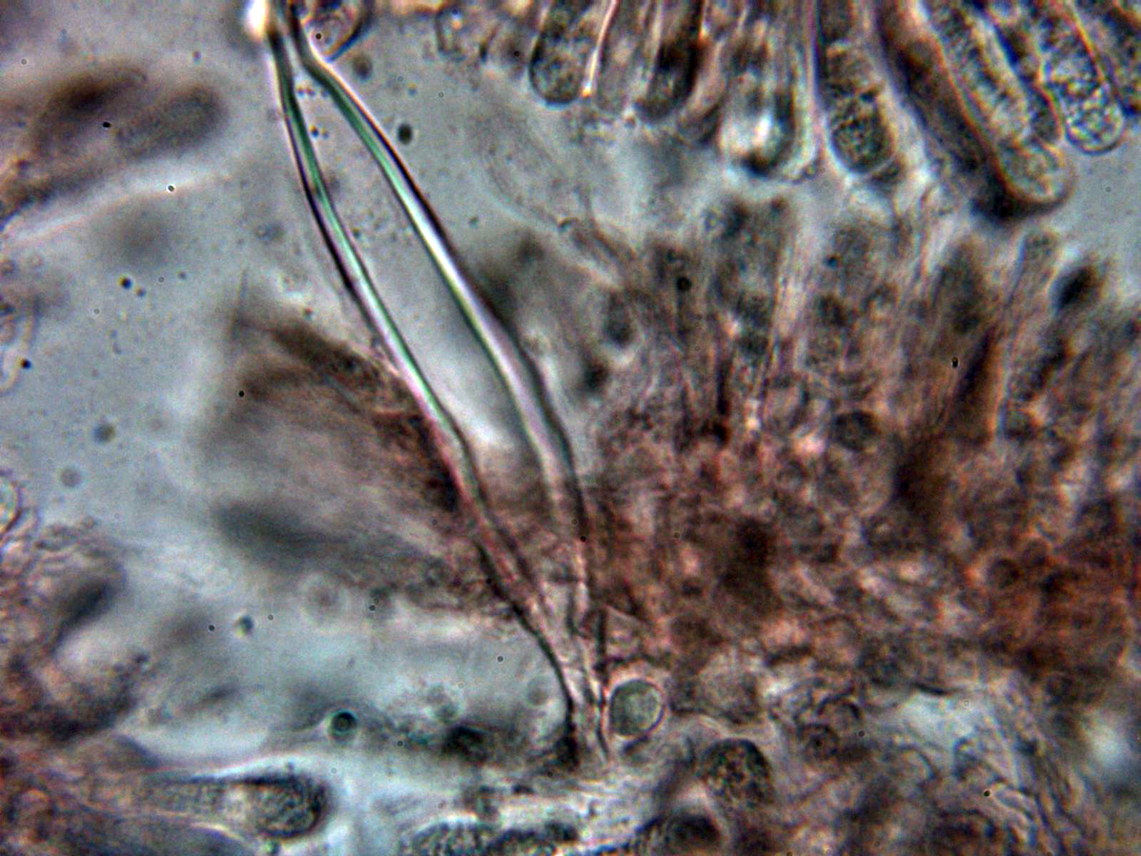 Pleurocistidios metuloides muy abundantes en la cara laminar, con unas medidas de 69.3 - 78 × 10.8 - 13.2 µm.