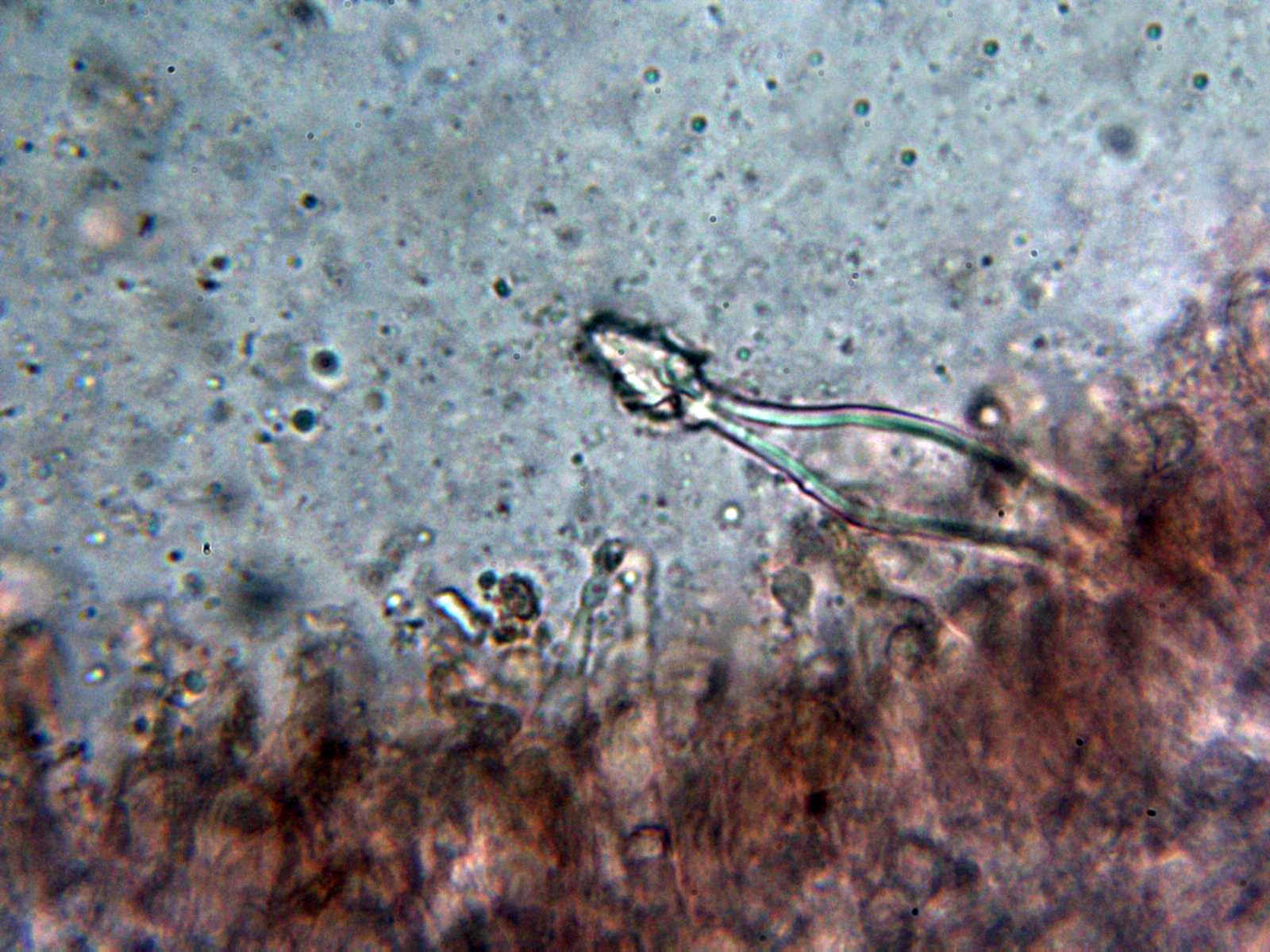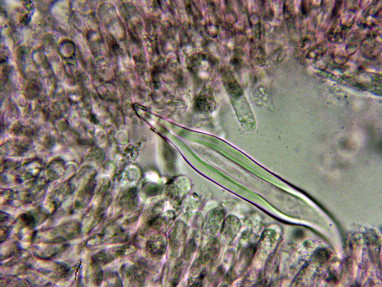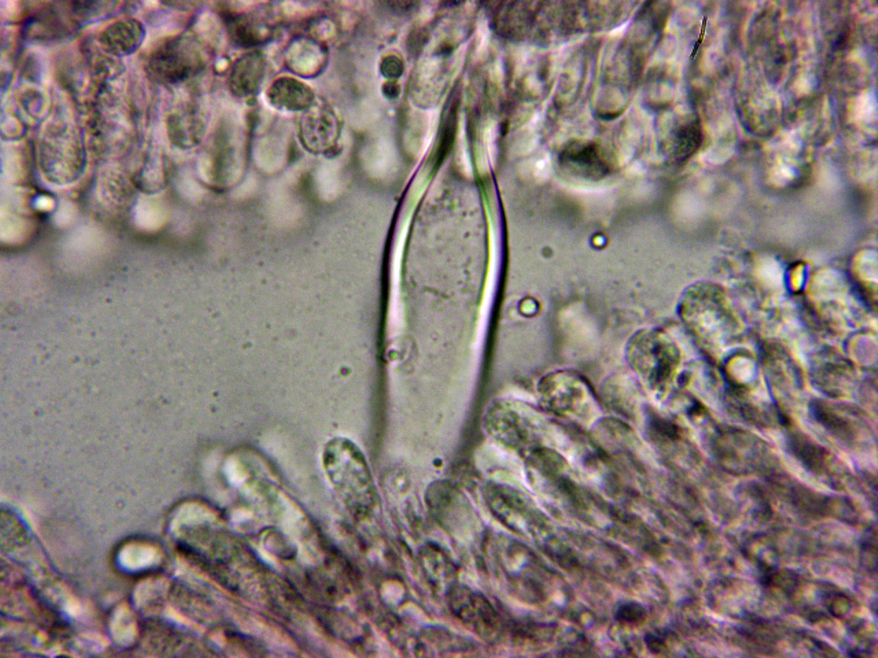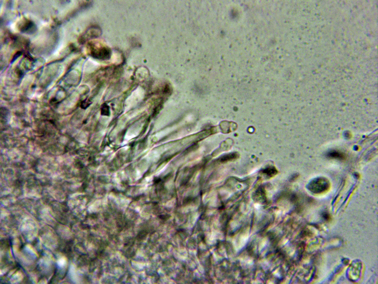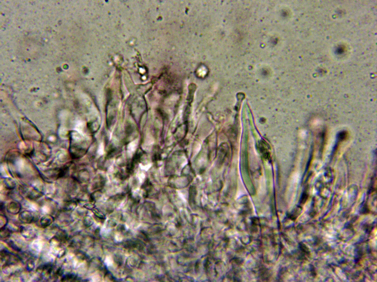 Pleurocistidios metuloides muy abundantes en la cara laminar, con unas medidas de 69.3 - 78 × 10.8 - 13.2 µm.
