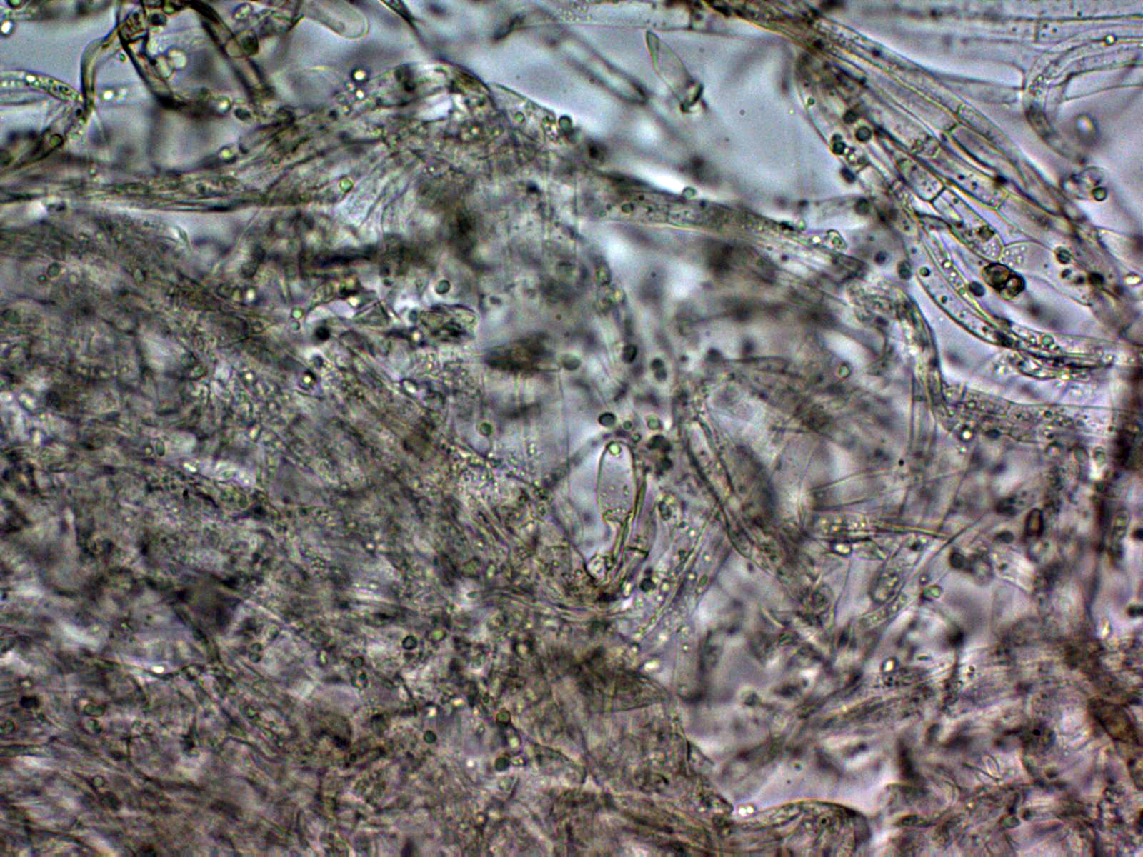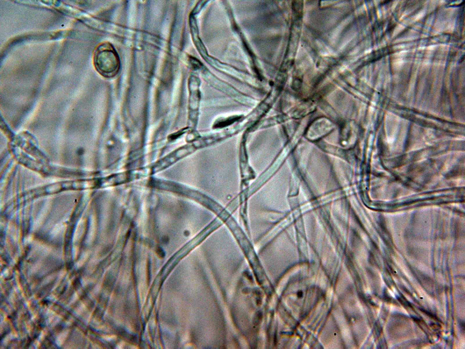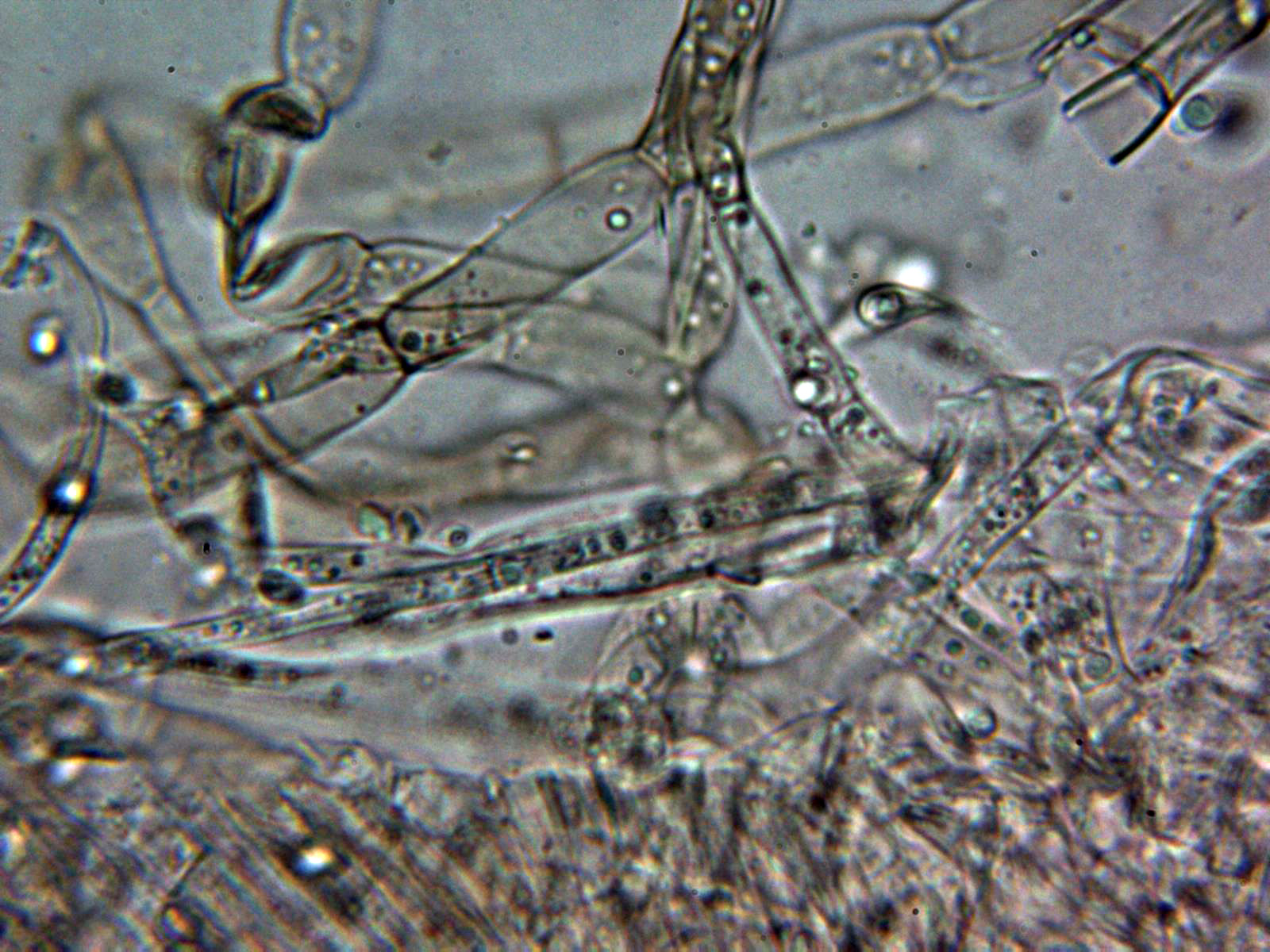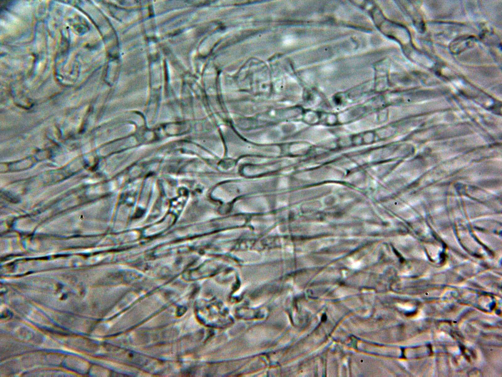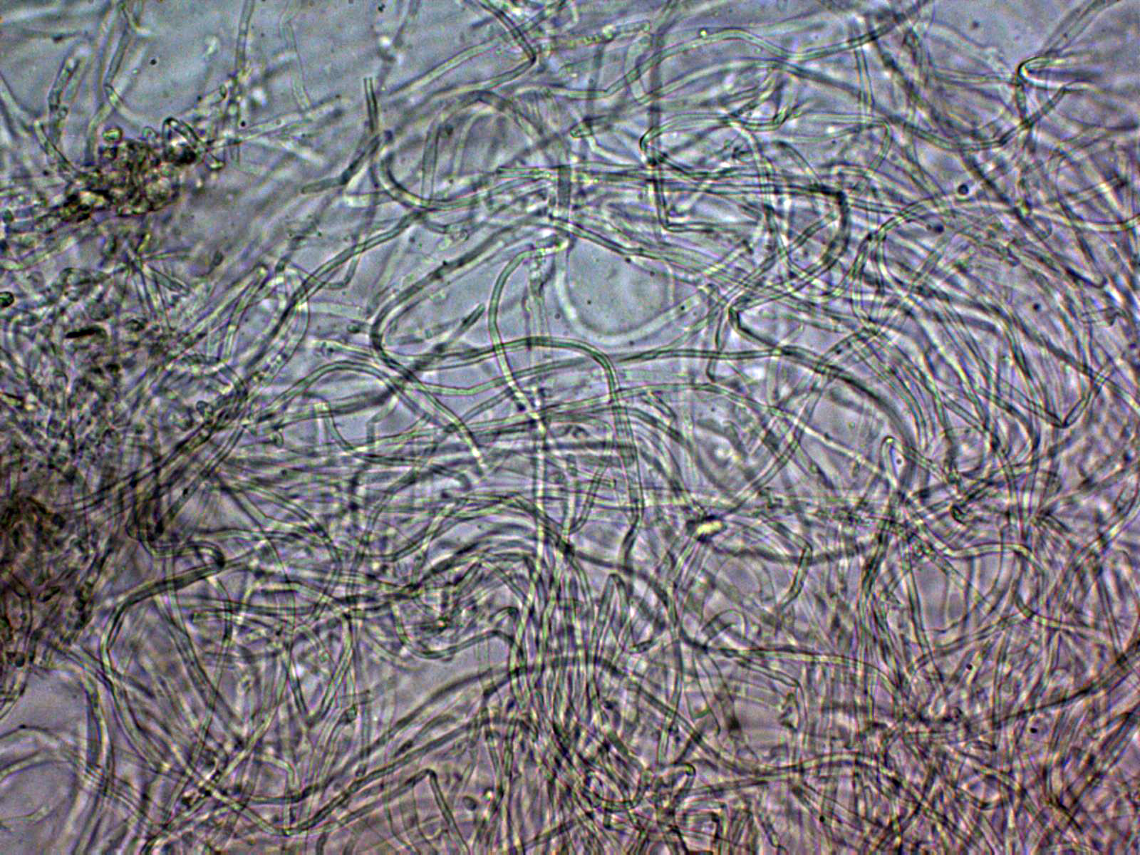 Pruína de la suprapellis compuesta por hifas filamentosas, muy separadas por gelificación, estas hifas a 400 aumentos: