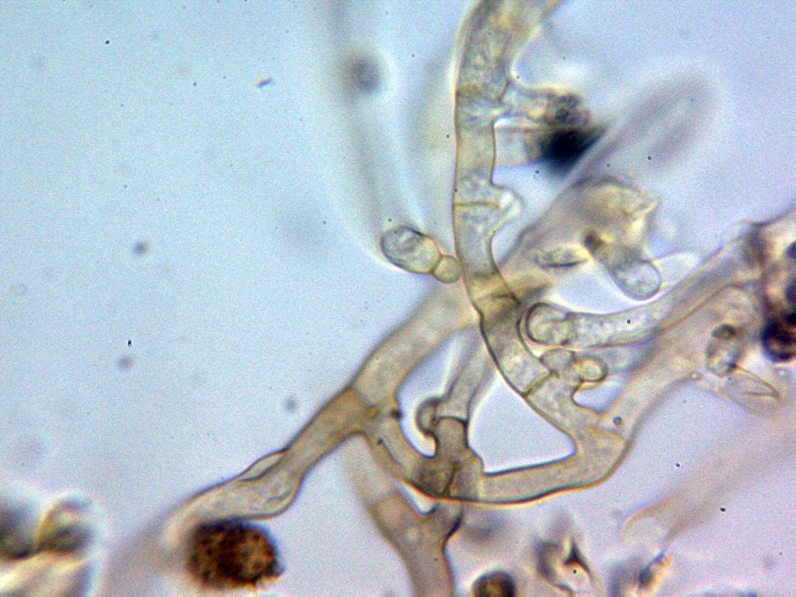 Hifas subhimeniales hialinas y con gruesas fíbulas: