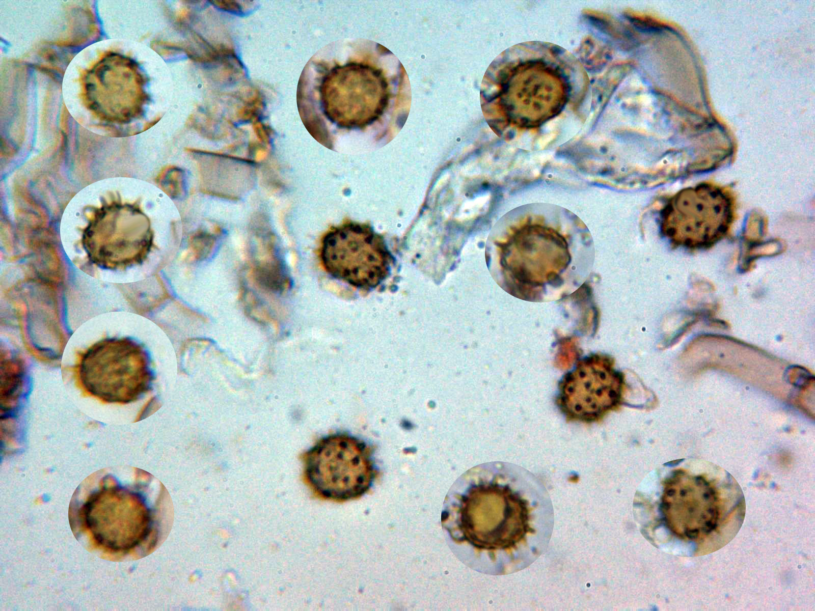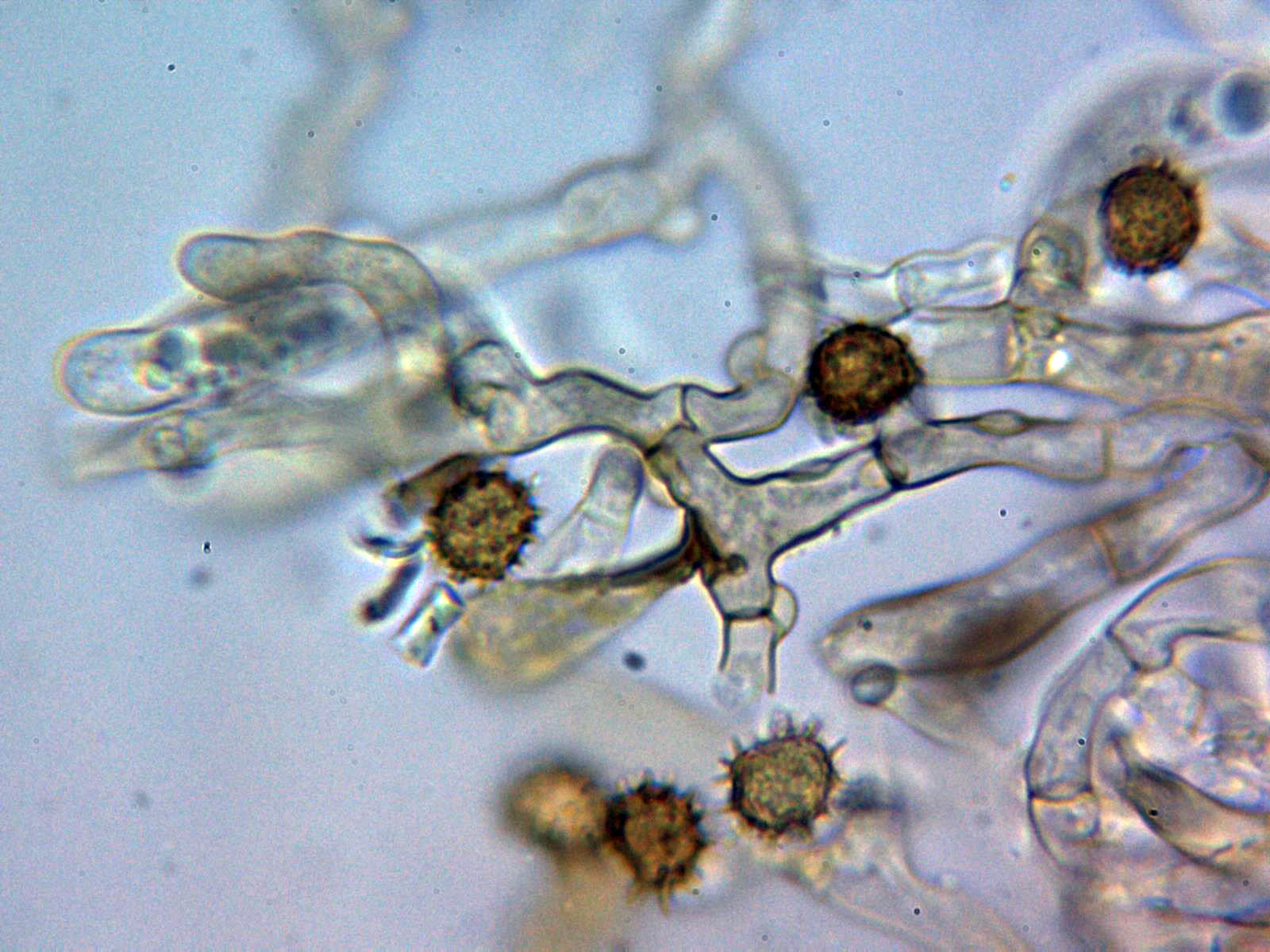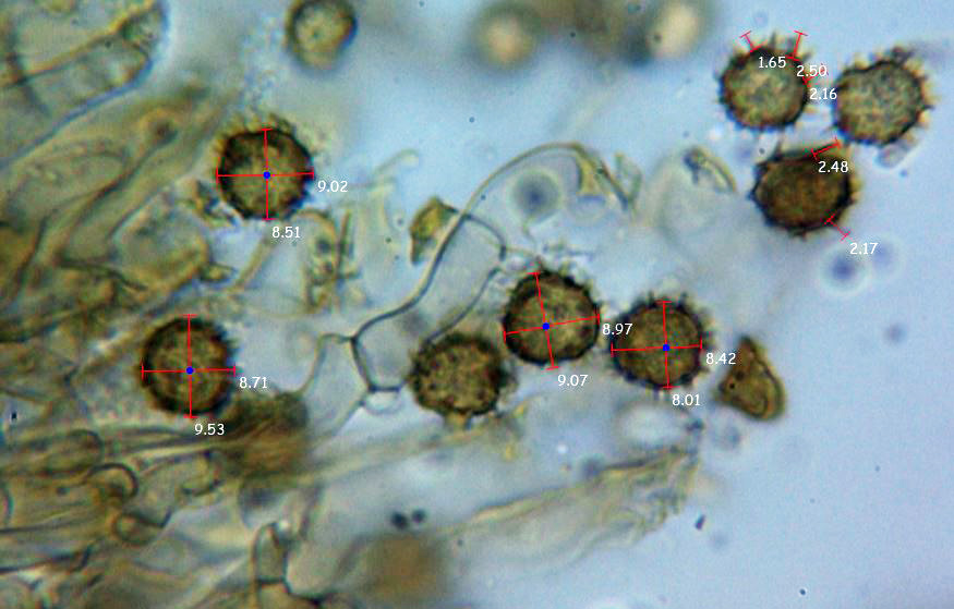 Esporas de color marrón, esféricas, bastante regulares, con una apícula marcada en un extremo y con espinas de hasta 2,5 micras: