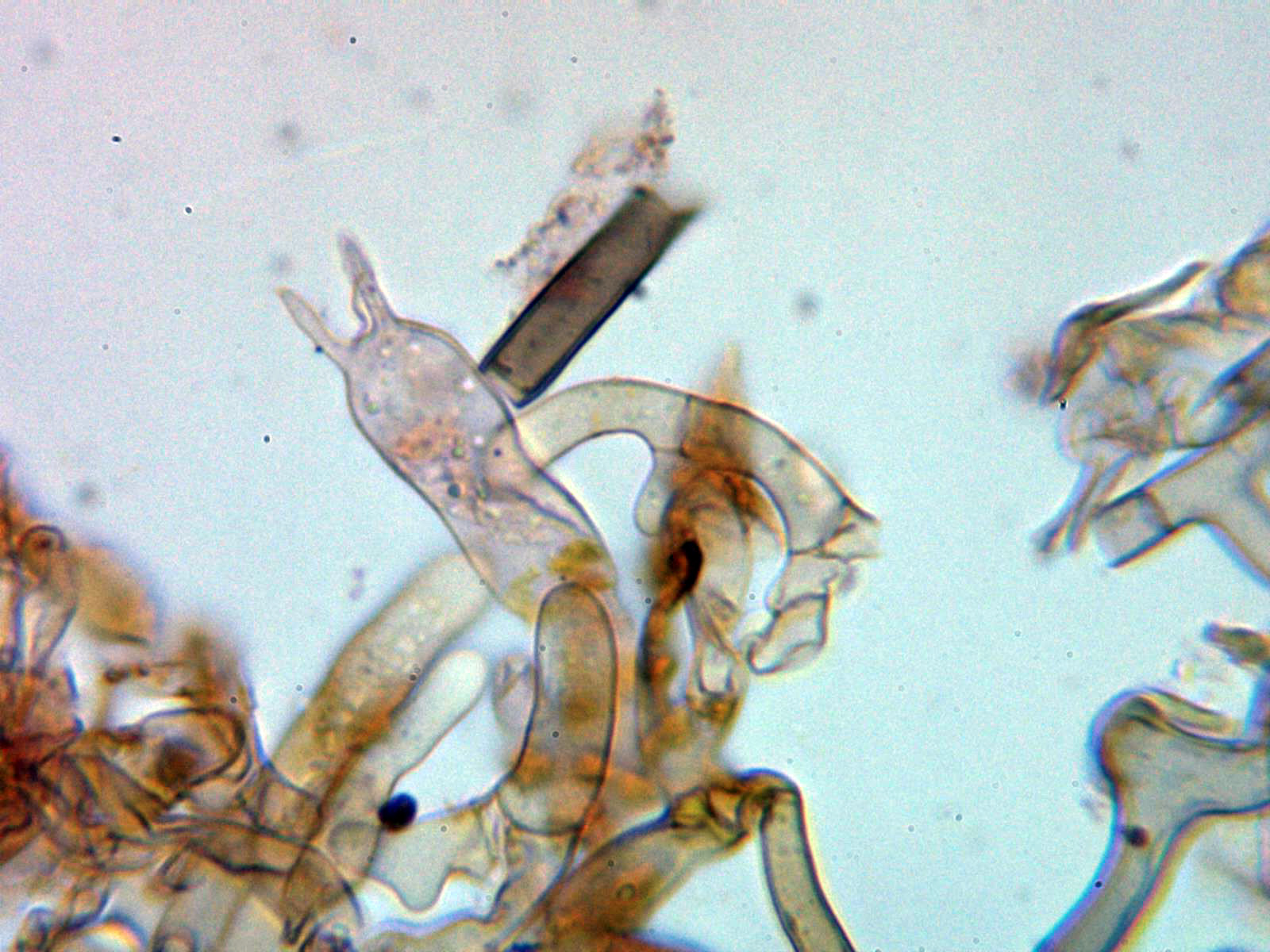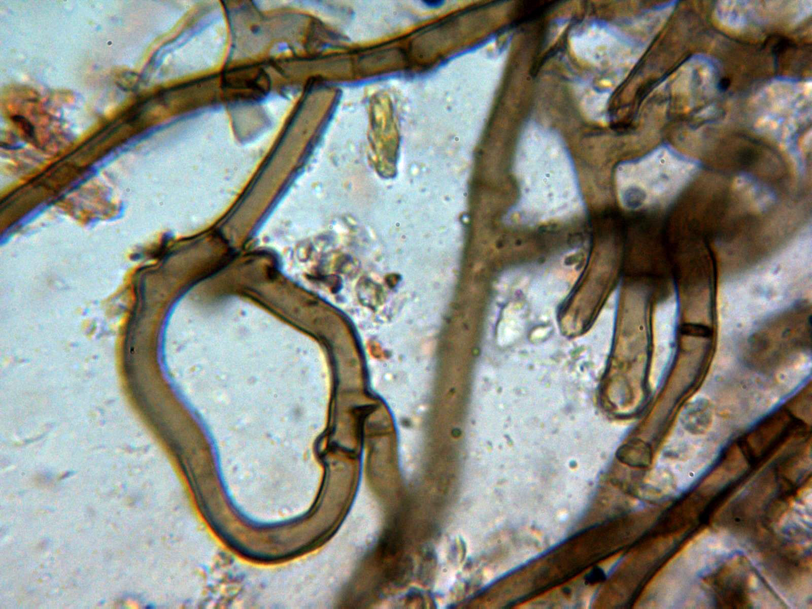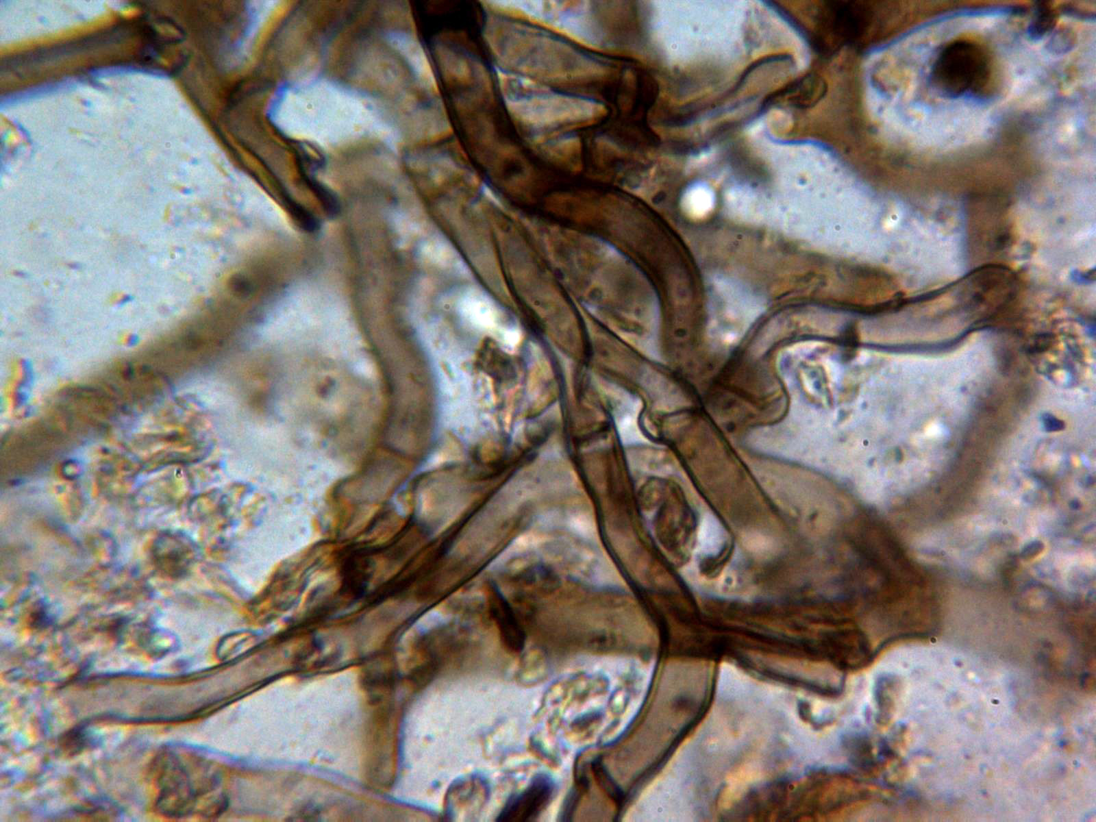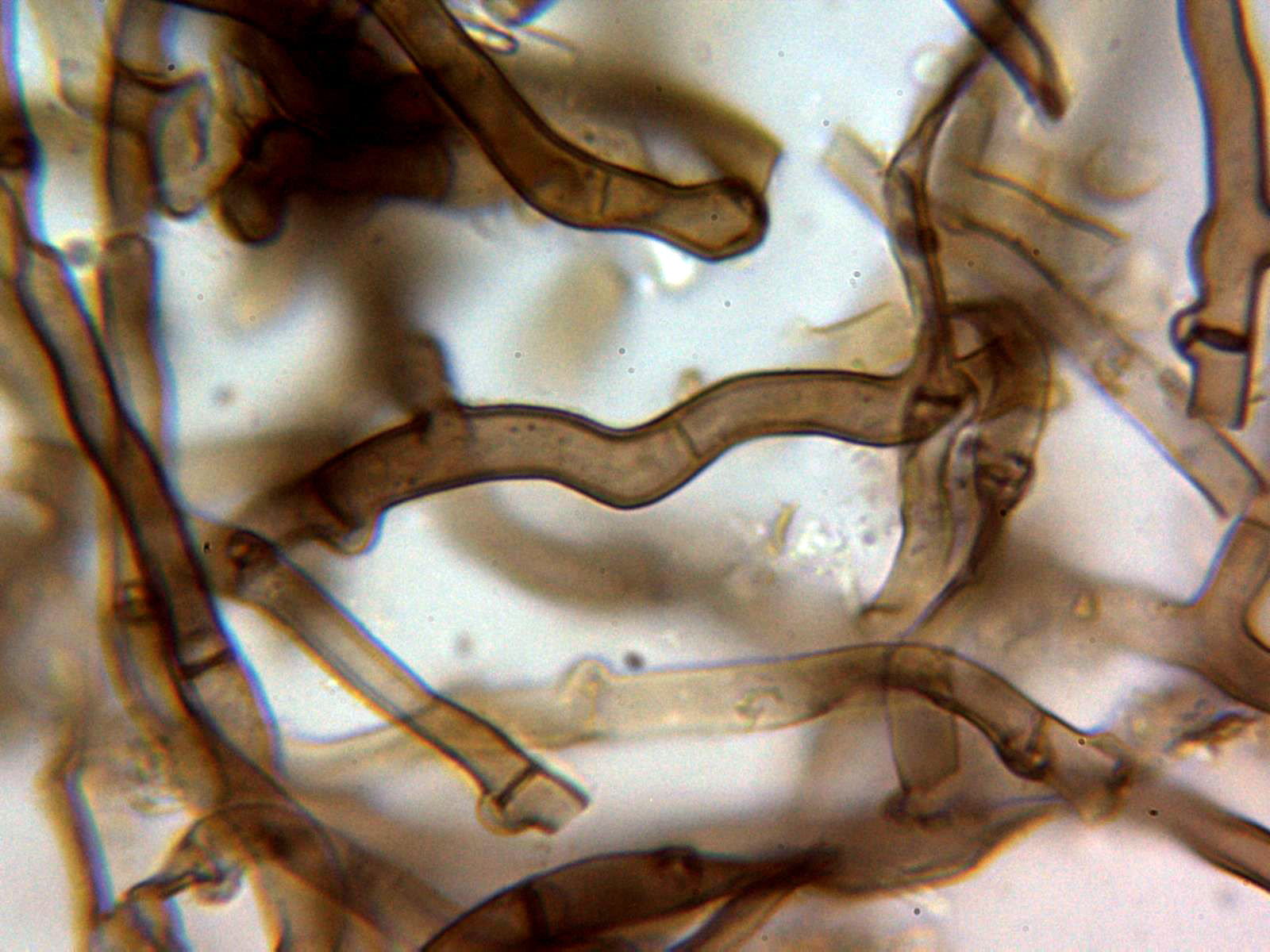 Hifas subiculares sin incrustaciones, de color marrón, pared gruesa y fibuladas: