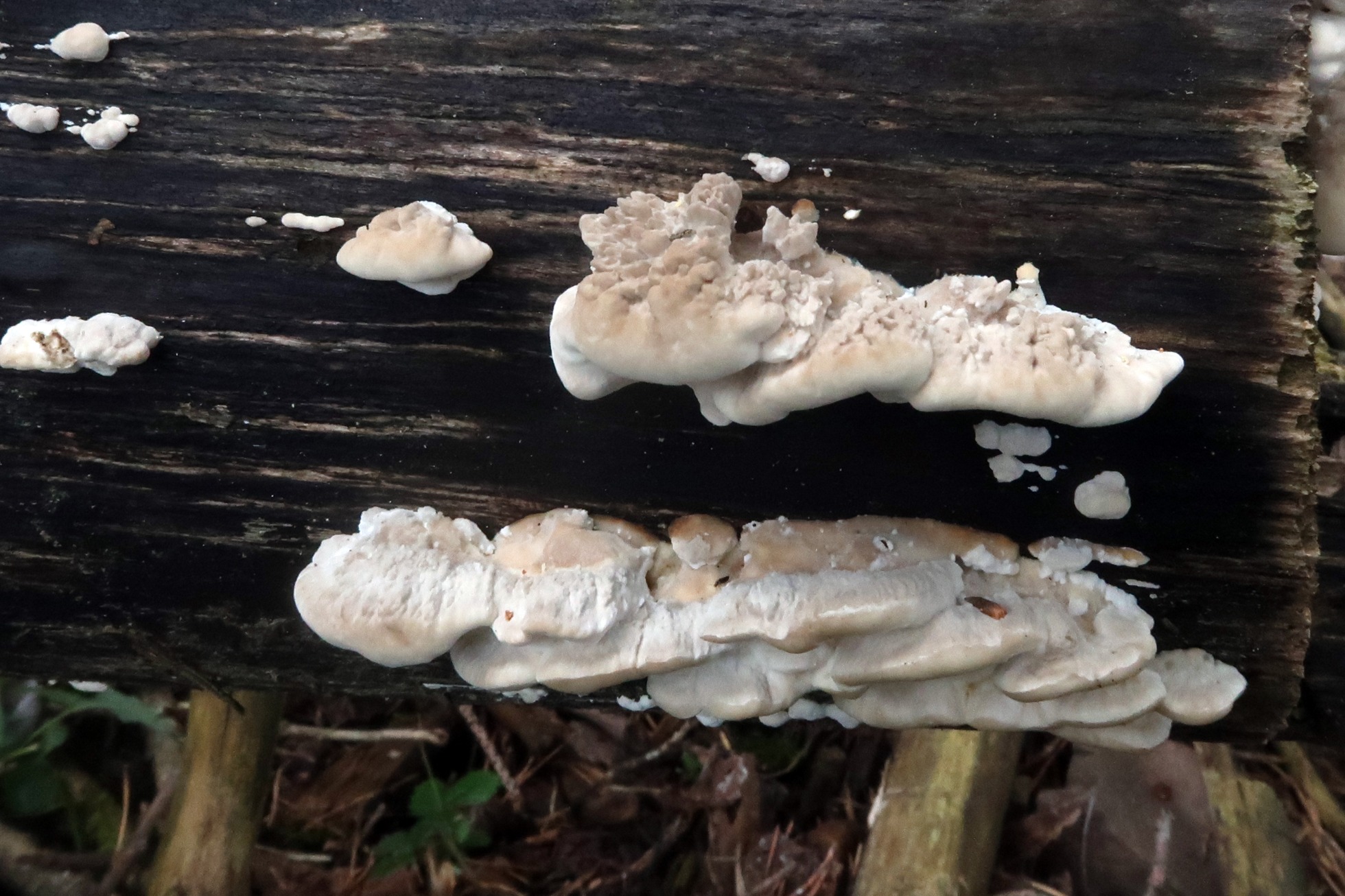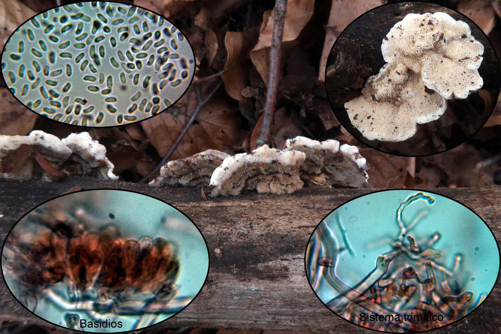Basidiocarpos effuso-reflejos, con sombreros imbricados, superficie del sombrero granulosa o con estrías radiales de color crema claro, no zonada, con el borde más blanquecino, carne al corte de color crema que no reacciona con el KOH: