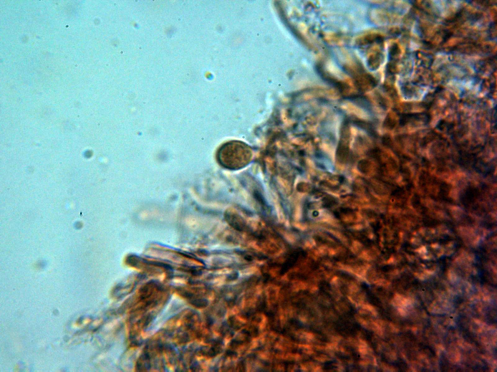 Muchas gracias a los dos, la verdad es que por mucho que me esfuerce sigo sin ver la Trametes versicolor por ningun lado, con el tema de la esporas le he dado muchas vueltas y aunque ningún autor las cita he llegado a pensar que quizás no se trataría de basidiosporas (con una morfología muy distinta) y que podría tratarse de clamidosporas, y estas solo se producirían en algunas condiciones especiales (algunos Polyporales las producen), aunque este dato explicaría su peculiar aspecto se trataría tan solo de una simple especulación.