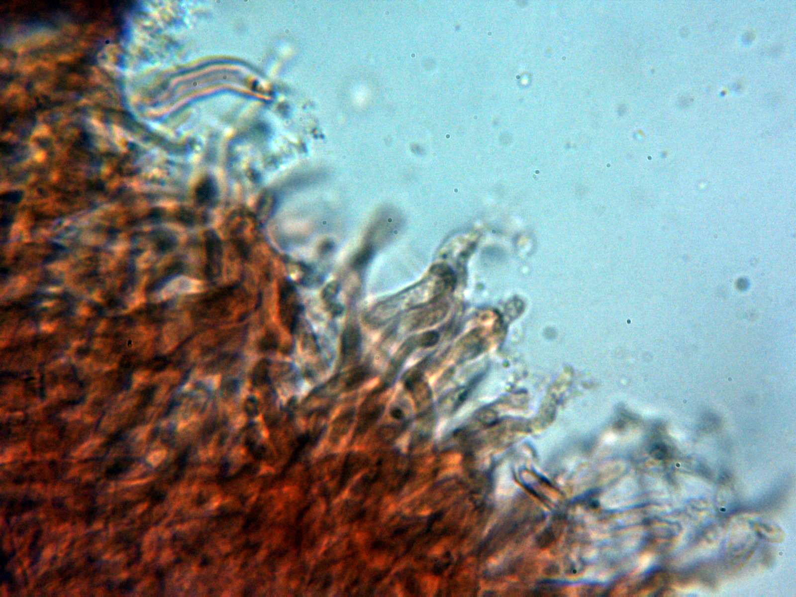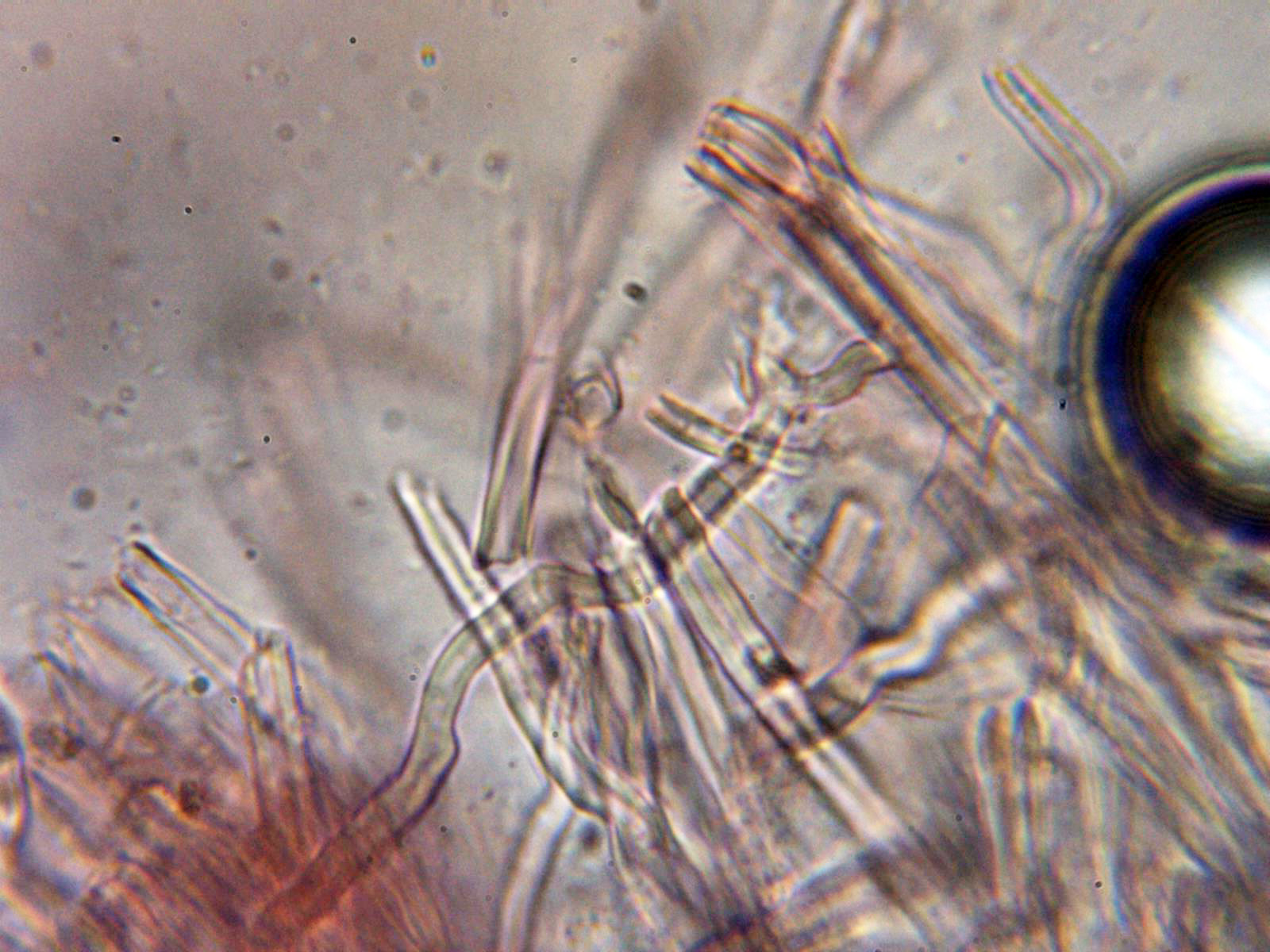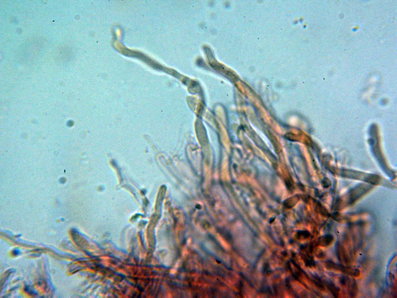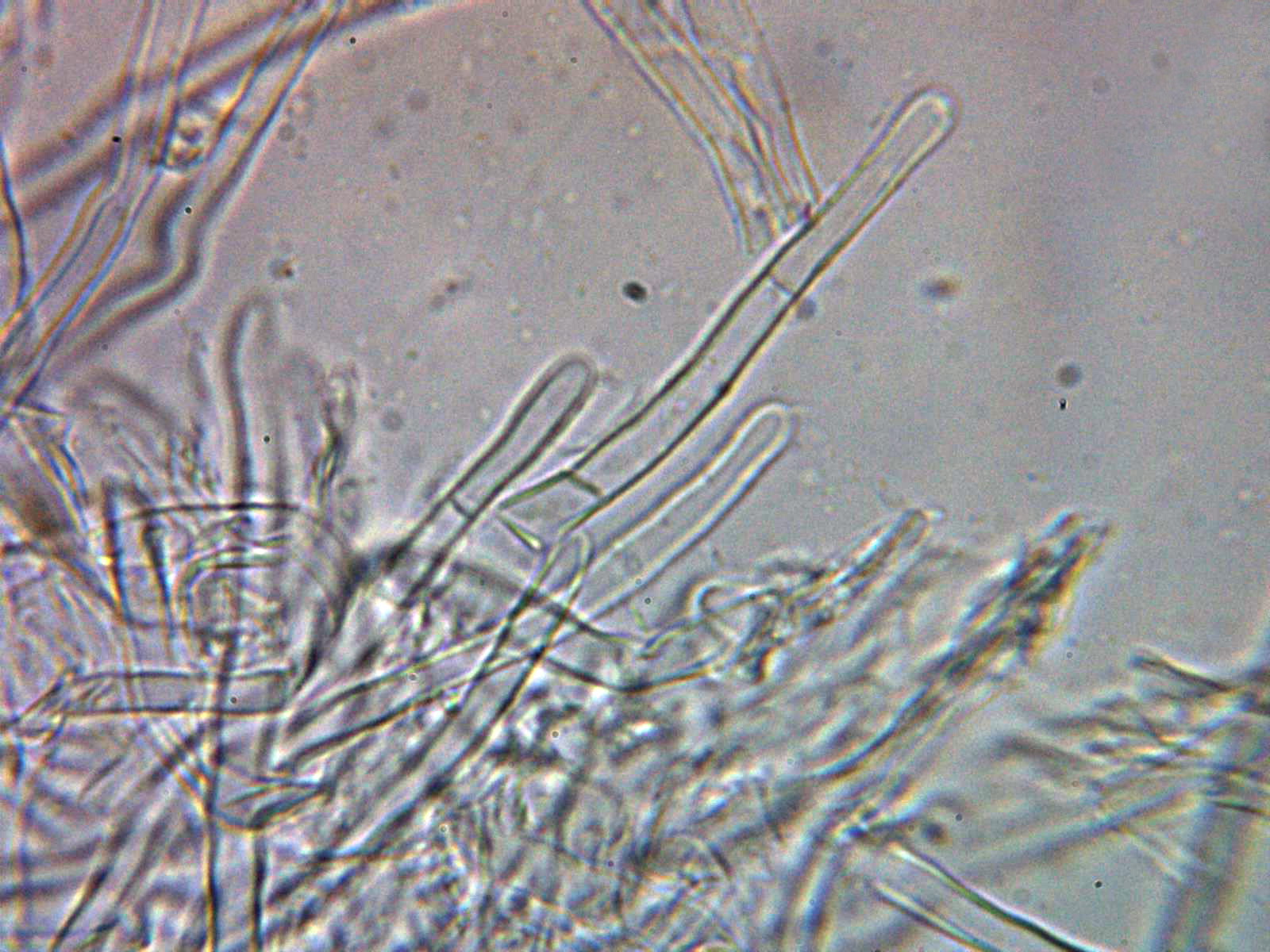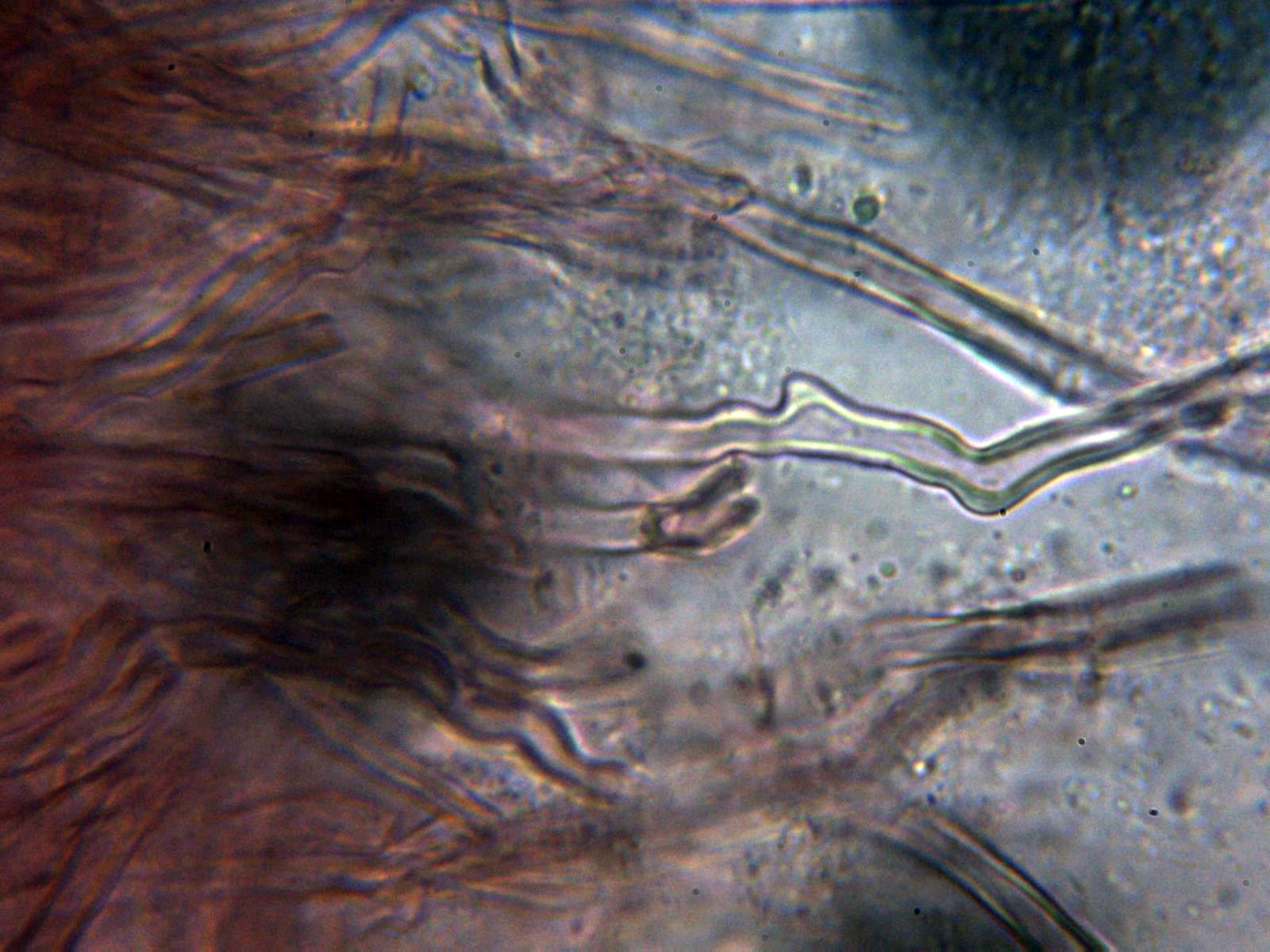 Hifas terminales del sombrero hialinas, terminando en formas redondeadas y aparentemente sin fíbulas: