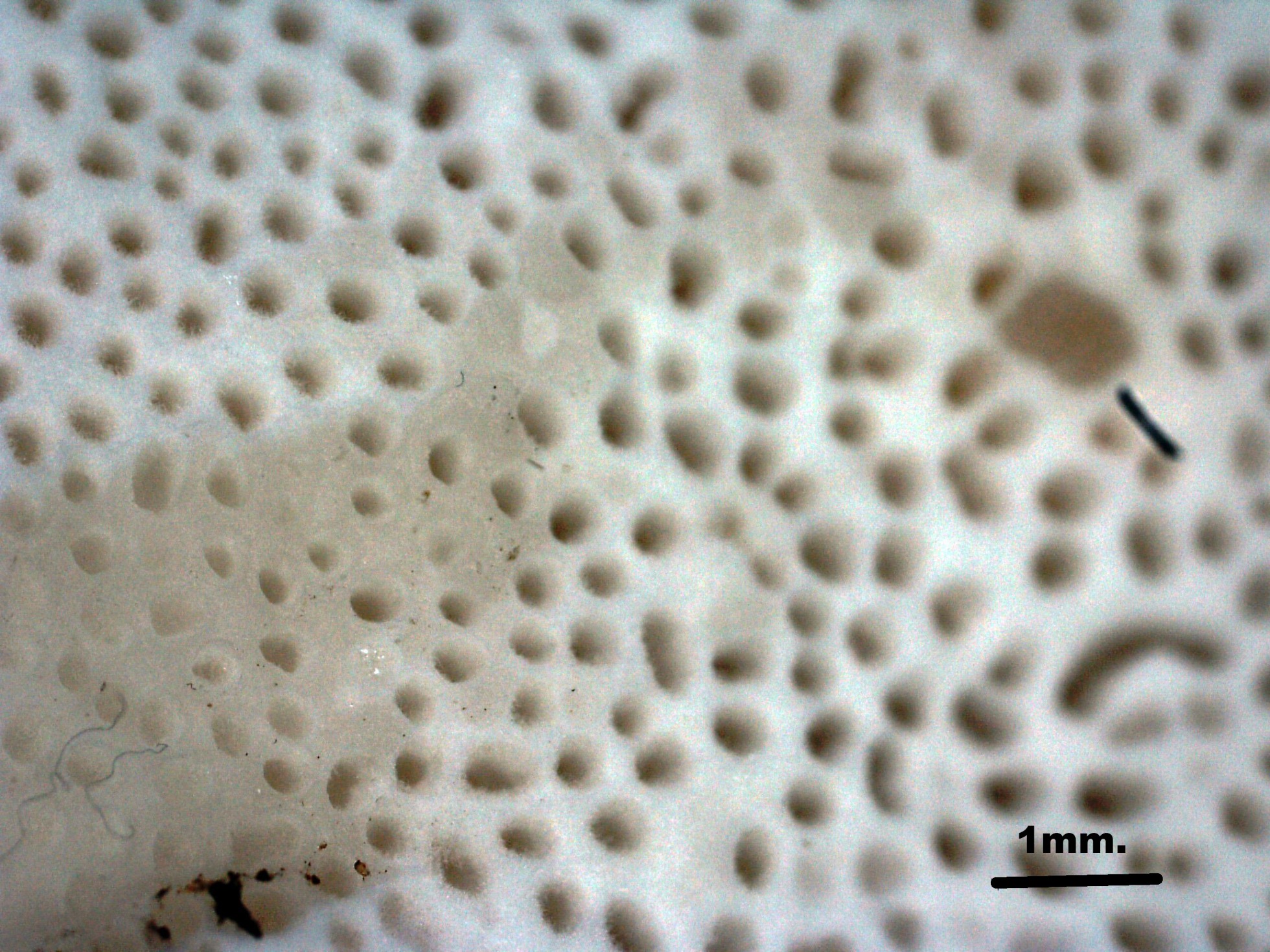 Poros redondeados de color blanco, de pared gruesa, algunos fusionándose entre ellos, bastante pequeños de media de 2 a 3 poros por mm.