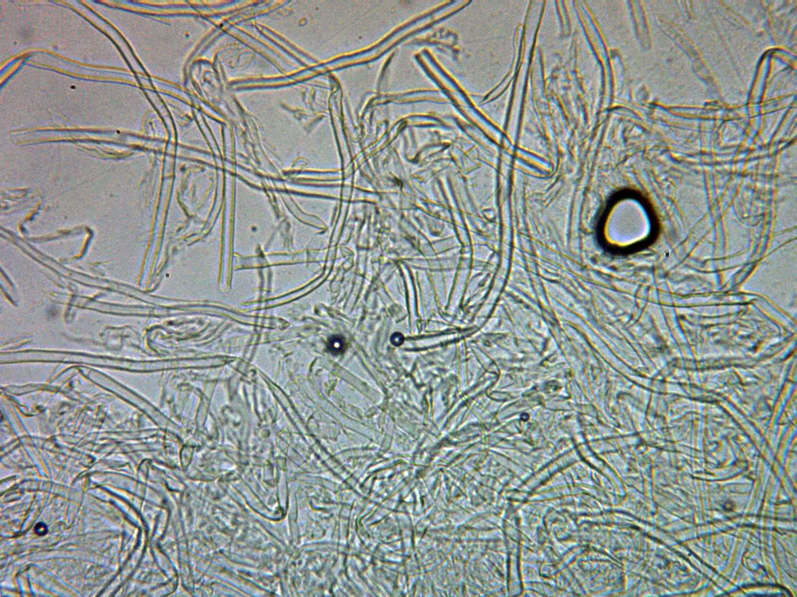 Un par de imágenes de las hifas subhimeniales en solución de Rojo Congo diluído, unas pocas ramificadas e irregulares y sinuosas sin septos que se corresponderían con hifas envolventes:
