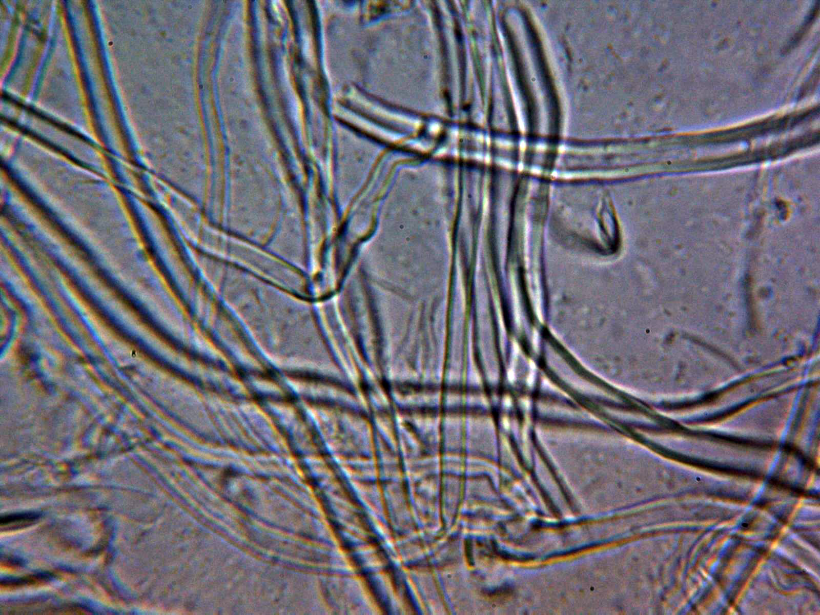 Hifas del contexto del sombrero en KOH, algunas de pared gruesa y sin septos que se corresponderían con las hifas esqueléticas: