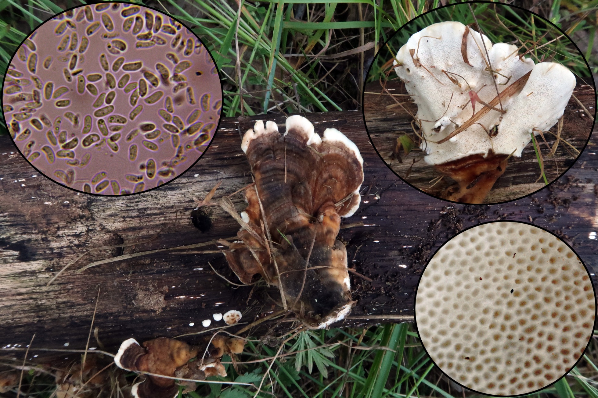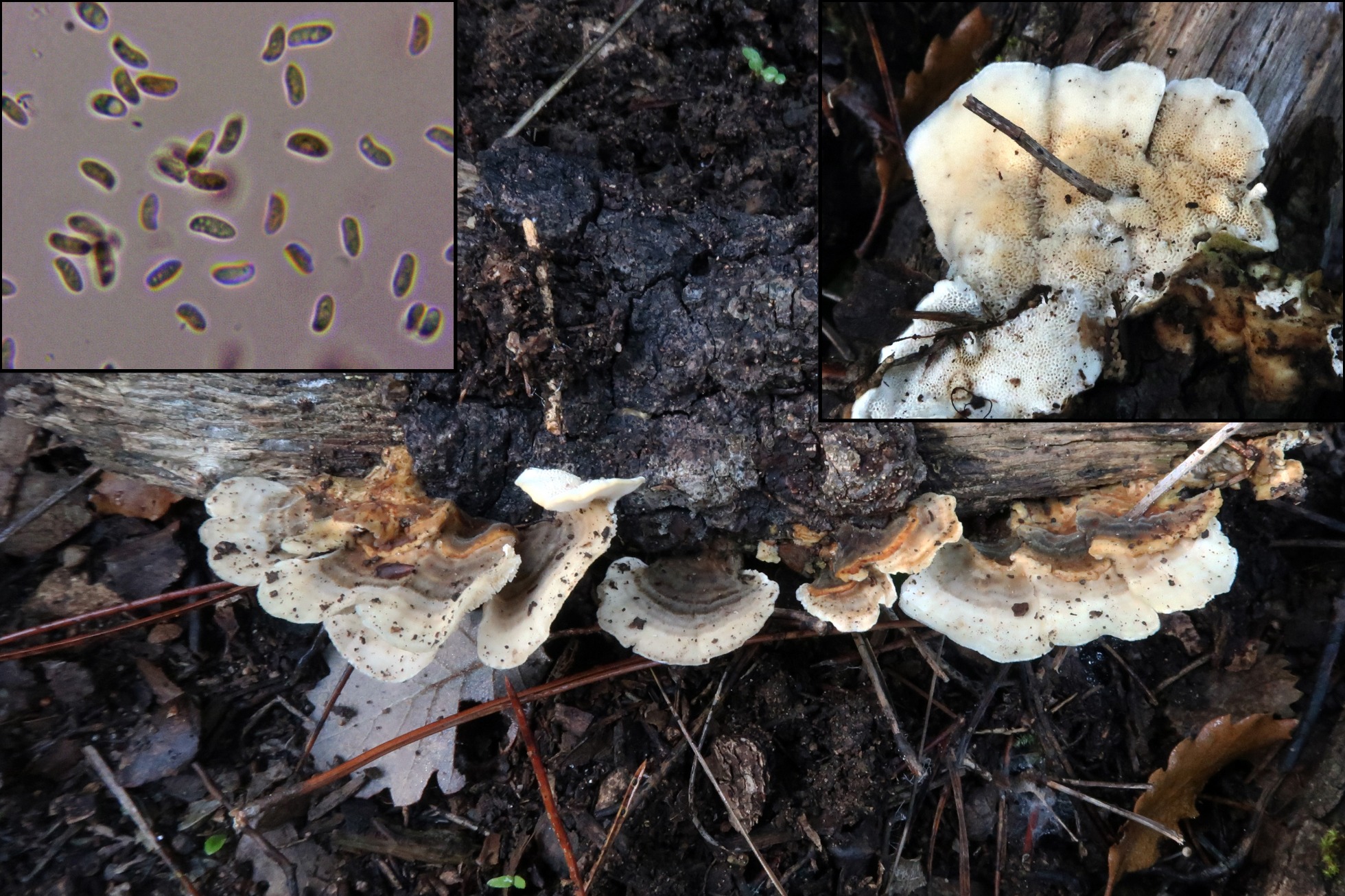 Observaciones: El aspecto del sombrero de mi propuesta no es para nada zonado, sinó mas bien de un color uniforme, el grosor de los basidiocarpos según Ryvarden no debería superar los 8 mm. (3 + 5 mm.), en los ejemplares del presente estudio su grosor superaba de largo el cm., las medidas de las esporas en anchura de mi propuesta ((3.1) 3.3 - 3.8 (3.9) µm.) están muy por encima de la anchura indicada por Ryvarden para las mismas de tan solo 2 a 2,5 µm., tampoco encaja la morfología según Ryvarden cilíndricas ligeramente curvadas y en este estudio elipsoides, y aunque Ryvarden también la sitúa sobre Pinus advierte de que la presencia sobre este sustrato se considera "rara".