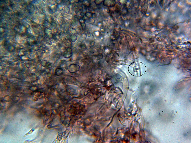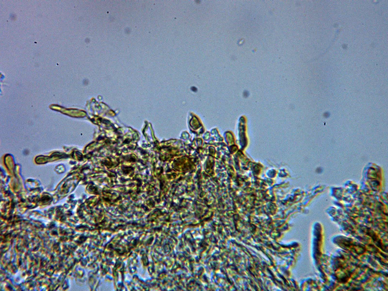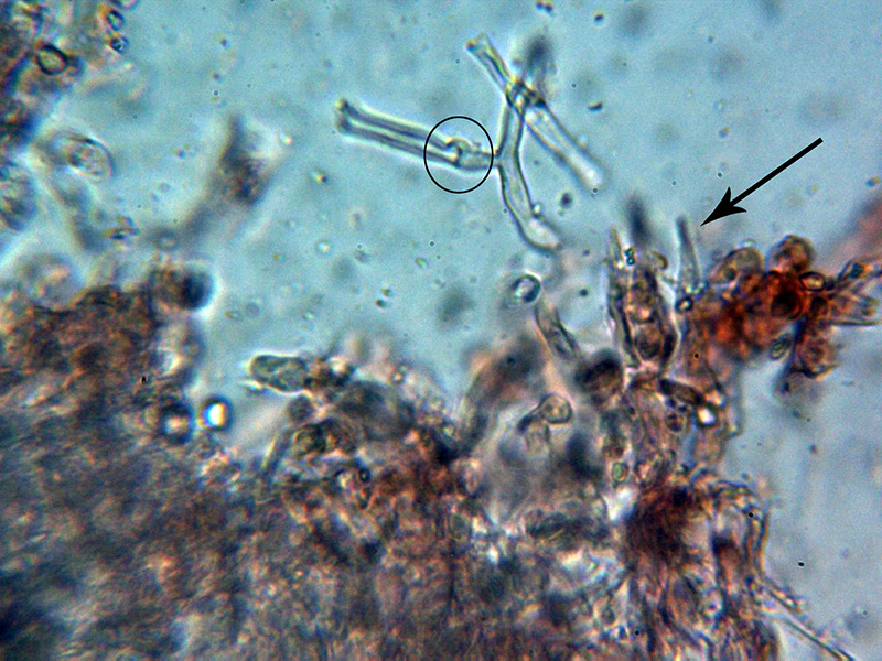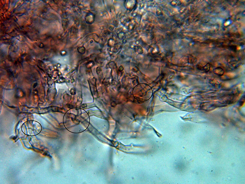 Sistema hifal monomítico con hifas generativas hialinas y fibuladas, sin ensanchamientos apreciables, con ramificaciones en ángulo recto y con una anchura de entre 2,2 a 3 micras.