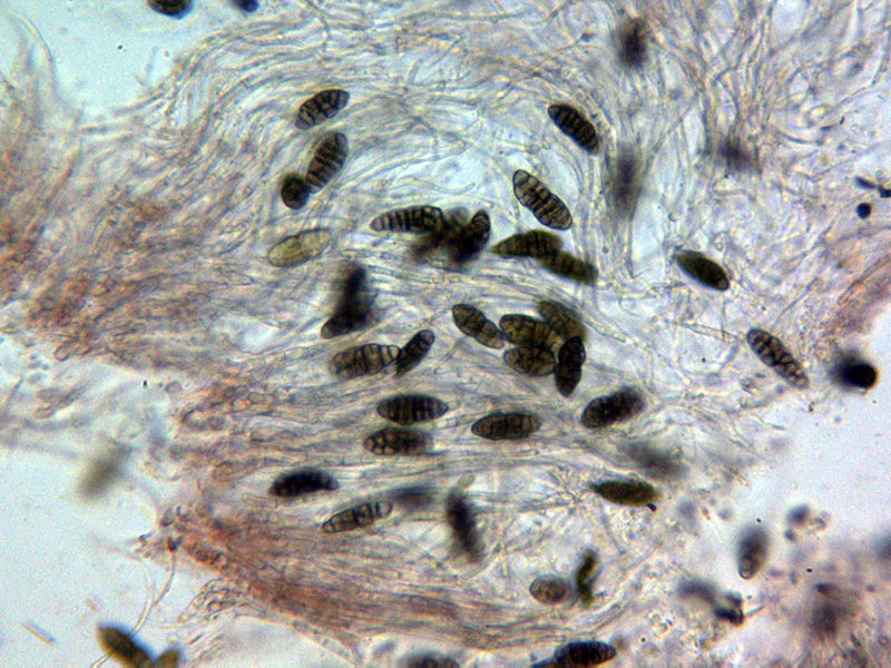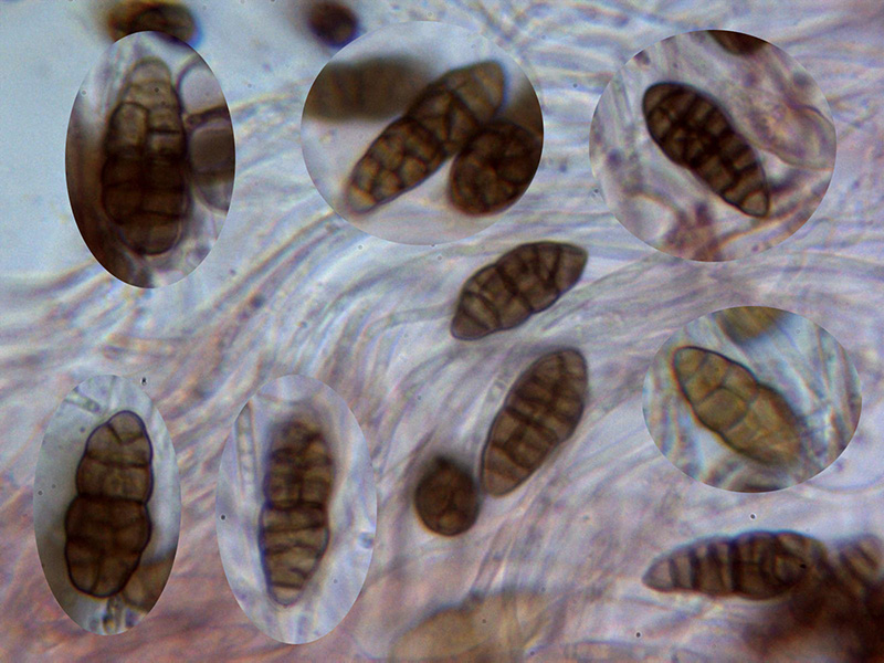 Ascosporas moriformes de color marrón, con un constreñimiento en su parte central y con entre 5 y 7 septos transversales.