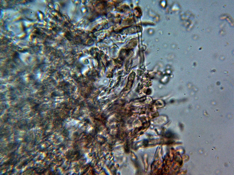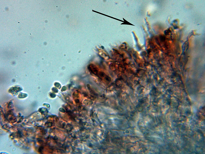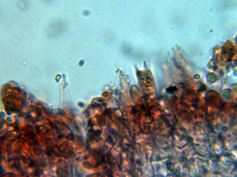 Himenio con basidios tetraspóricos y aunque no se observan cistidios claramente diferenciados, si hay presentes bastantes terminaciones hifoides más estrechas que los basidios y terminando en formas más o menos fusiformes o cilíndricas.