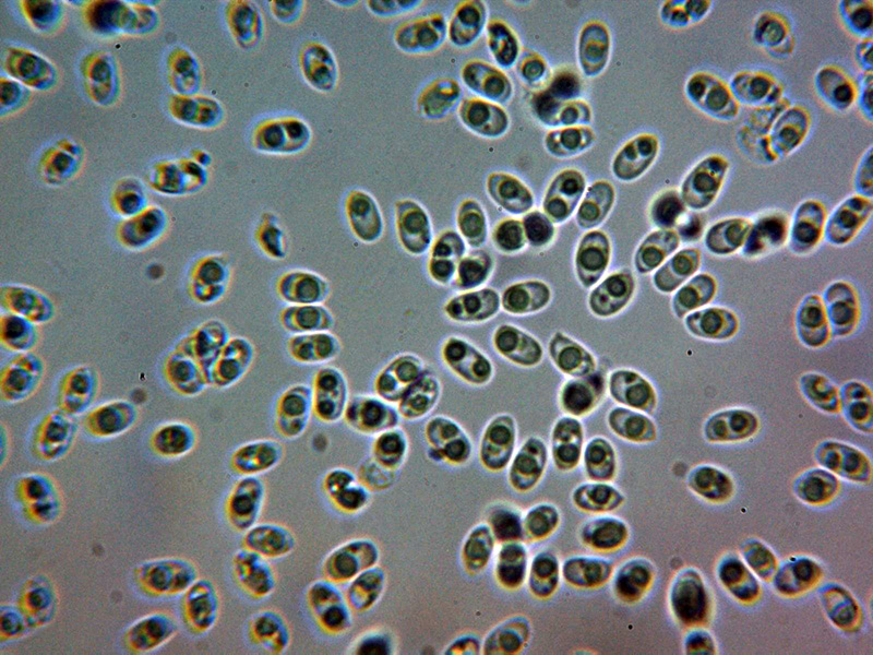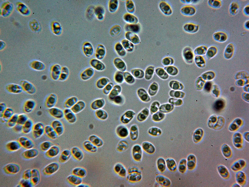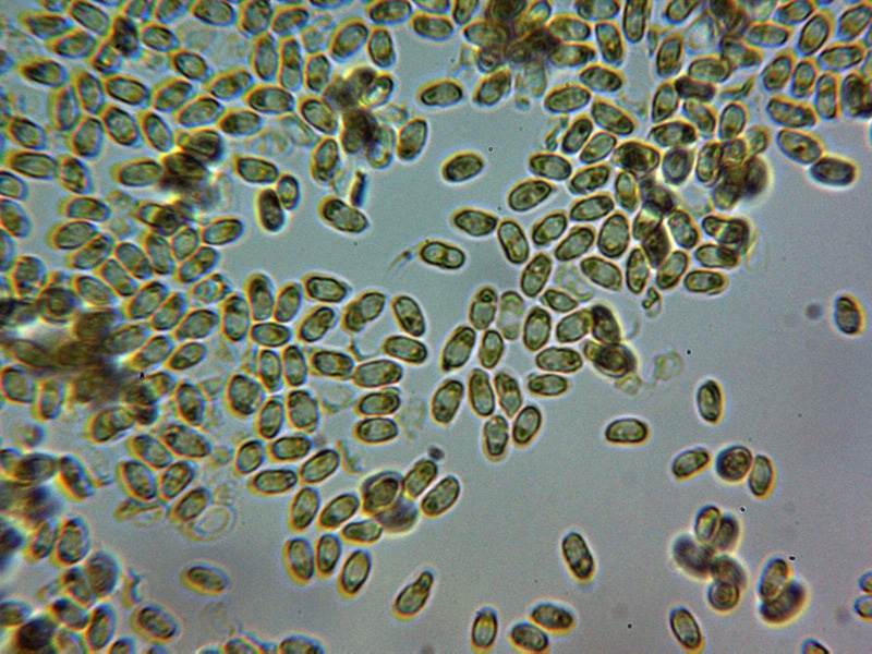 Esporas de pared fina, elipsoides, con apícula lateral, una o dos grandes gotas lípidas en su interior y unas medidas en agua de: