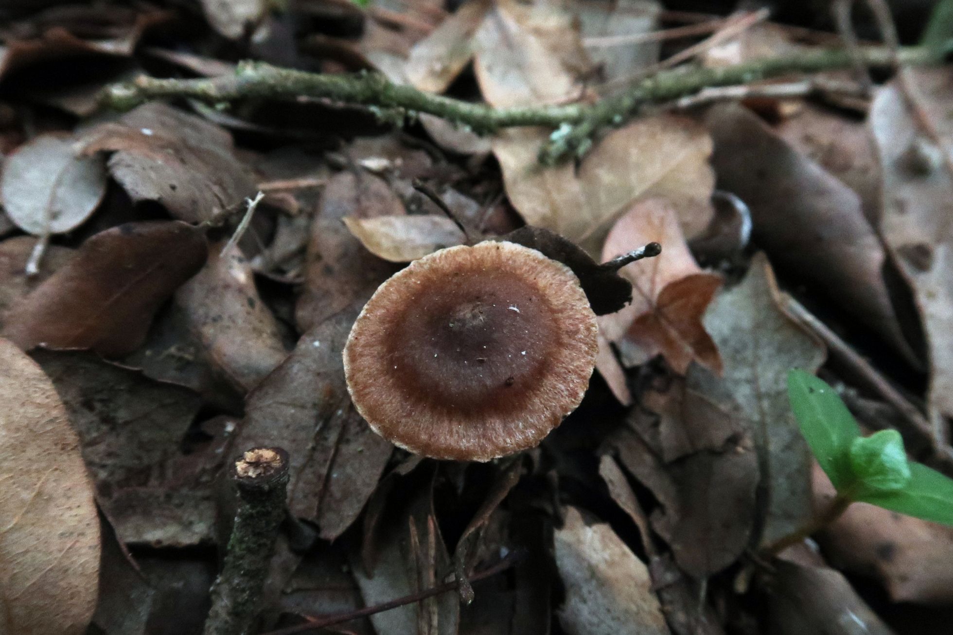 Sombrero de pequeño tamaño, de color marrón oscuro, con el borde más claro y abundantes fibrillas dispuestas de forma radial: