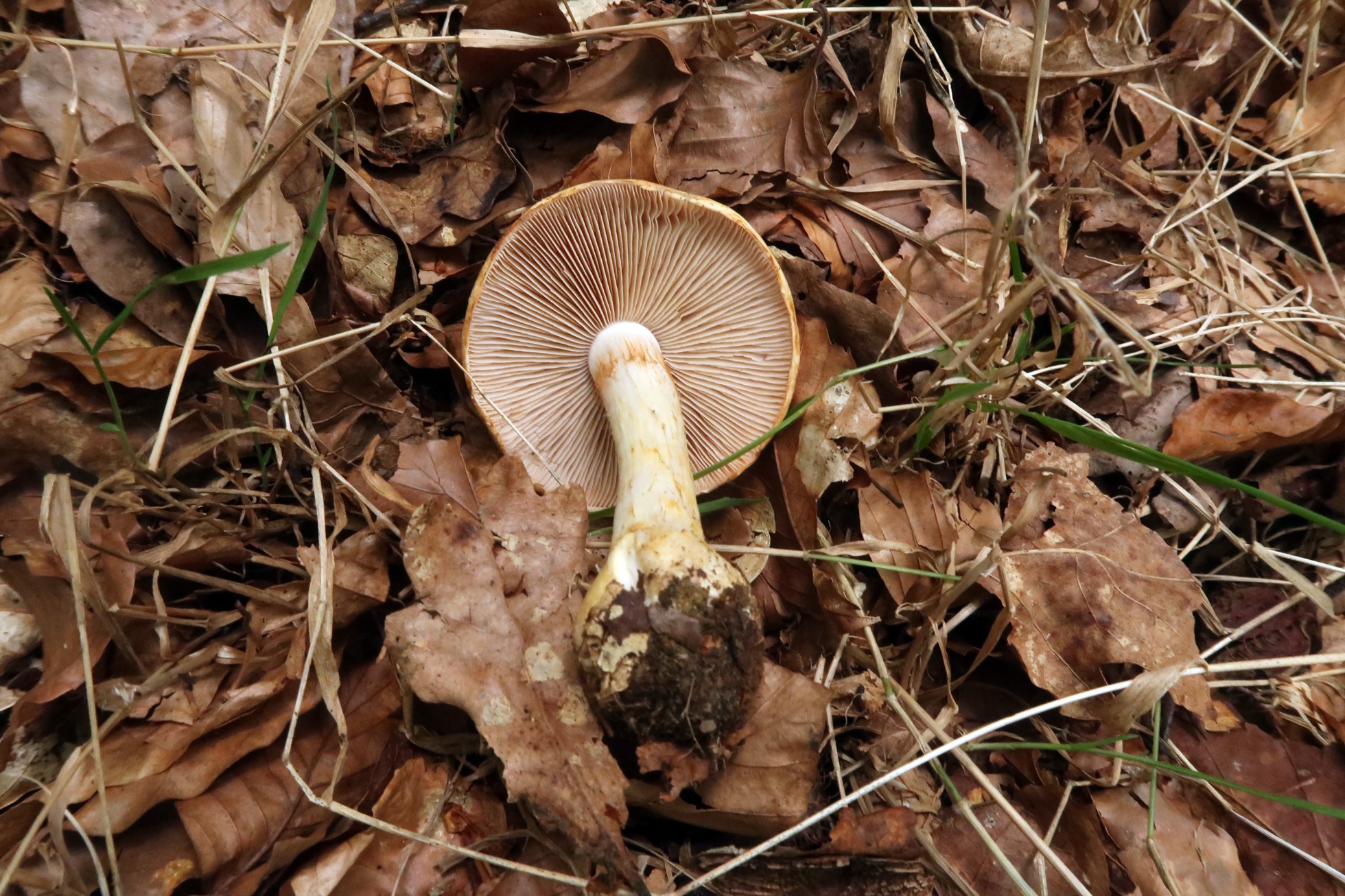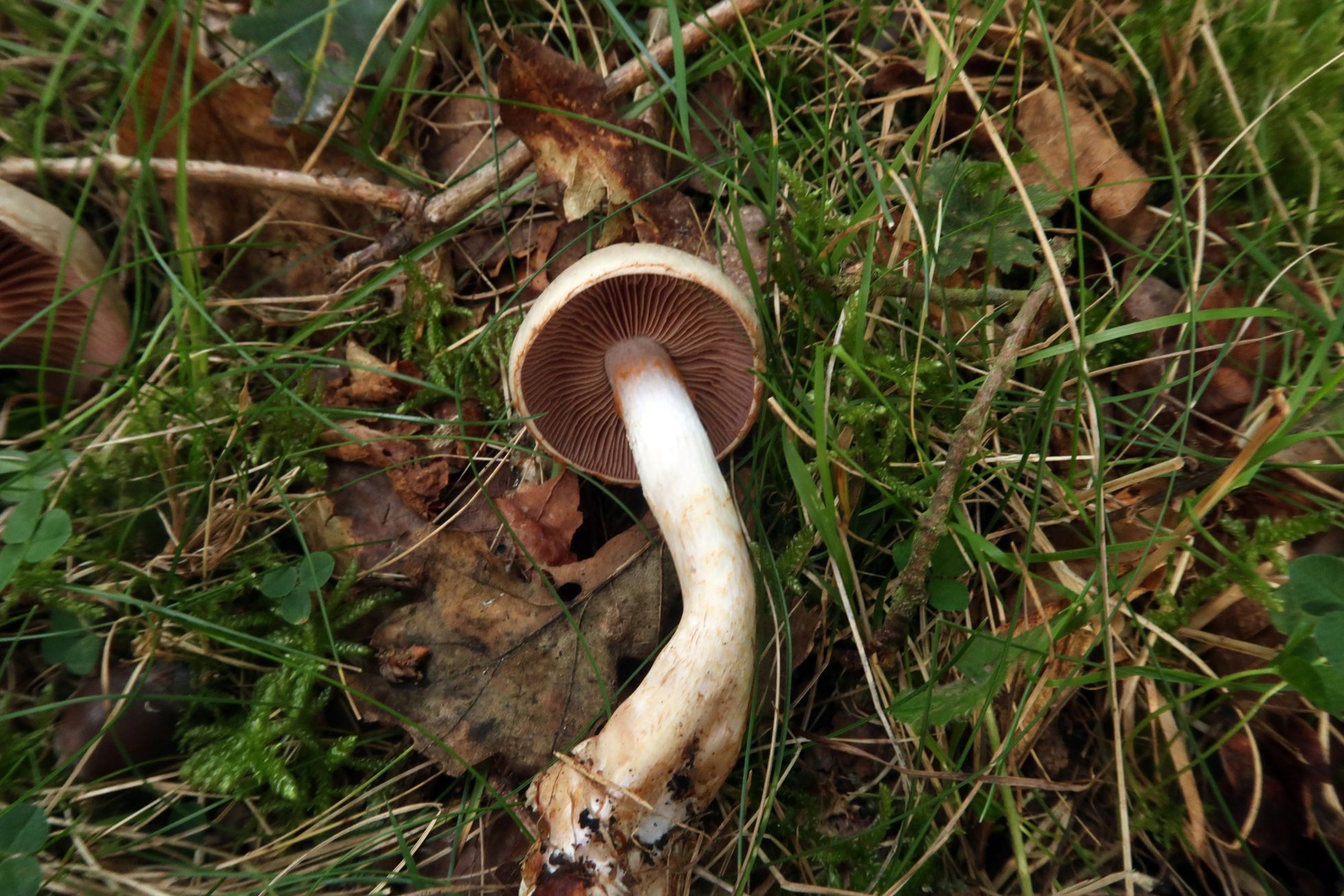 Láminas medianamente espaciadas, muy ventrudas con tintes violáceos y pie ensanchándose a medida que nos acercamos a su base pero sin un bulbo diferenciado, asimismo con tintes violáceos: