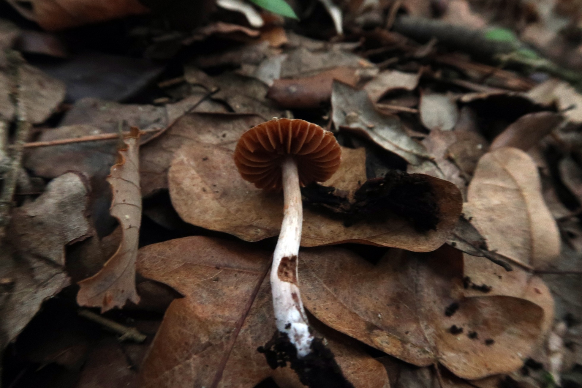 Láminas bastante espaciadas y pie fino, cilínrdico, largo sin bulbo y solo ligeramente ensanchado en su mitad inferior: