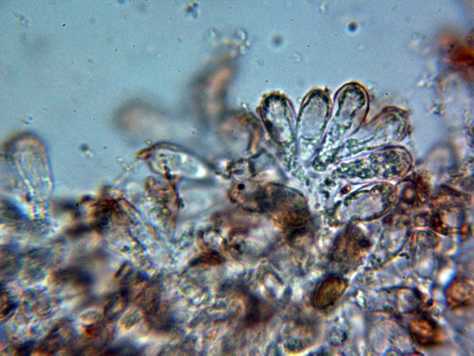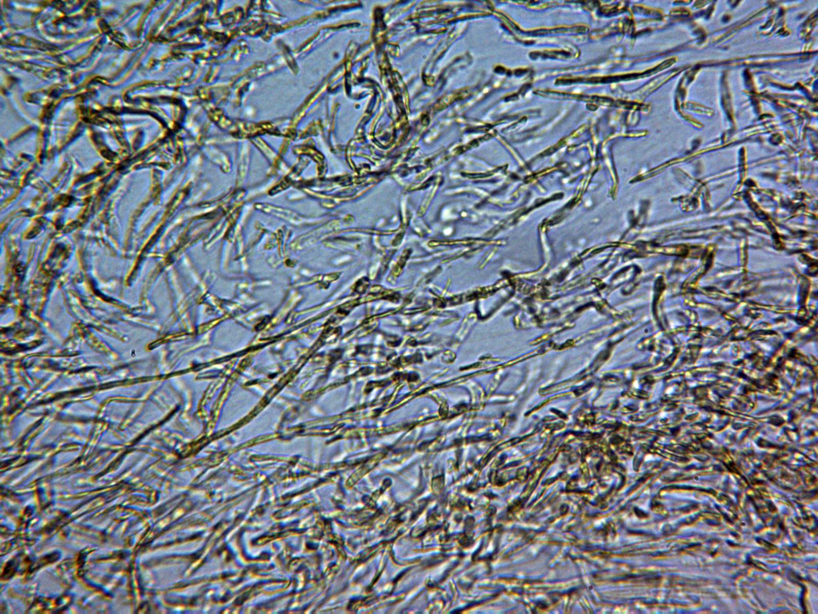 Por debajo de esta capa, otra capa de hifas ya compactadas y con pigmento intracelular marrón: