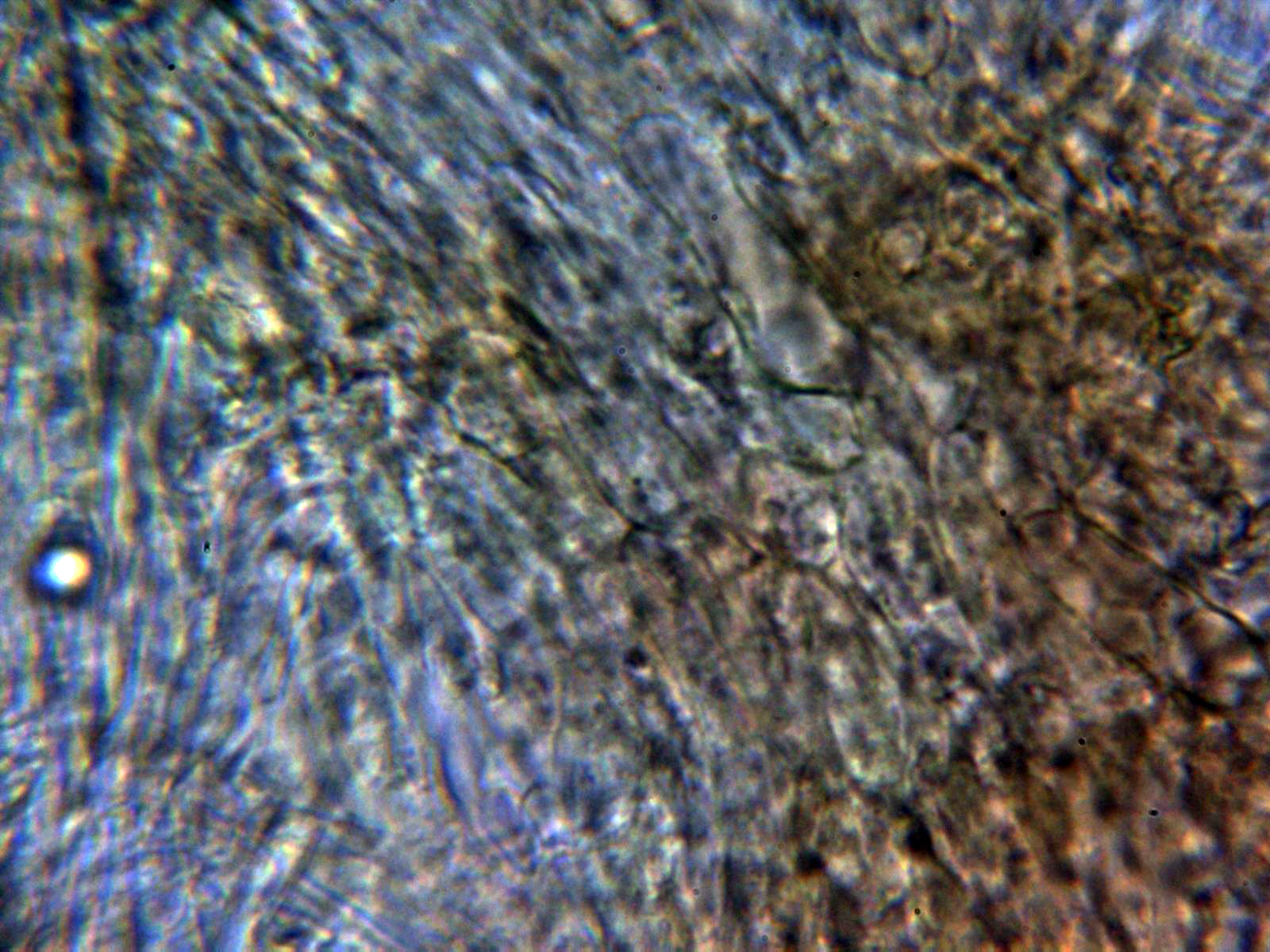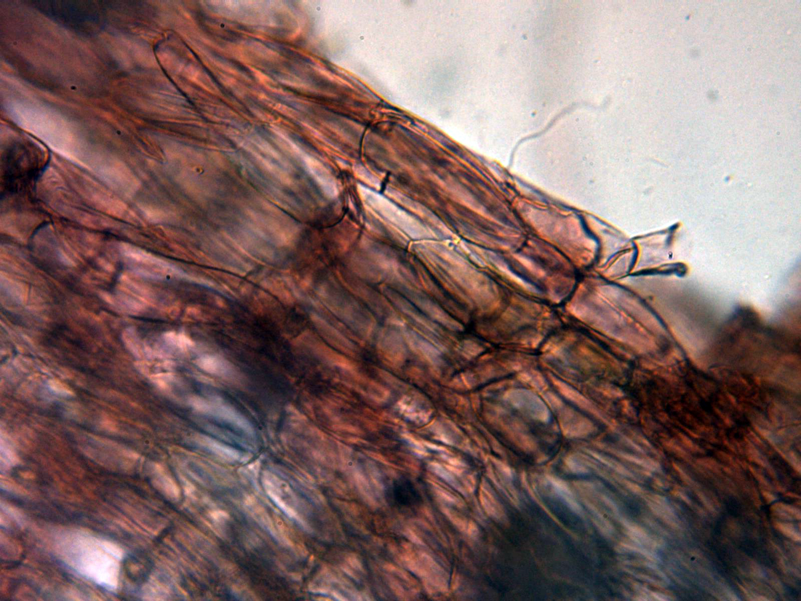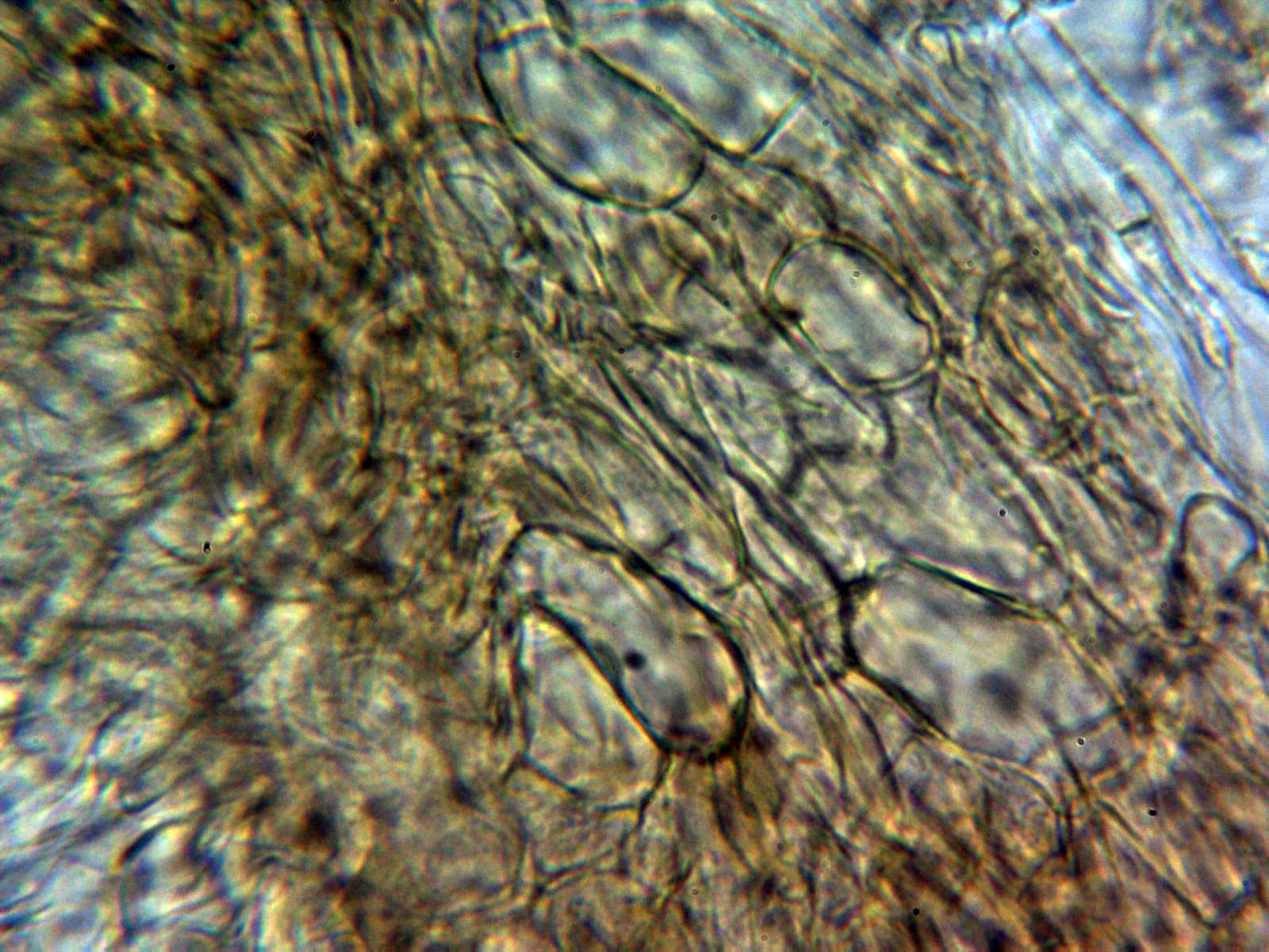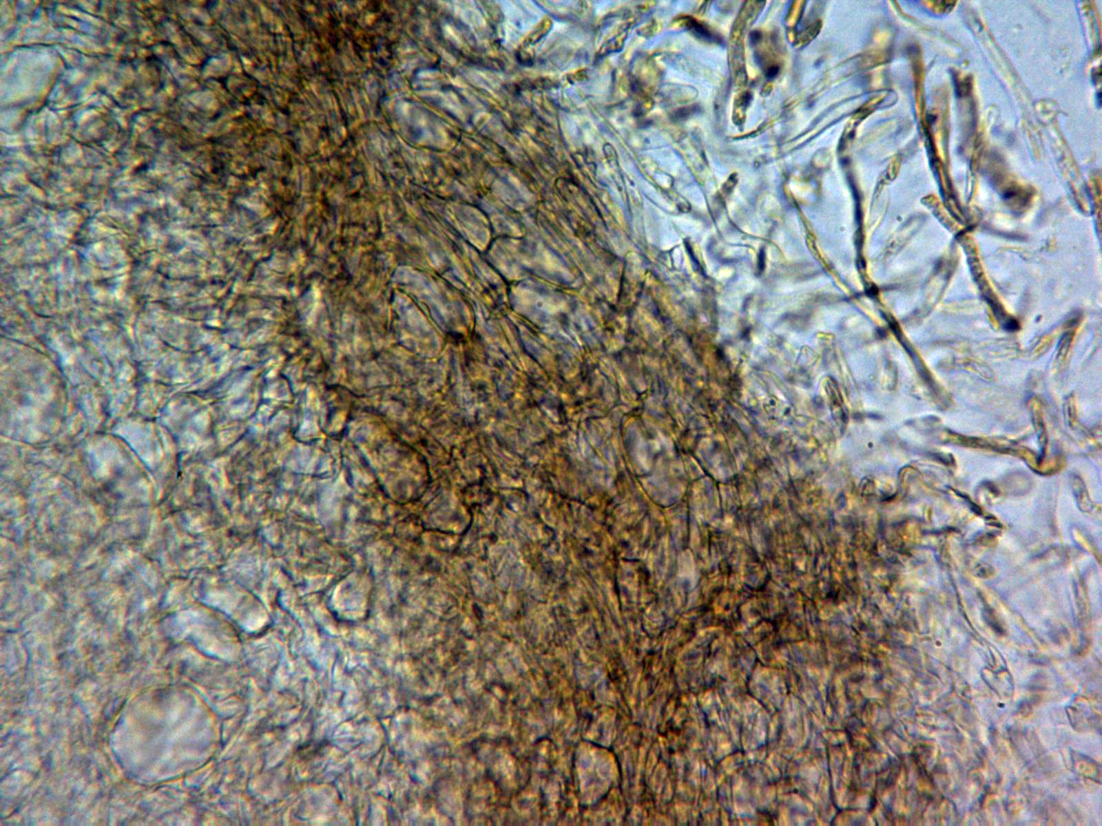 Suprapellis con una capa de hifas muy separadas por gelificación y por debajo de esta unas hifas ya mas anchas con tabiques cortos y pigmento ocráceo en su interior, la sección de la pileipellis a 400 aumentos: