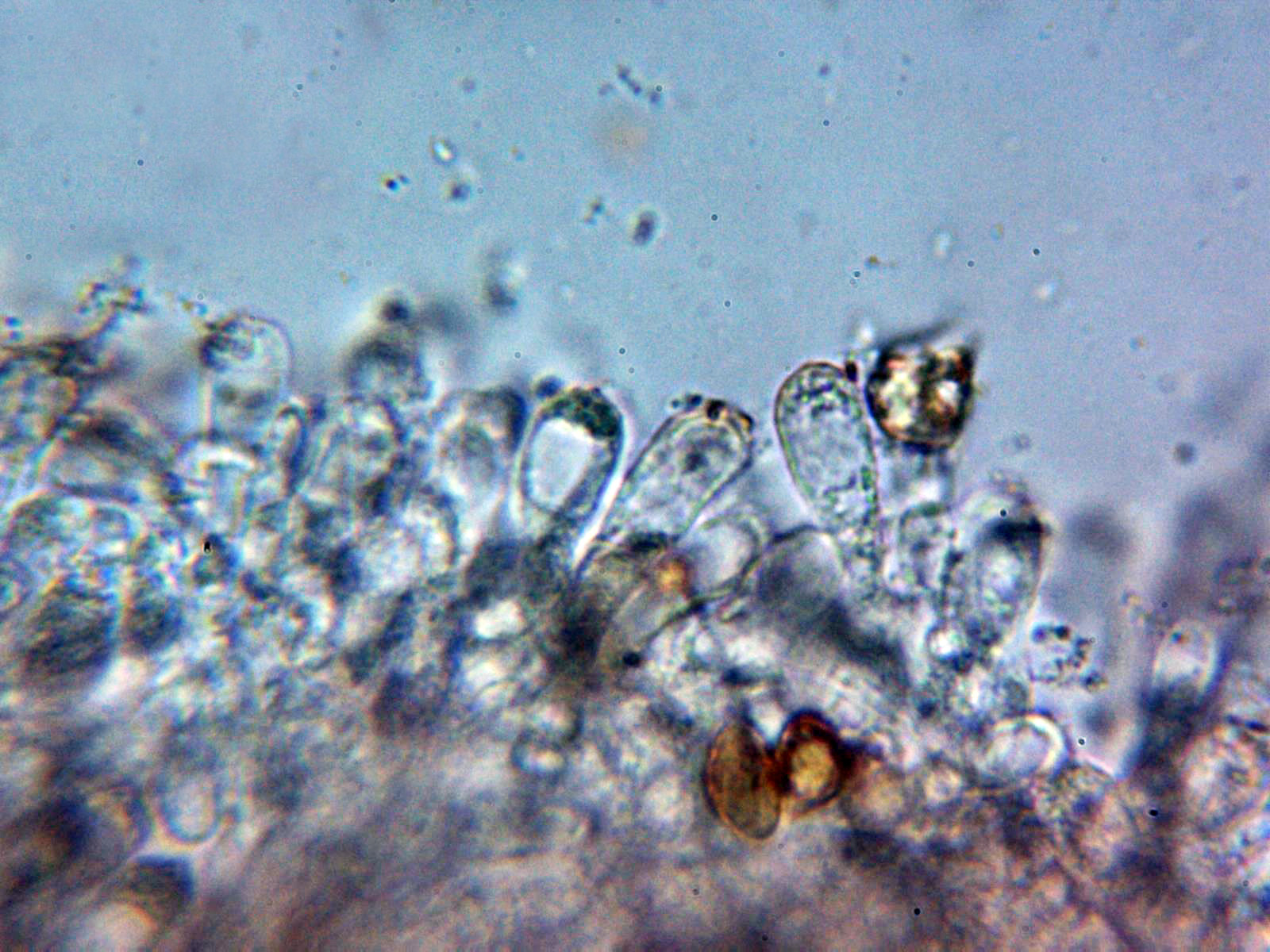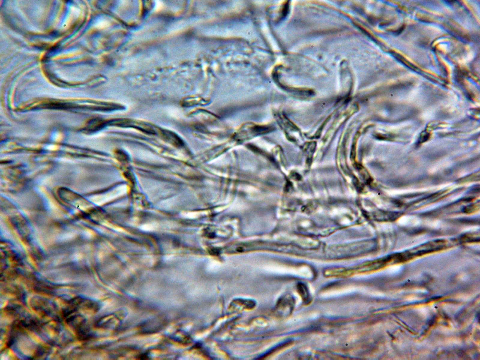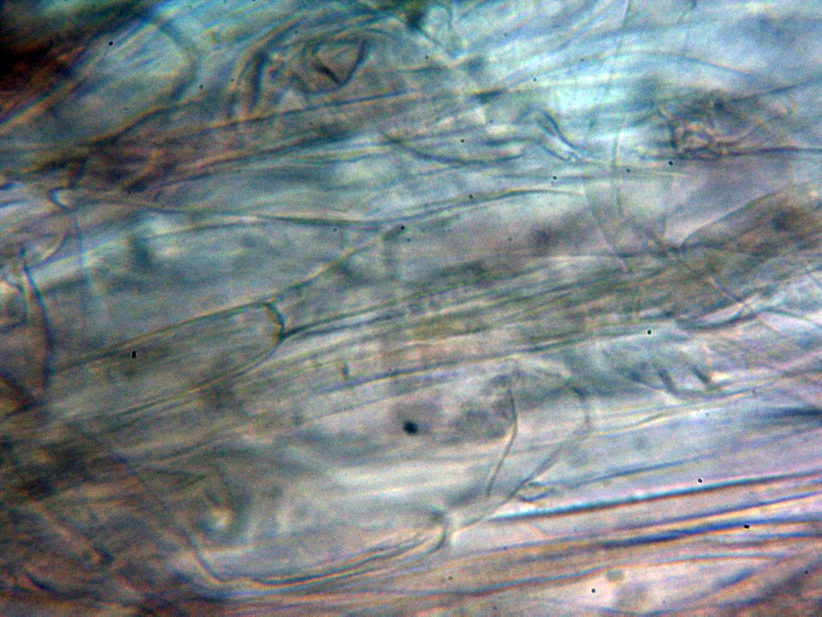 Suprapellis con una capa de hifas muy separadas por gelificación y por debajo de esta unas hifas ya mas anchas con tabiques cortos y pigmento ocráceo en su interior, la sección de la pileipellis a 400 aumentos: