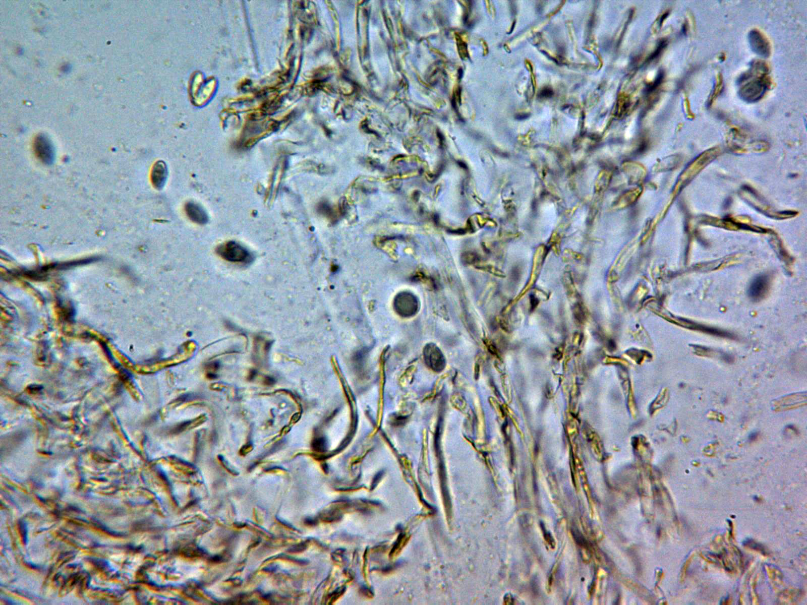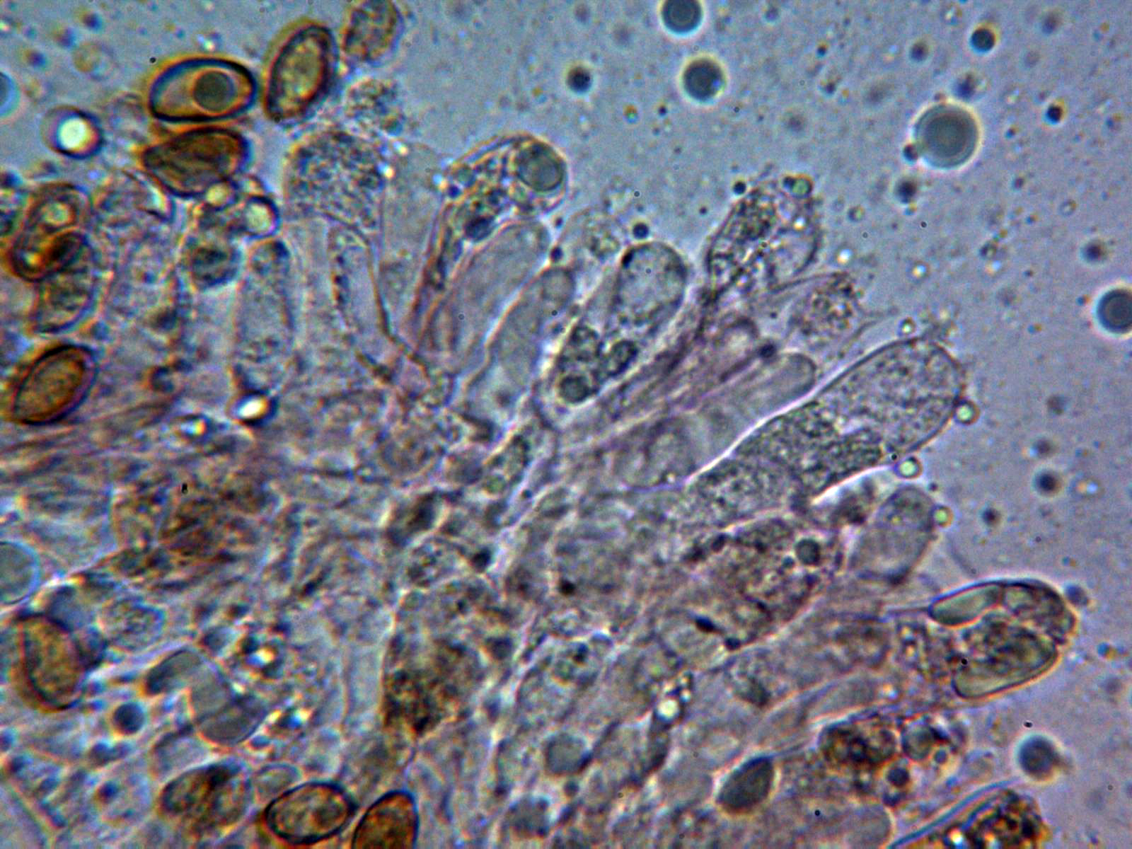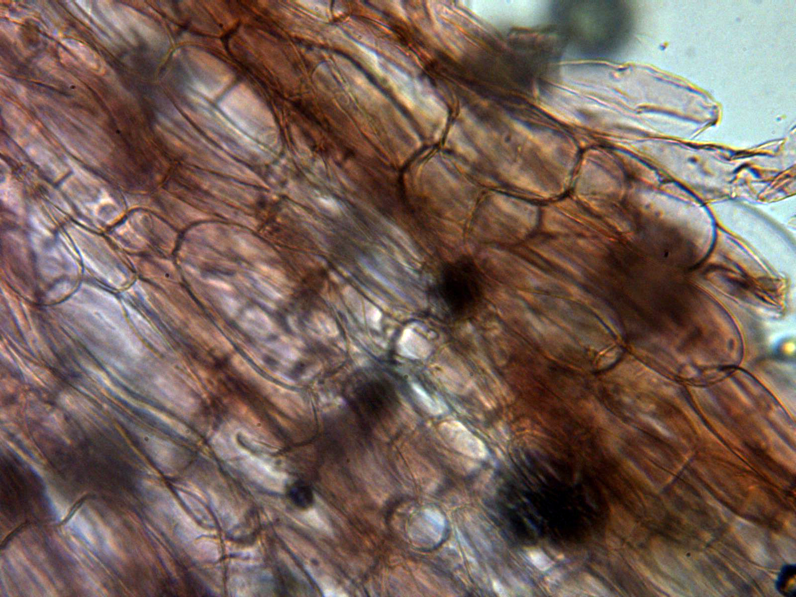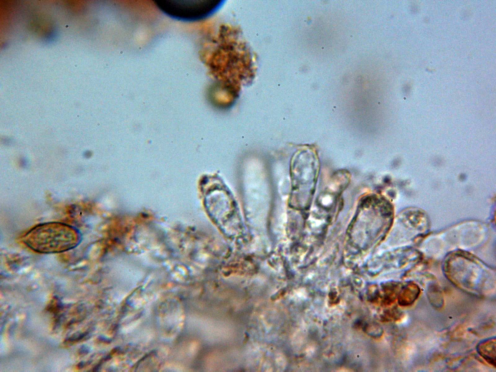 Suprapellis con una capa de hifas muy separadas por gelificación y por debajo de esta unas hifas ya mas anchas con tabiques cortos y pigmento ocráceo en su interior, la sección de la pileipellis a 400 aumentos: