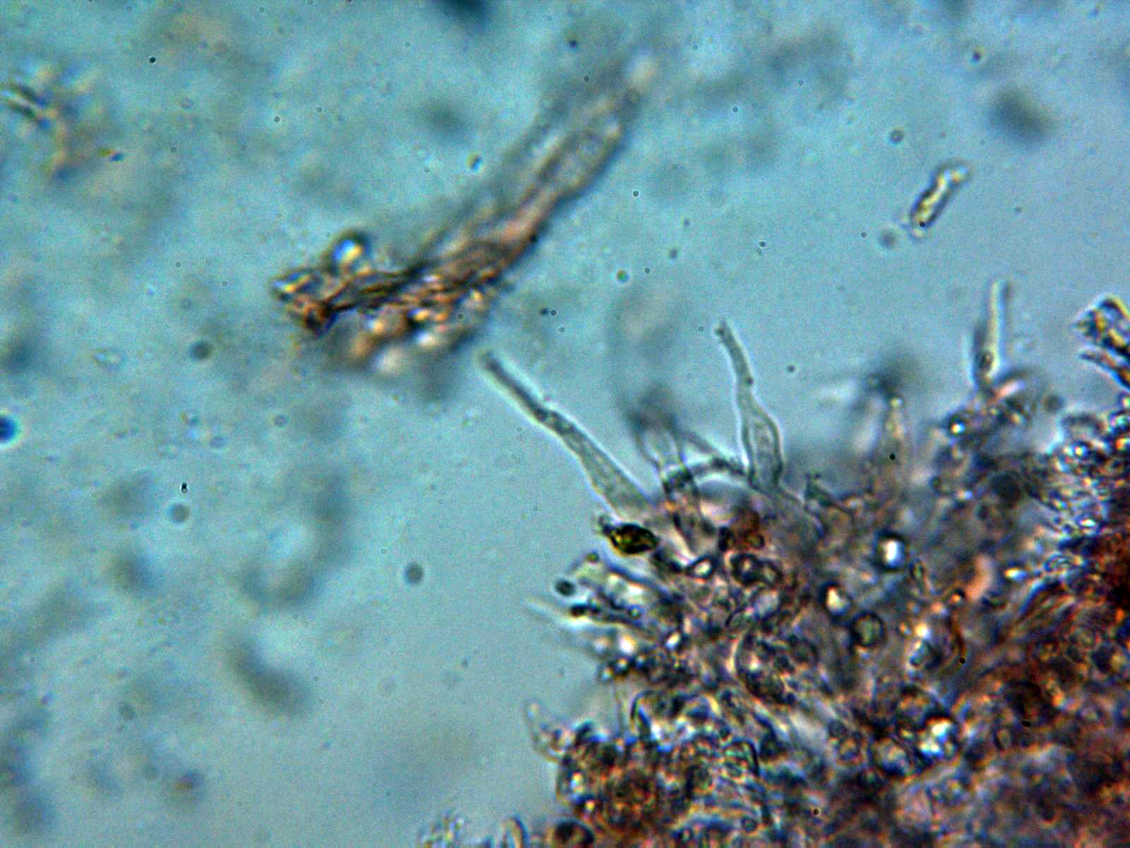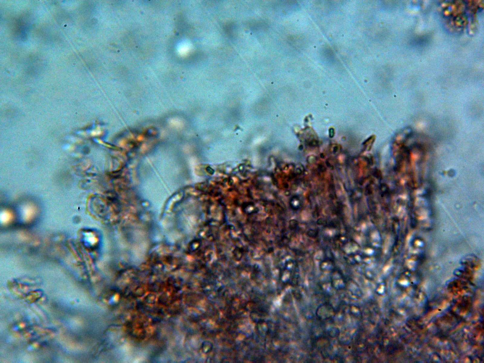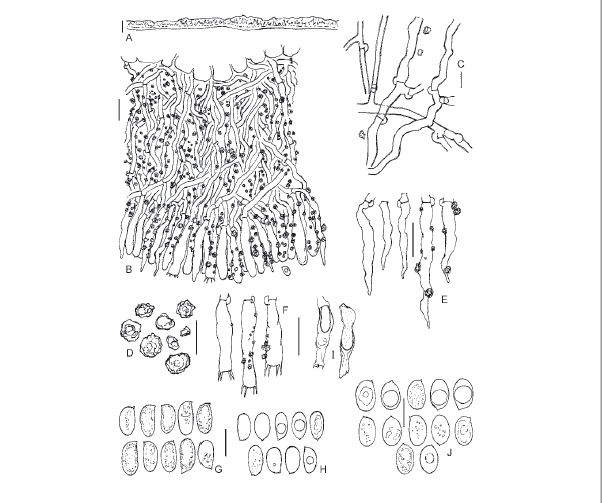 Gracias Juan Andrés, aunque la especie no resulta muy agradecida a la hora de realizarle la microscopía debido a la gran cantidad de cristales que se ven el las muestras, uno hace lo que buenamente puede, añado un dibujo de la microscopía del Lyomyces juniperi, extraída del documento "Hyphodontia juniperi (Basidiomycota) newly recorded from China" de Eugene Yurchenko (2013), donde la presencia de estos cristales es muy patente.