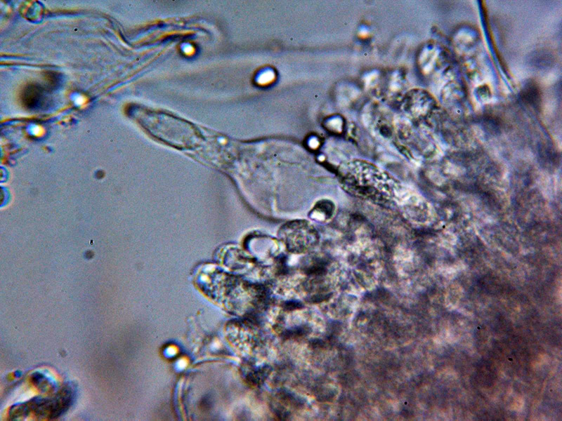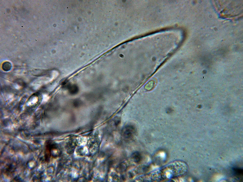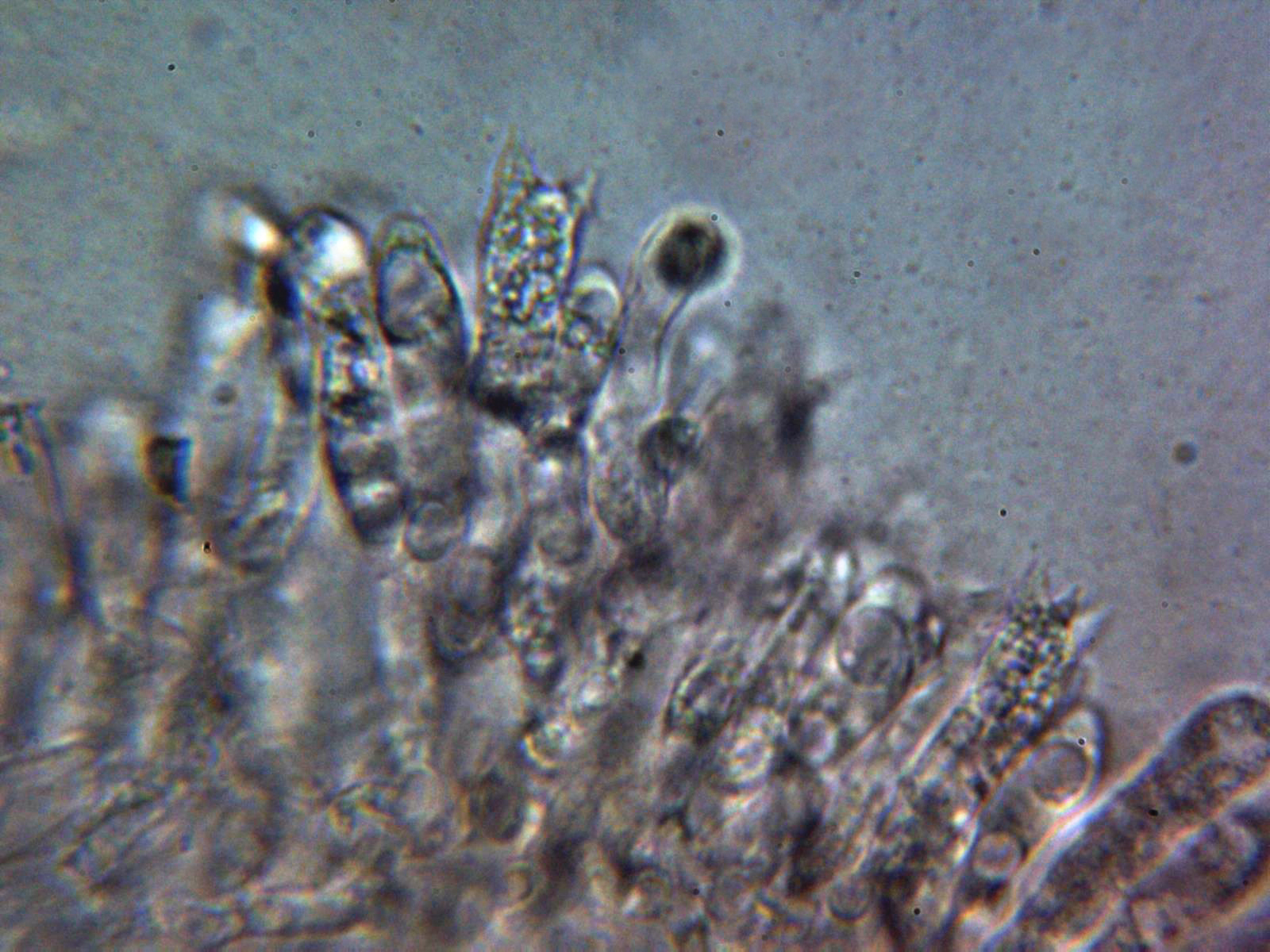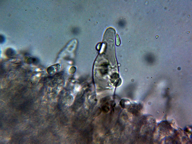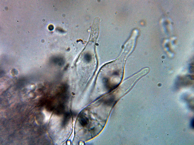 Queilocistidios entre fusiformes y lageniformes, algunos con un largo cuello sinuoso, con tenue pigmento oscuro en su interior y unas medidas de 48.5 – 60.2 × 12.7 – 16.2 µm.