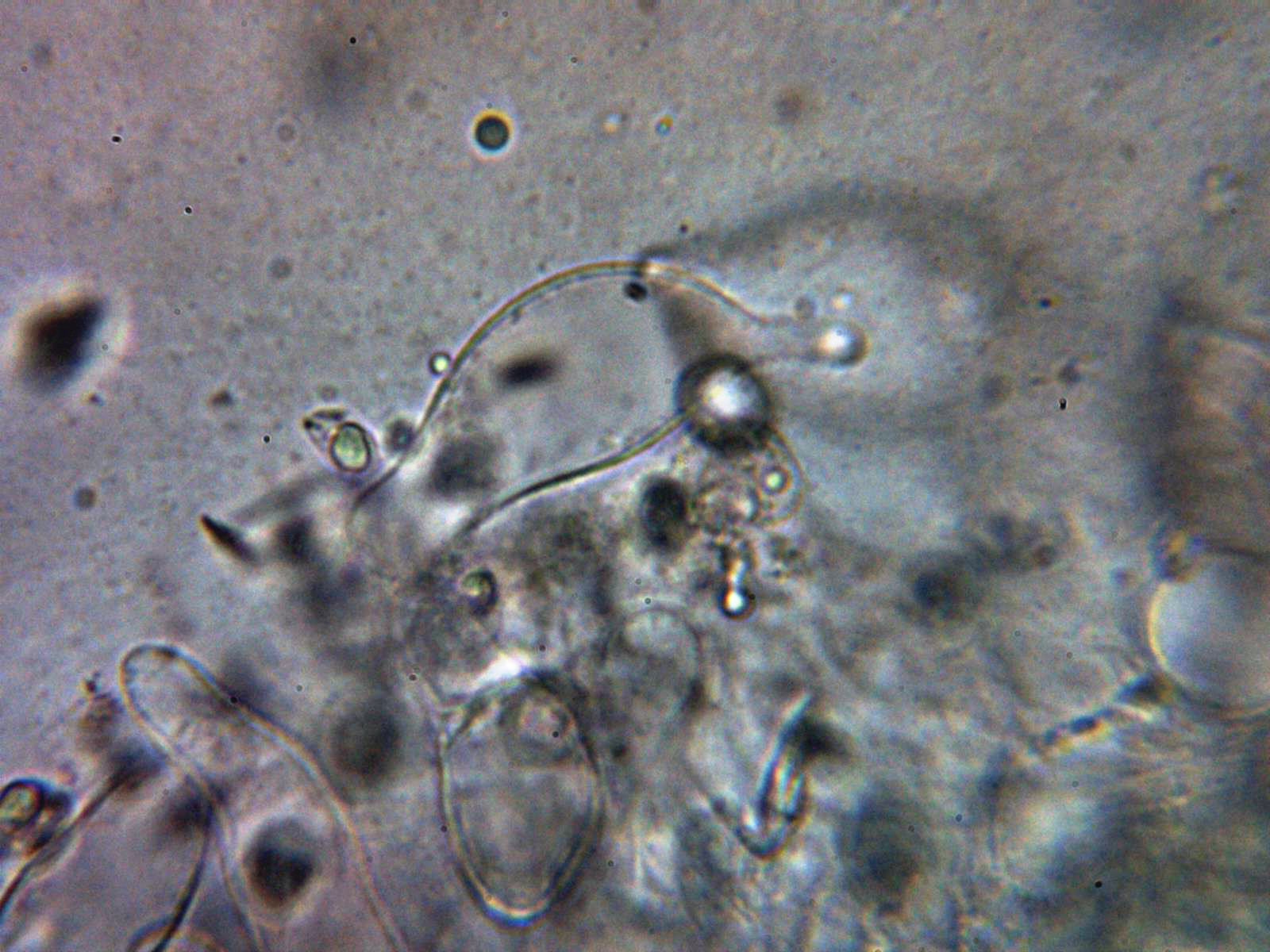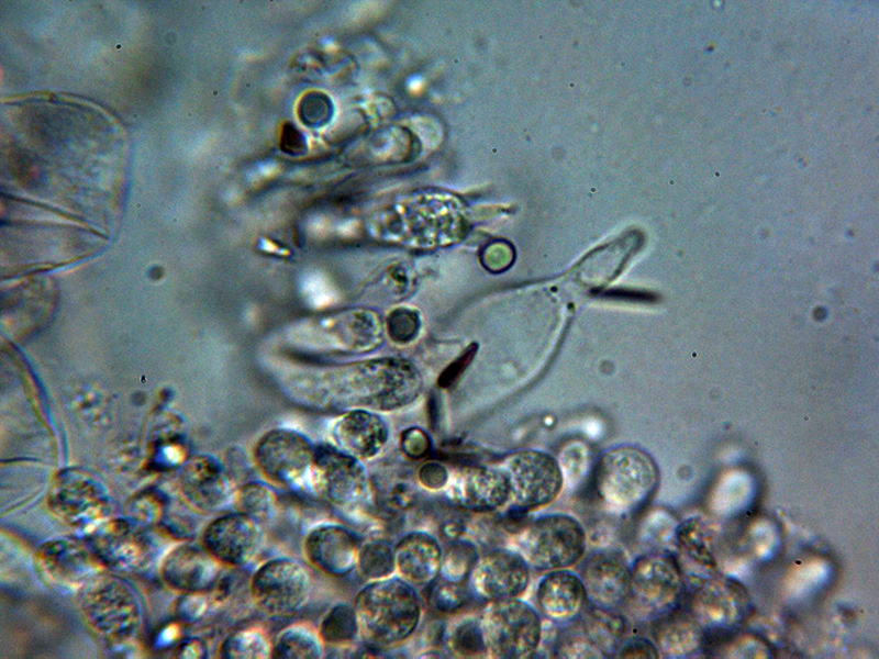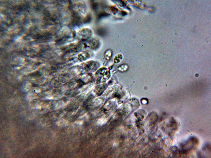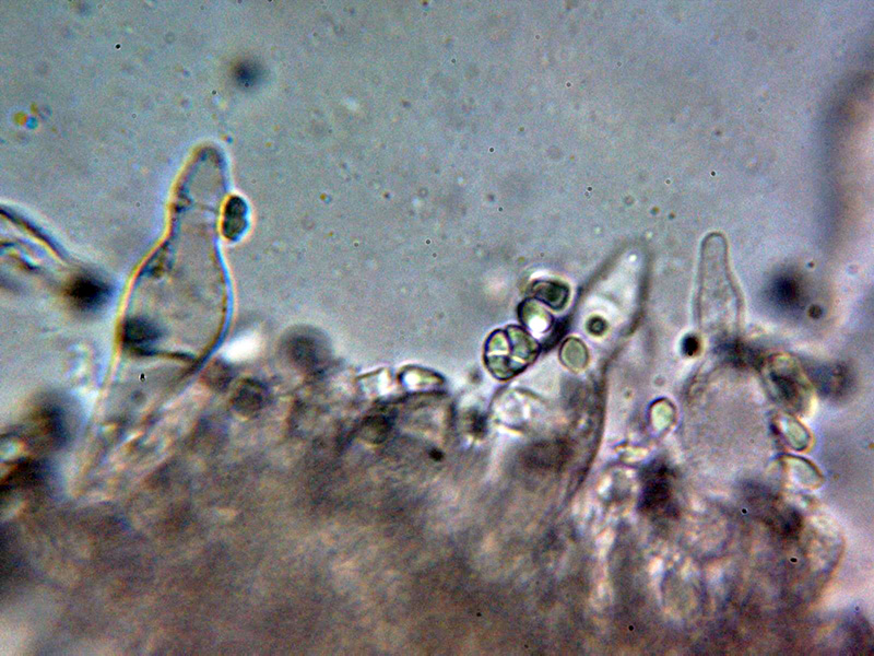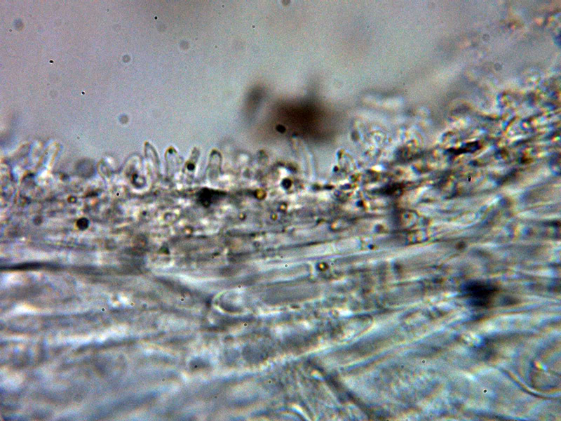 Queilocistidios entre fusiformes y lageniformes, algunos con un largo cuello sinuoso, con tenue pigmento oscuro en su interior y unas medidas de 48.5 – 60.2 × 12.7 – 16.2 µm.