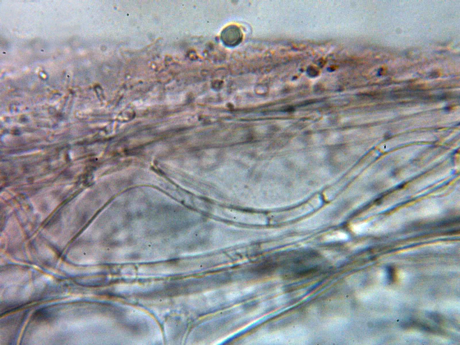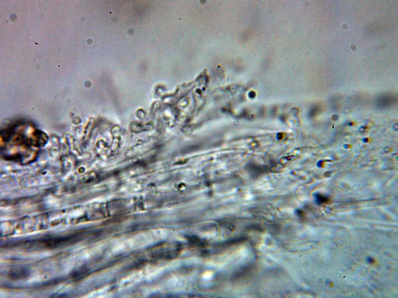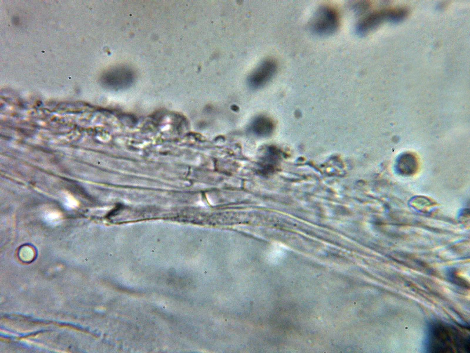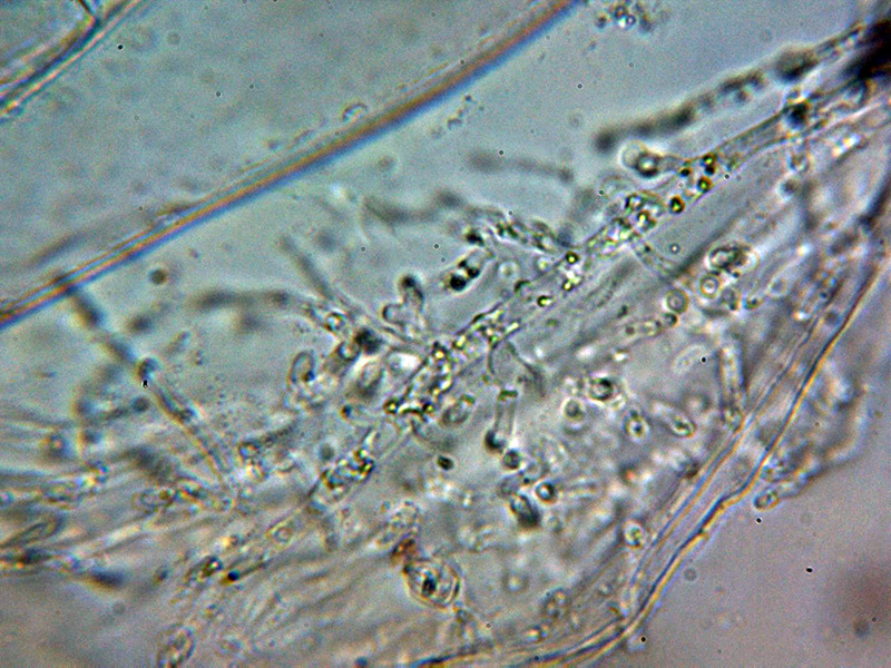 Hifas de la suprapellis con una anchura de 3 y hasta poco más de 4 micras, con abundantes excrecencias a modo de digitaciones y terminaciones bastante ramificadas, separadas por gelificación.