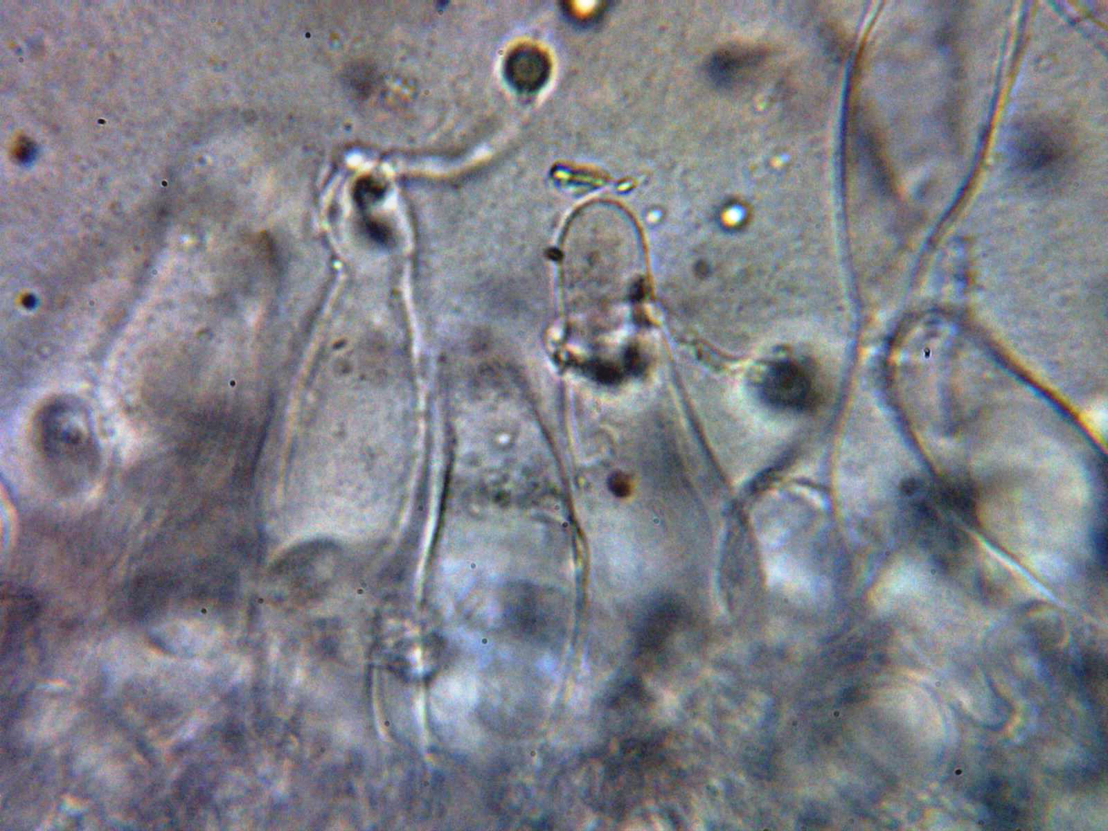 Los queilocistidios hialinos, ventrudos y algunos terminando en un cuello estrecho: