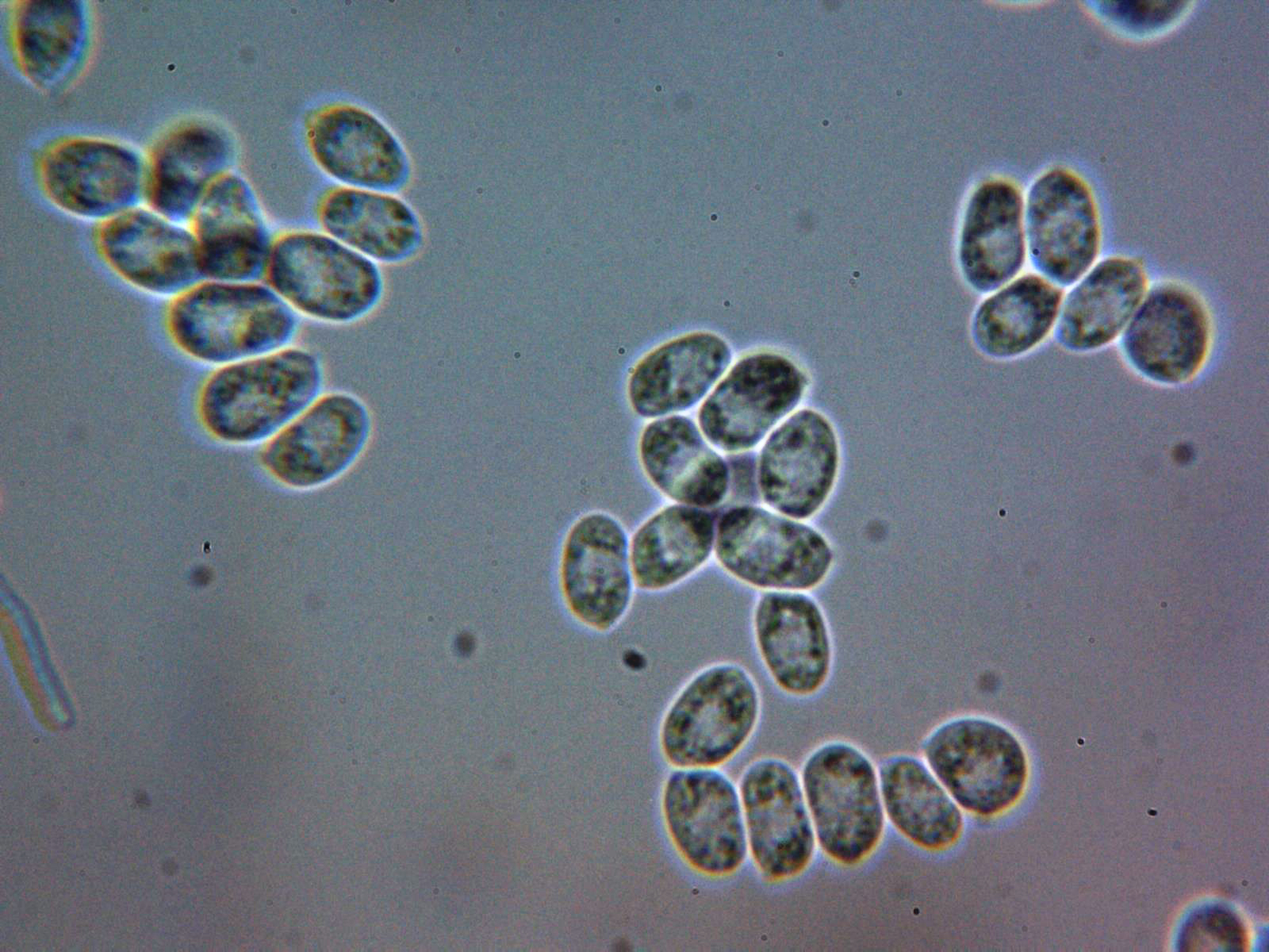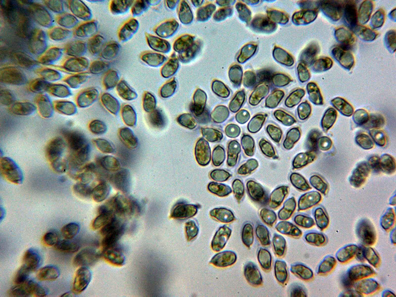 Esporas elipsoidales con apícula algo descentrada, pared fina y contenido granuloso en su interior, claramente amiloides en Reactivo de Melzer y con unas medidas en agua de: