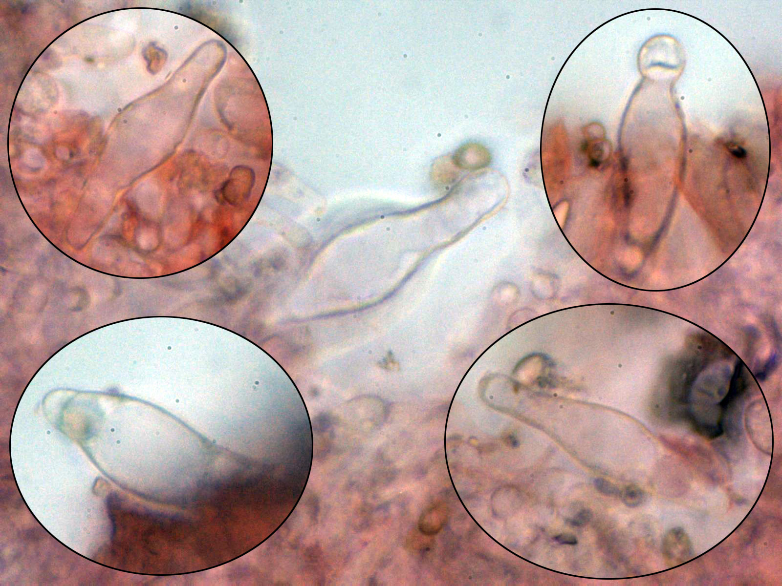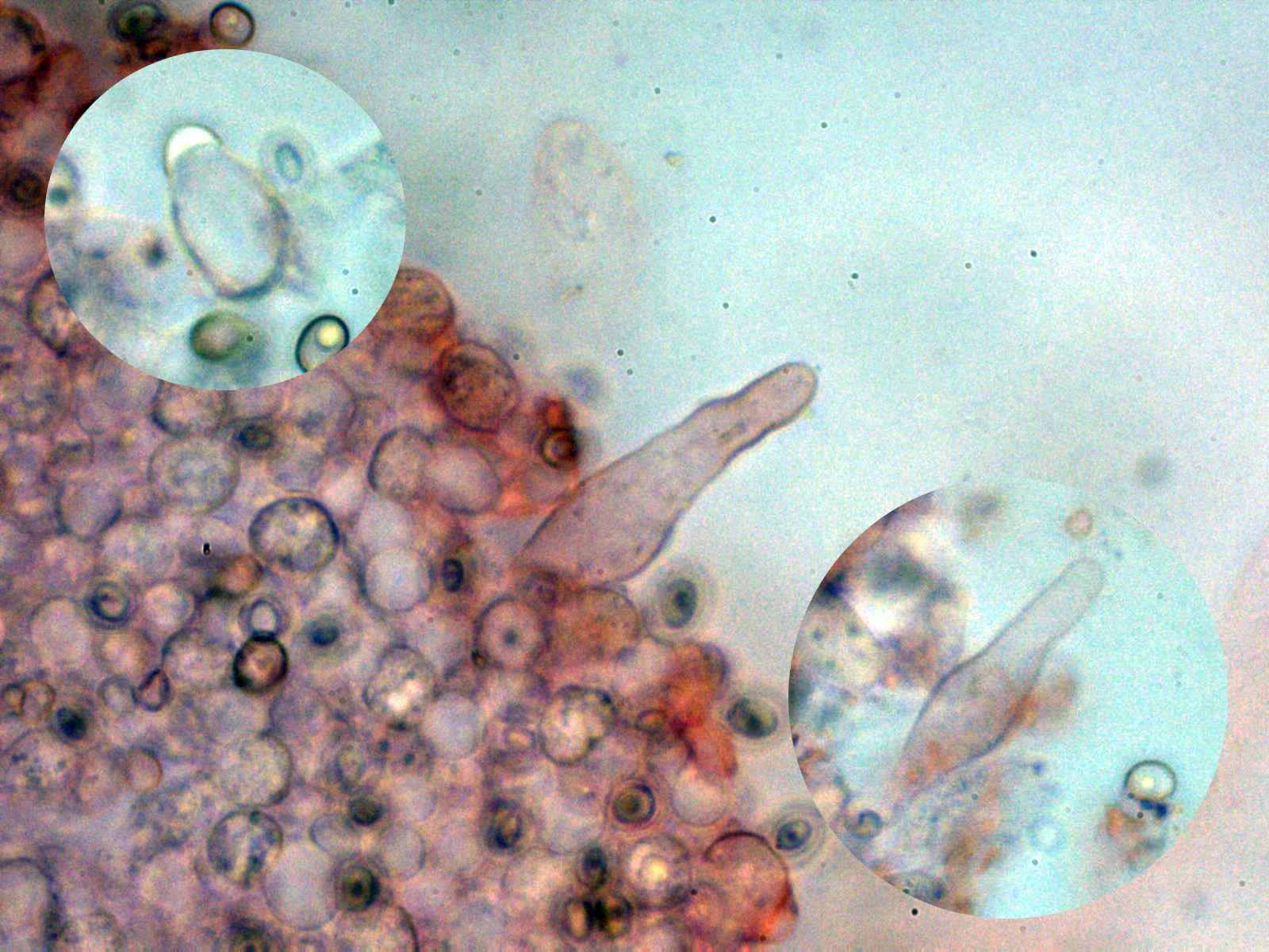 Un cistidio y a su lado un par de basidios tetraspóricos.