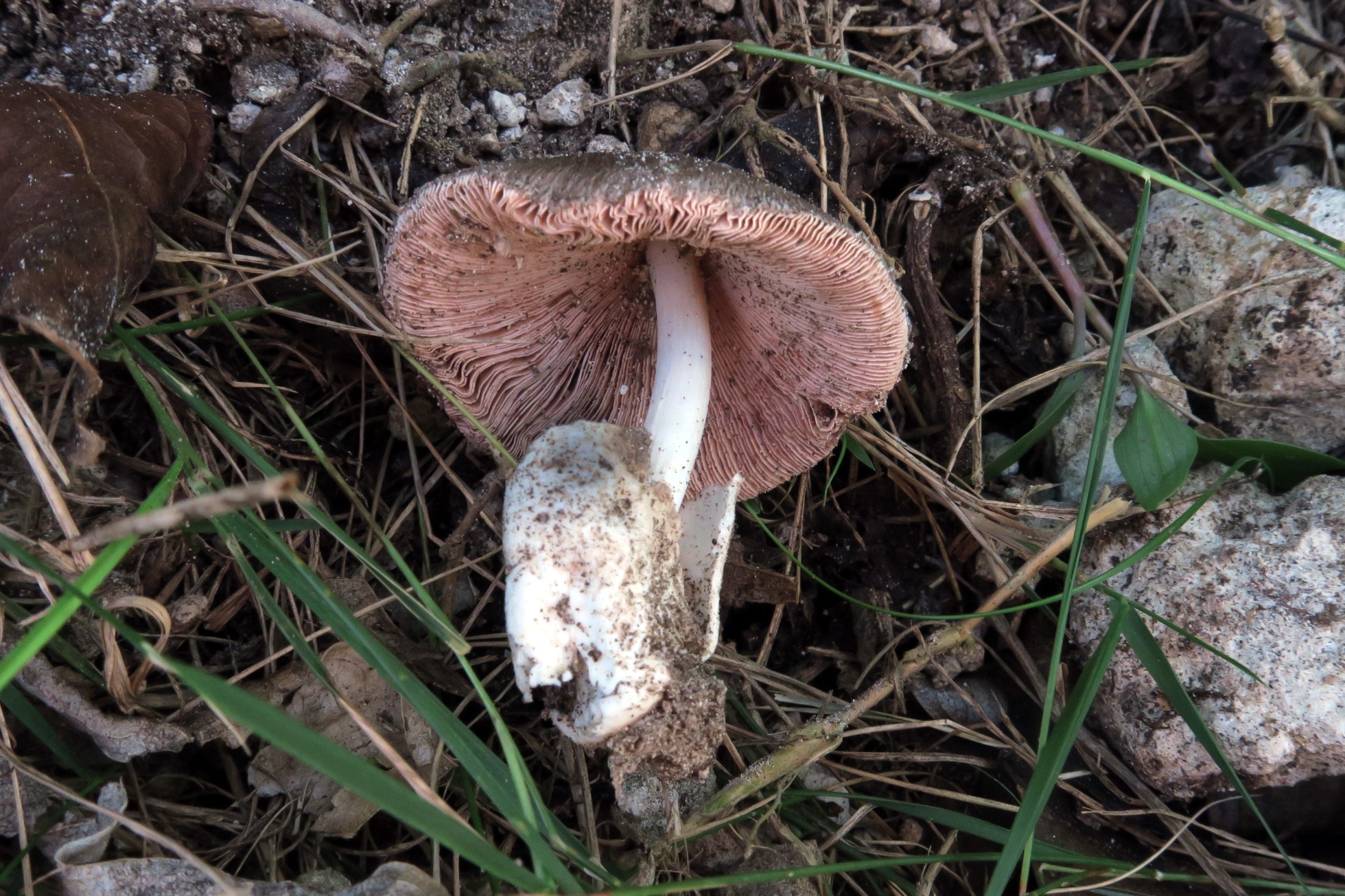 Con una prominente volva blanquecina con el borde grisáceo.