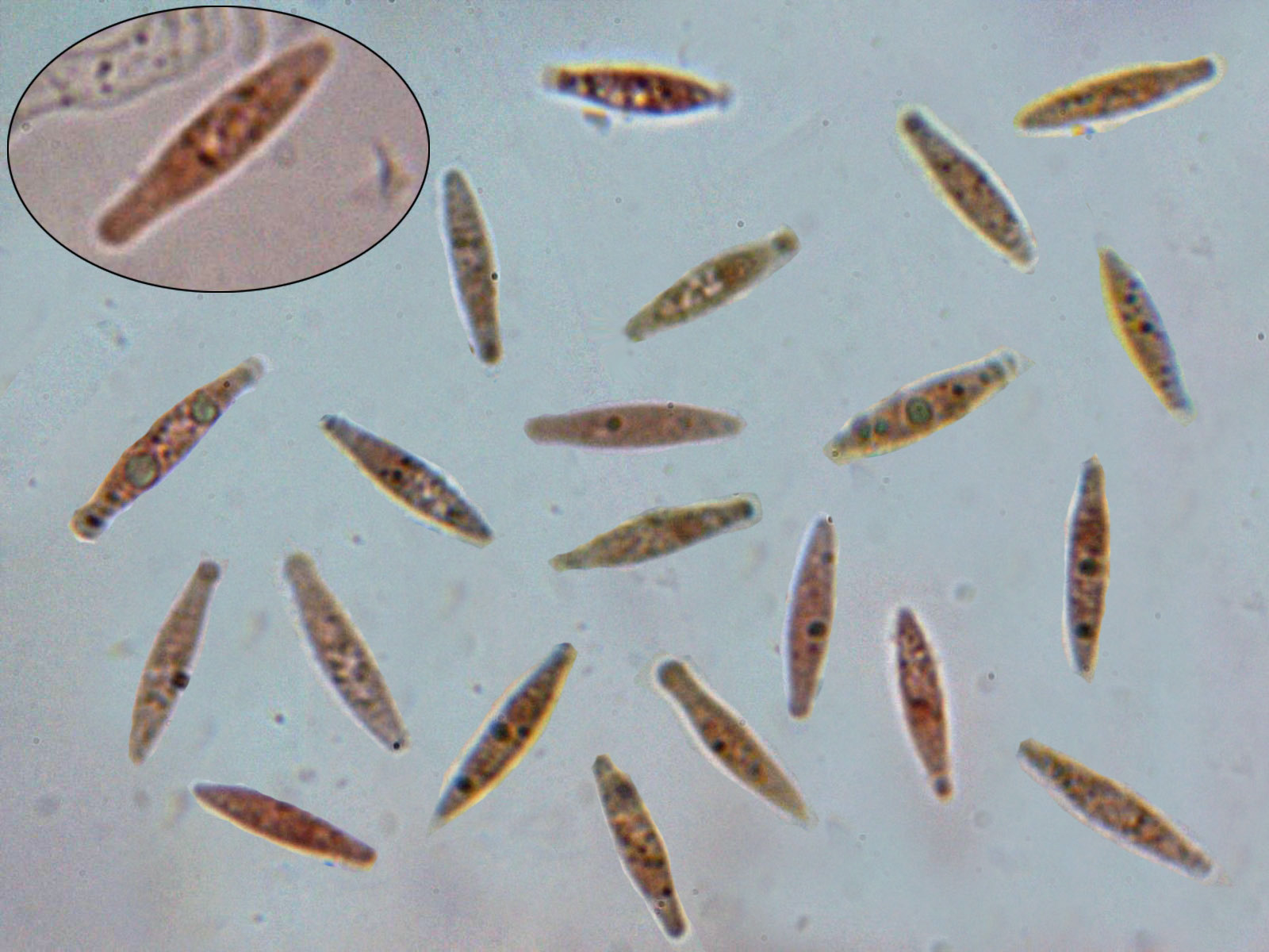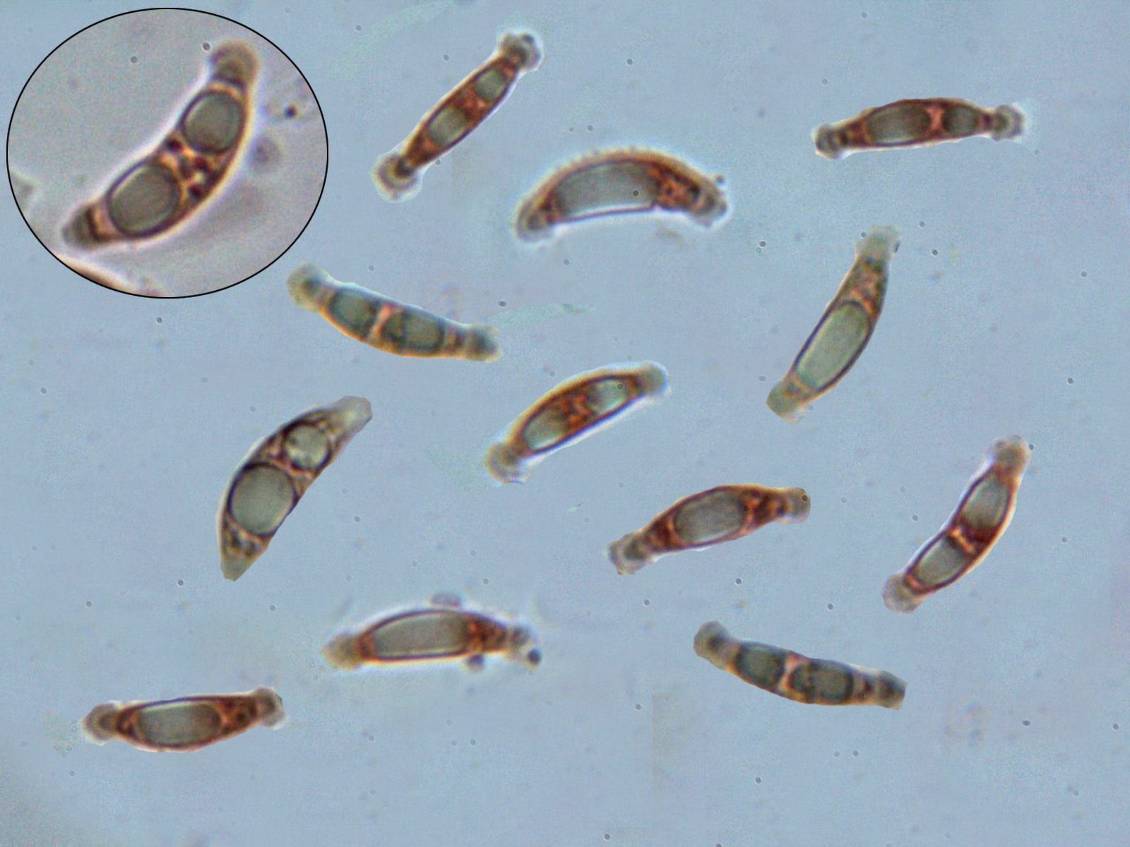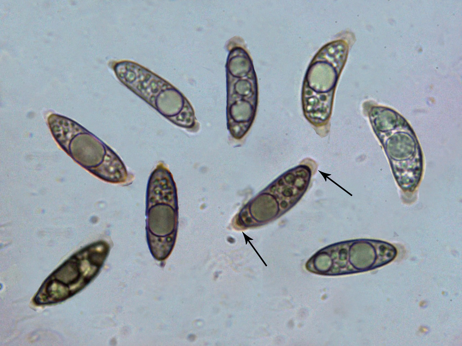 Estas esporas al igual que las anteriores con una vaina mucosa en cada extremo y con unas medidas de: